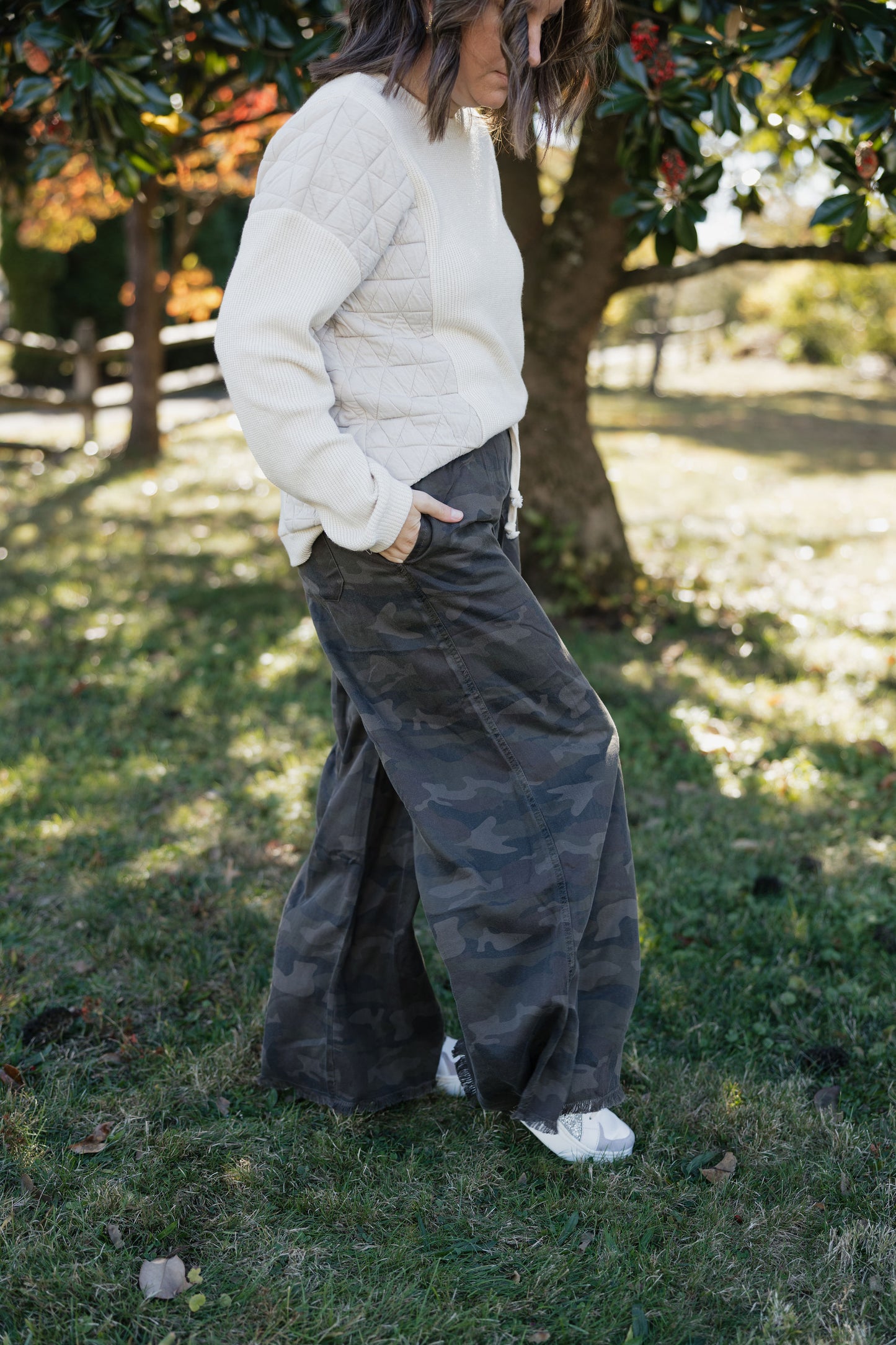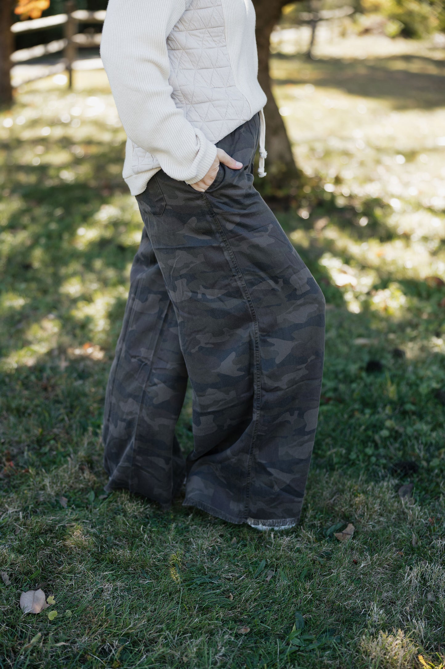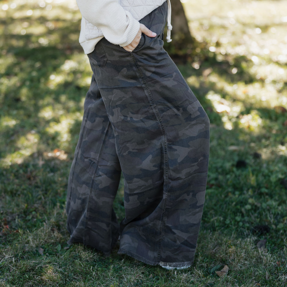Rock a laid-back vibe in these cozy camo pants that blend comfort with style. Featuring a flexible drawstring and elastic waistband, they'll hug you just right while deep pockets keep your essentials close. The playful frayed hem adds personality to your casual look, whether you're dashing around town or lounging at home. Soft fabric means you'll want to live in them.