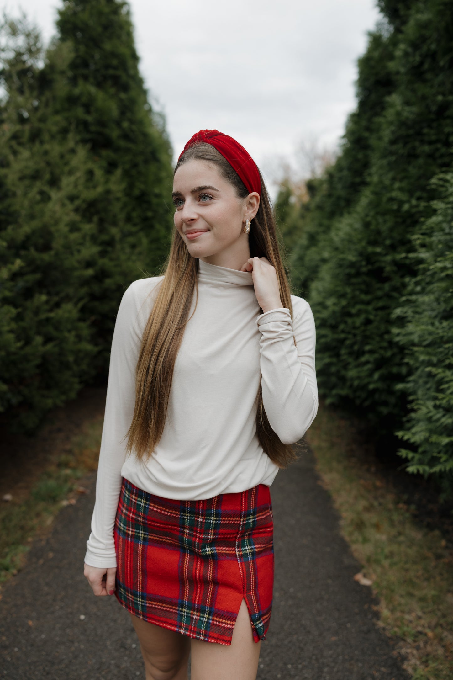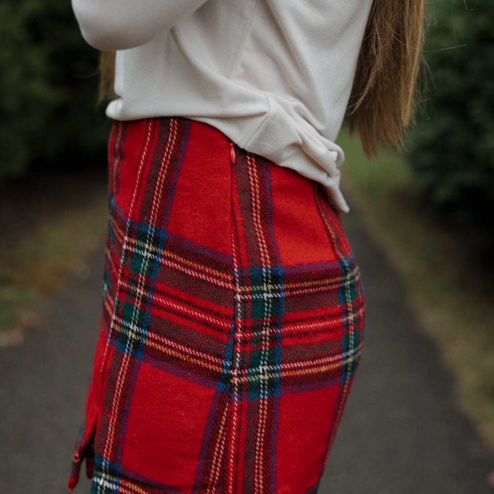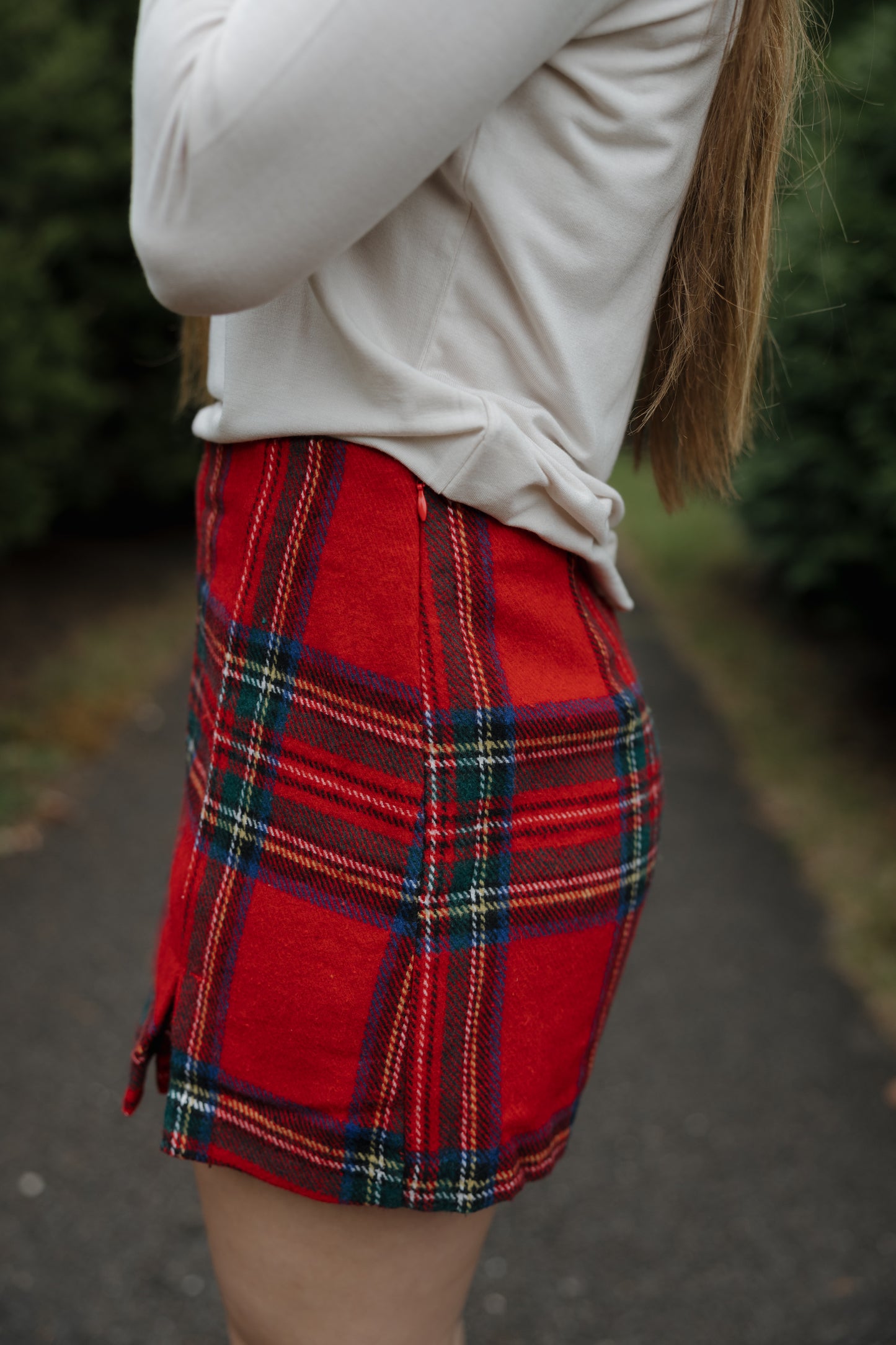 Step into festive fun with the Hallmark Movie Plaid Skort! This playful tweed skort features a charming Christmas plaid pattern and a front slit that adds just the right hint of flirty style. With built-in shorts underneath, you get all the comfort and confidence to celebrate the season joyfully. Perfect for holiday gatherings or cozy winter outings, it’s your go-to piece for effortless, merry chic. Side zip and shorts in back. Pair with tall boots or tights and a chunky sweater and your holiday style is set!