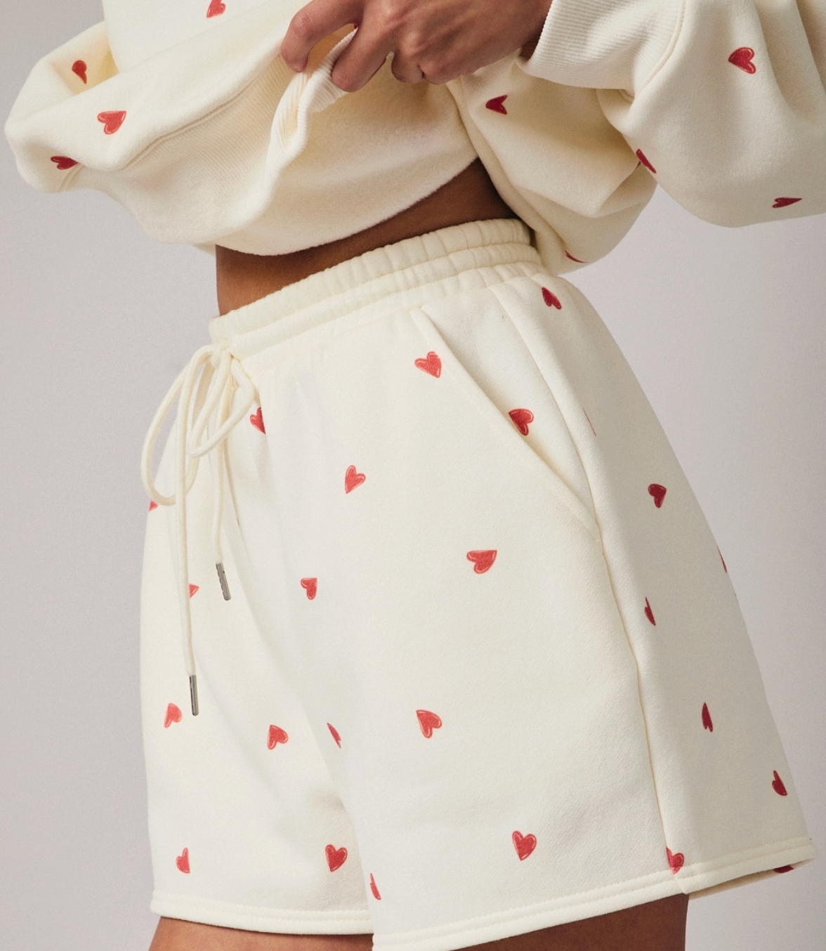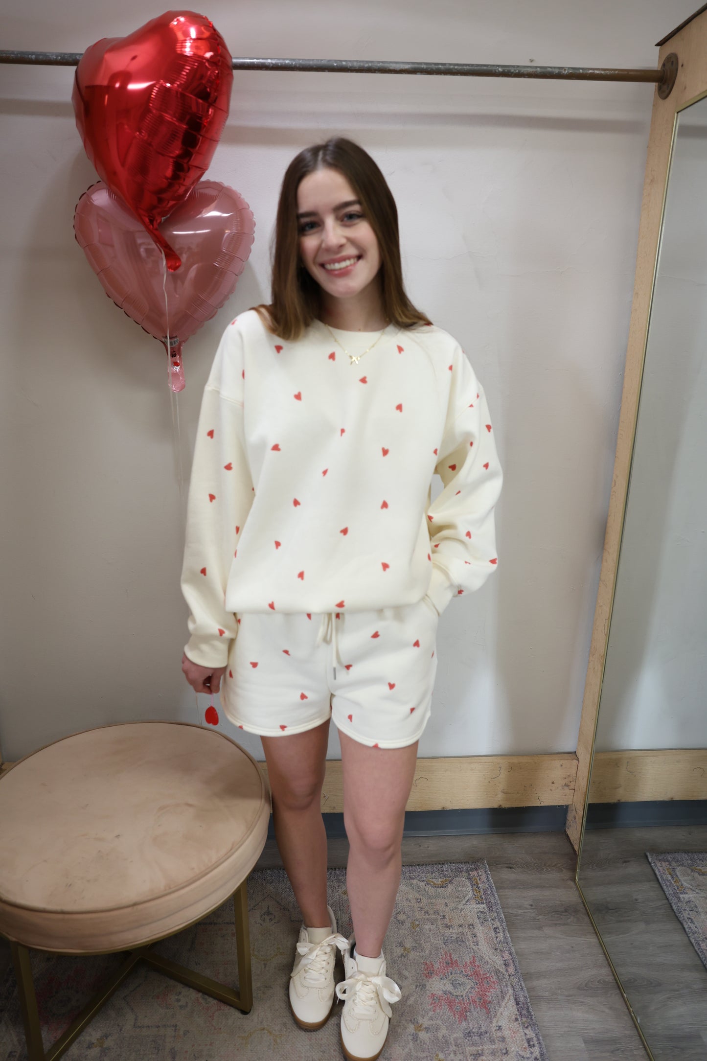 Cozy up with these cream sweatshorts adorned with charming red hearts. The soft, relaxed fit is ideal for lounging, running errands, or embracing your most carefree self. Pair with our Love Me Tender Sweatshirt!