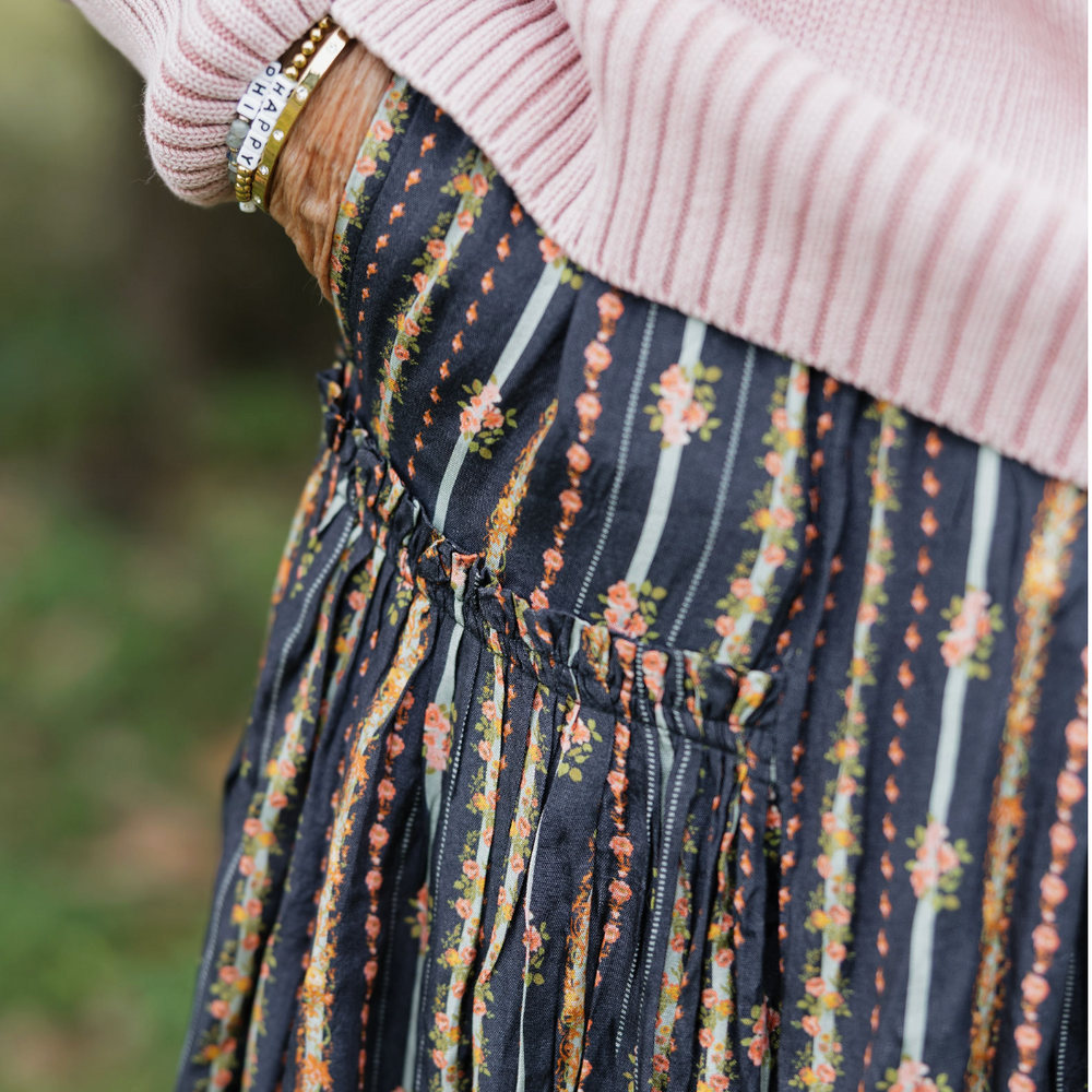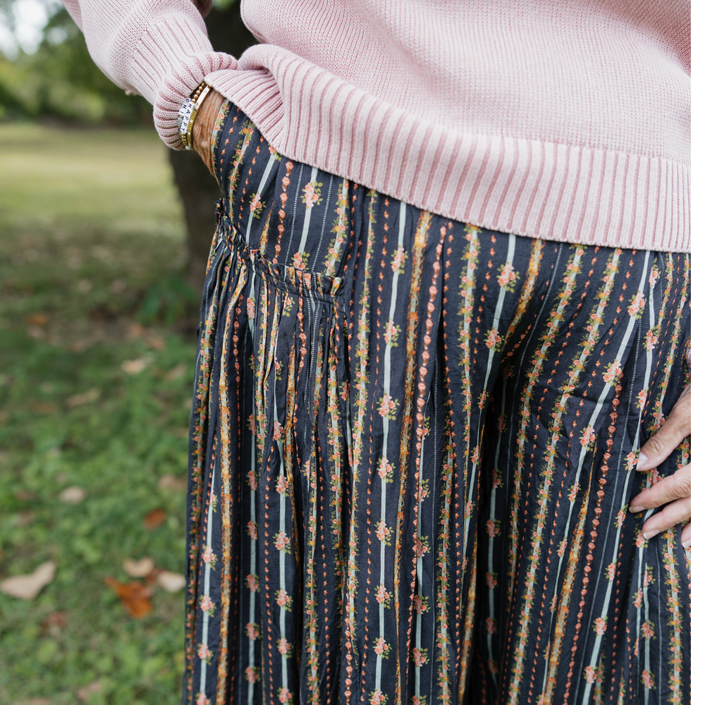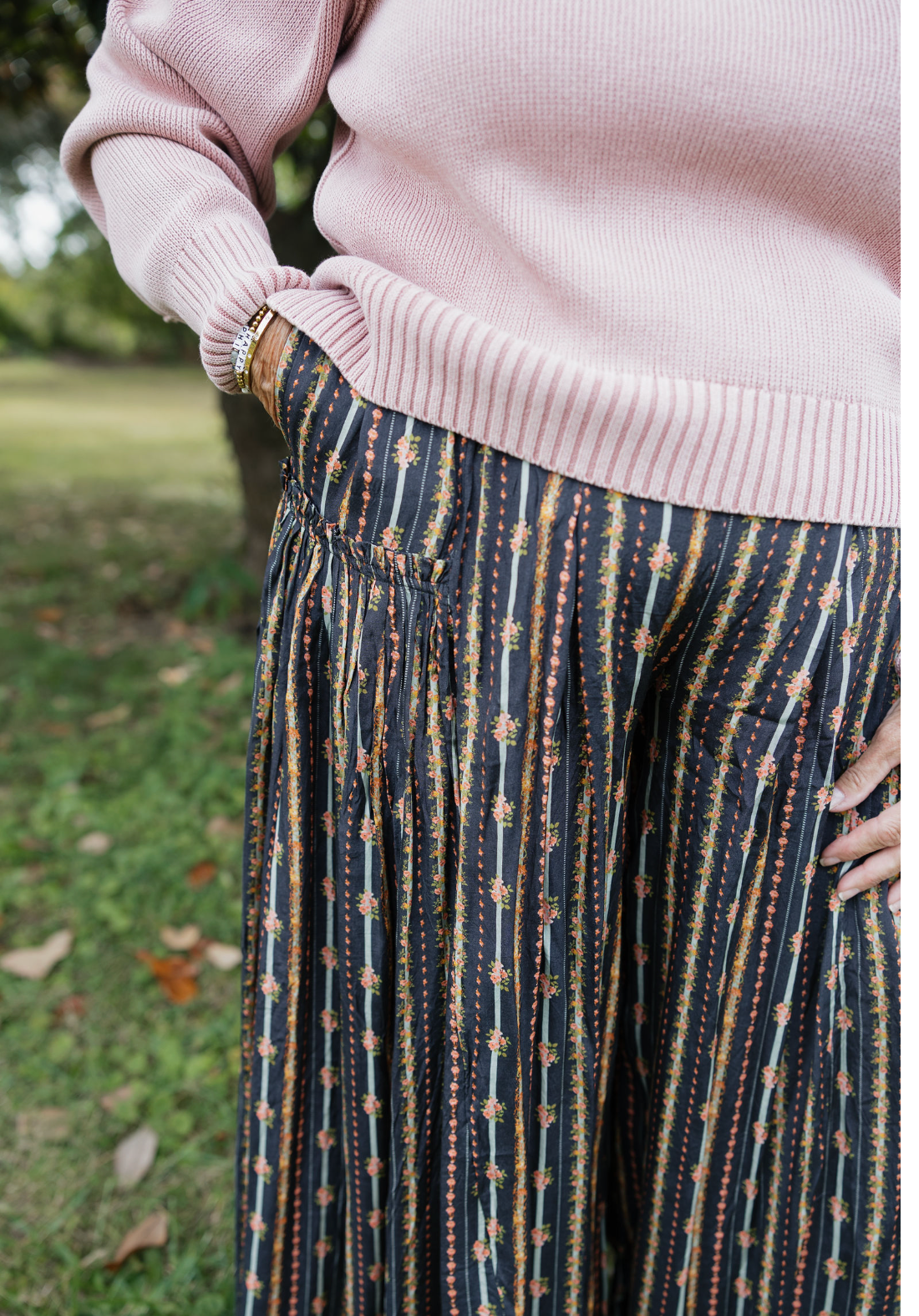 These comfy pants feature a navy base with a floral and striped design, offering an ultra-wide leg cut and a silky, smooth feel for all-day comfort.