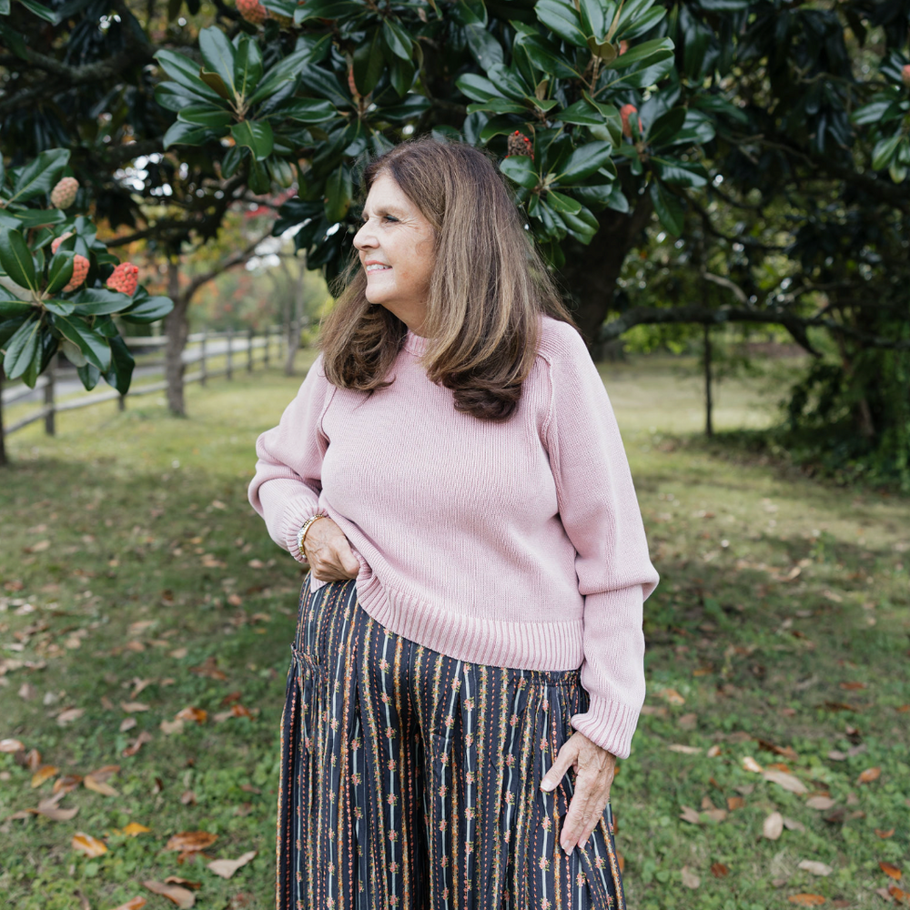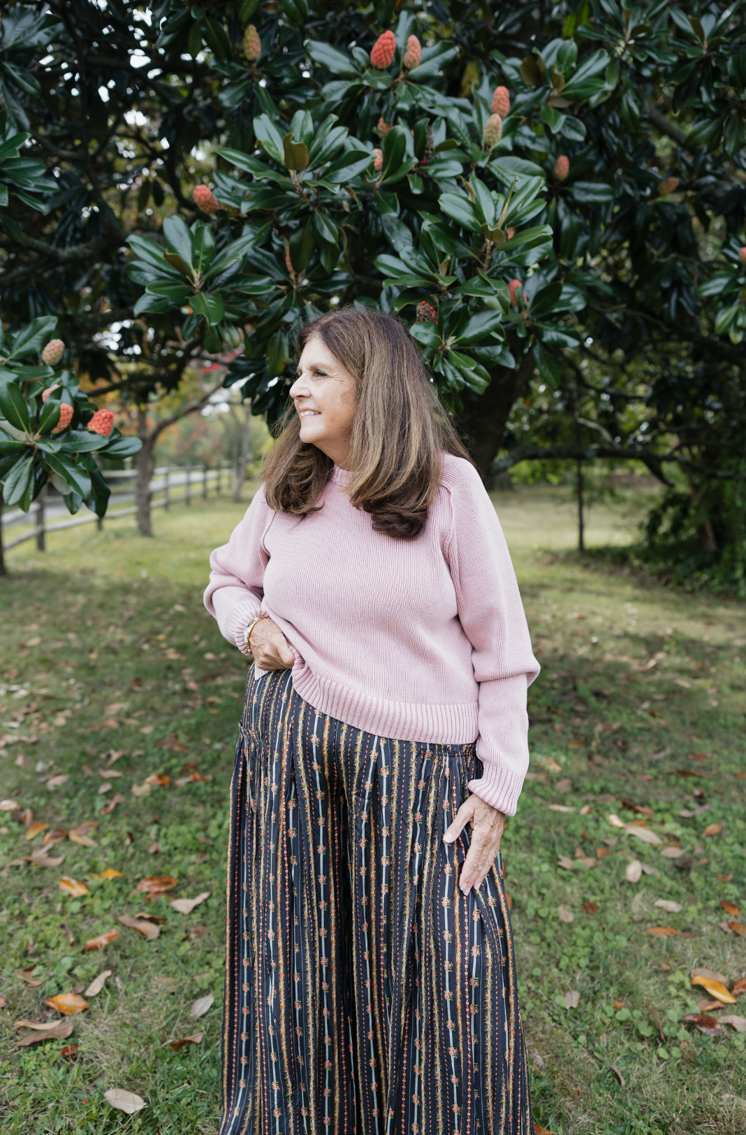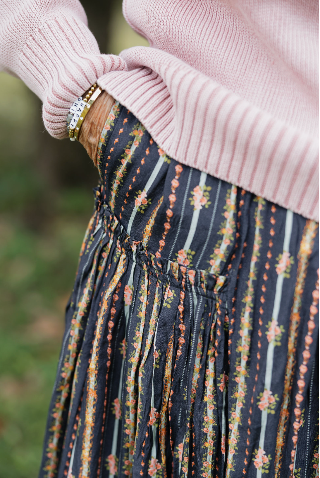 These comfy pants feature a navy base with a floral and striped design, offering an ultra-wide leg cut and a silky, smooth feel for all-day comfort.
