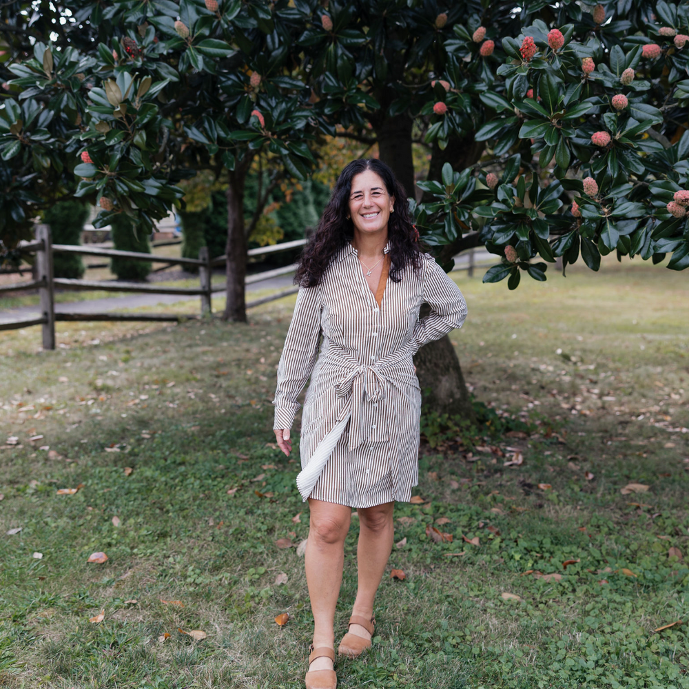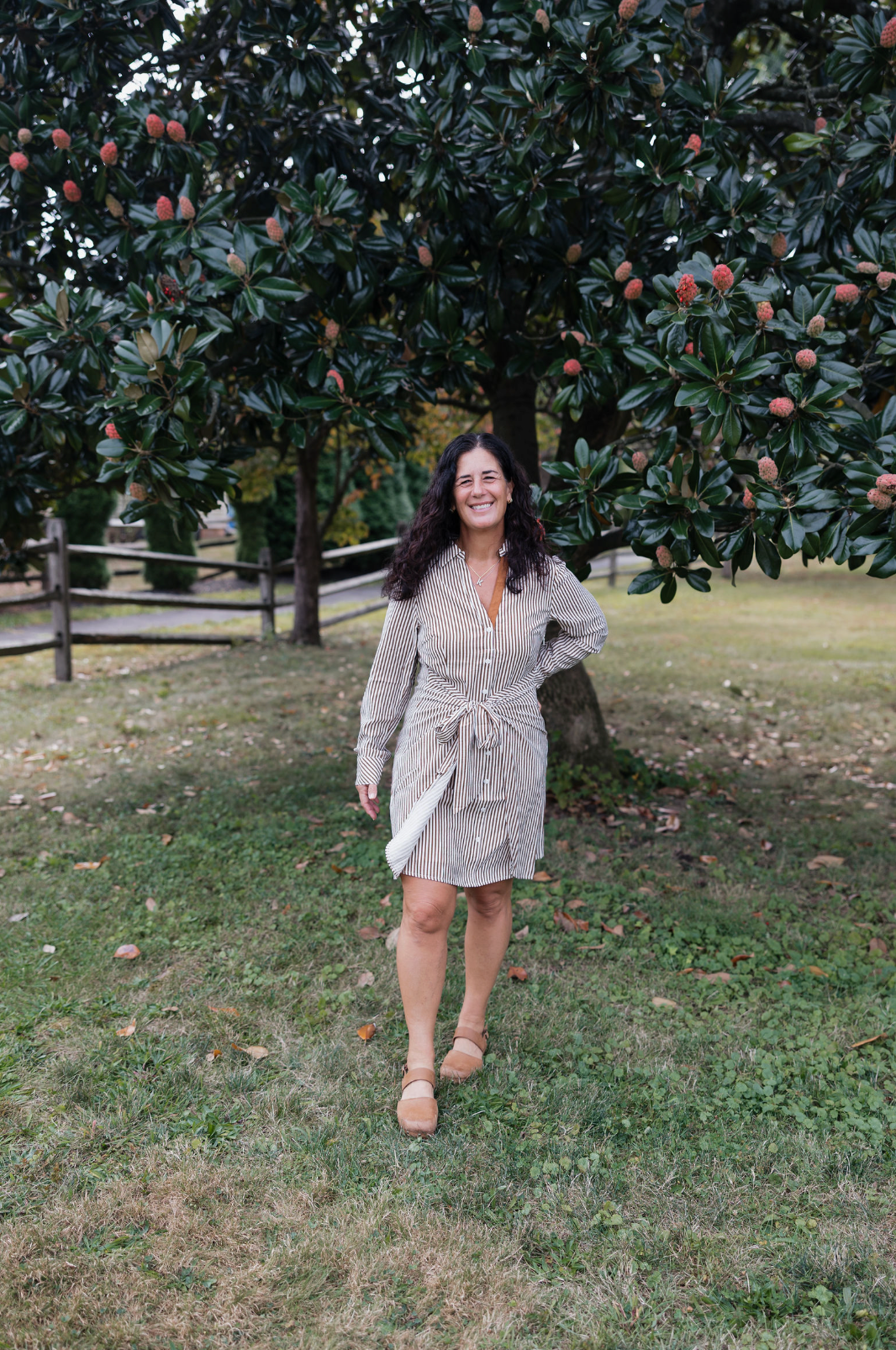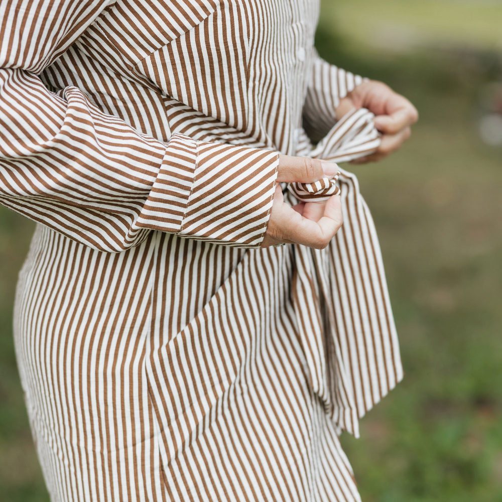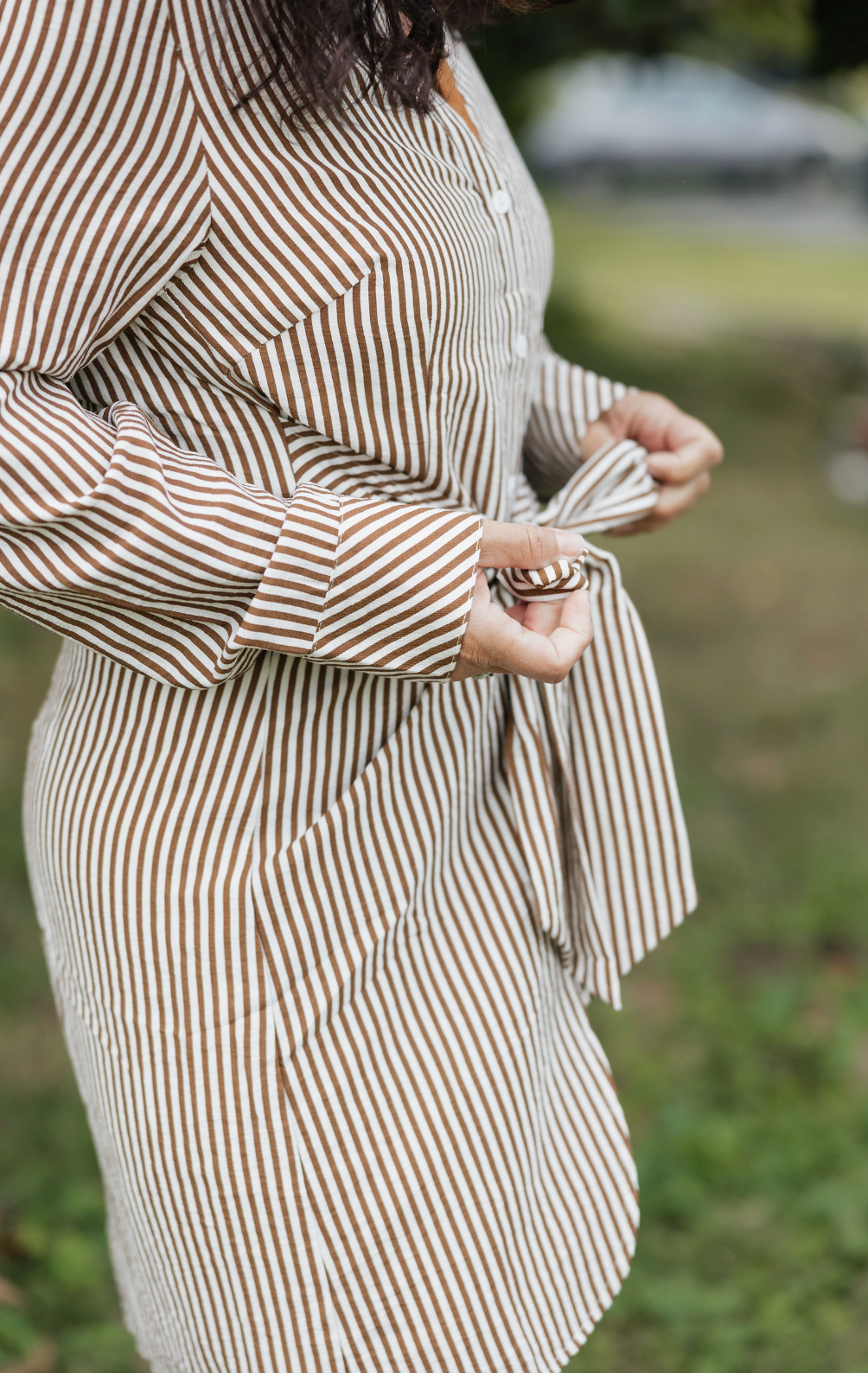 What a stunning piece for your closet. Pin striped ivory and warm brown button up shirt dress with a front tie/skirt to create the most flattering silhouette. Collar and faux suded trim at the v-neck. Fully lined. Knee length so perfect to wear with tall or low boots, ballet slippers, mules or sneakers. Add a long cardigan for a complete look.