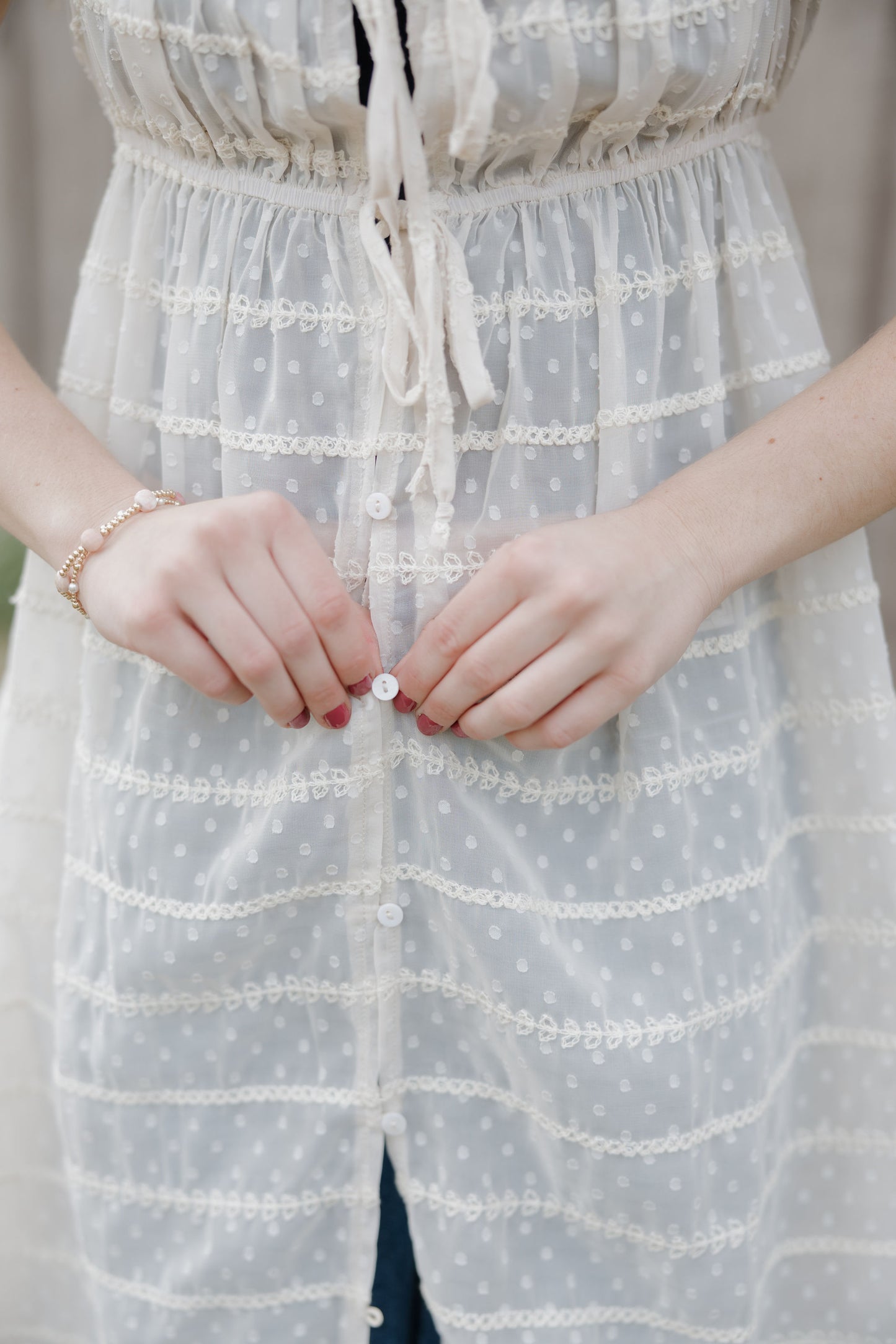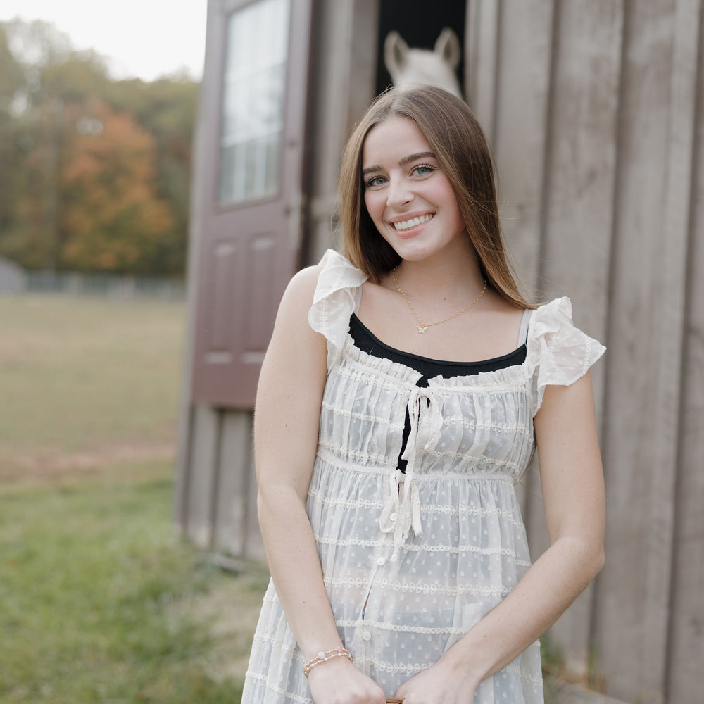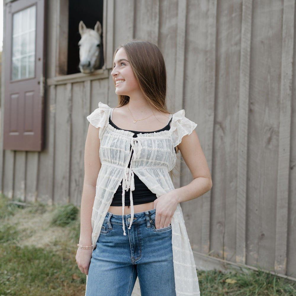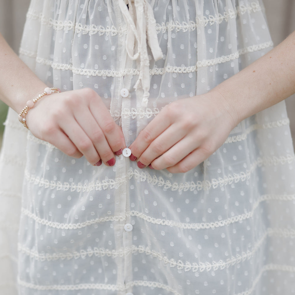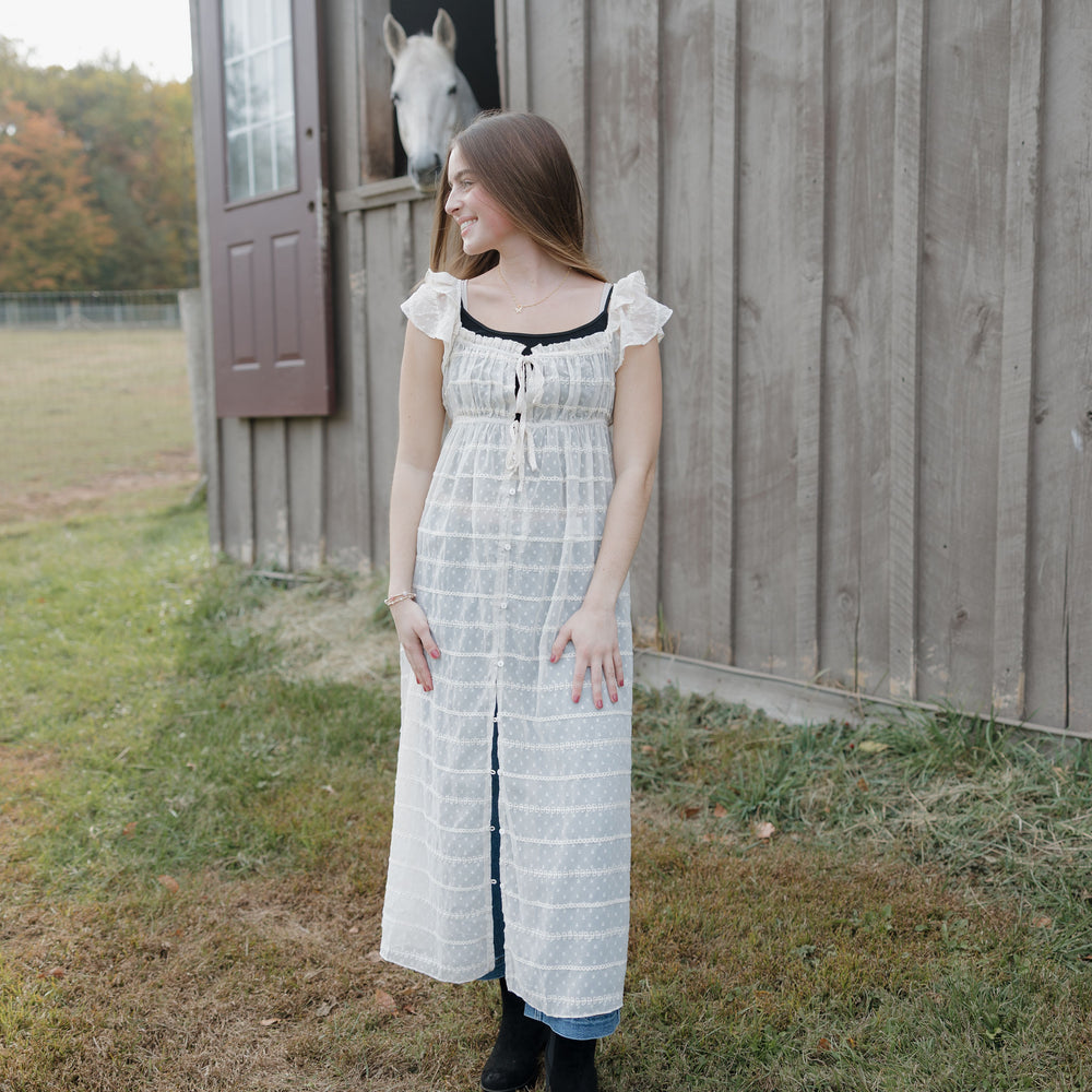The Dust up dress in cream is a sheer chiffon textured dress that has ruffle sleeves, tie at the waist and buttons. She can be worn open over a tank and shorts this piece is like nothing you have in your closet! Its as unique as you are!