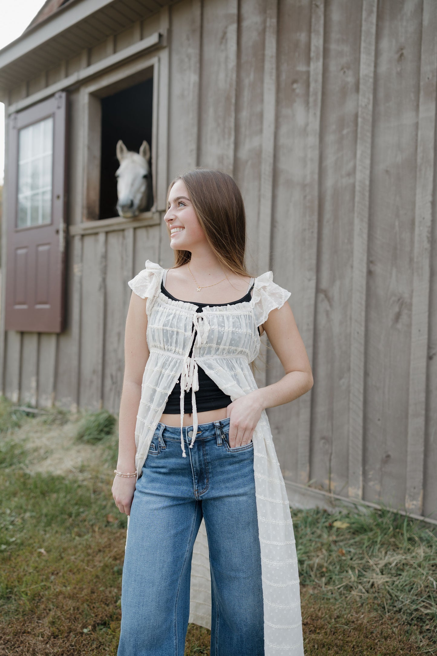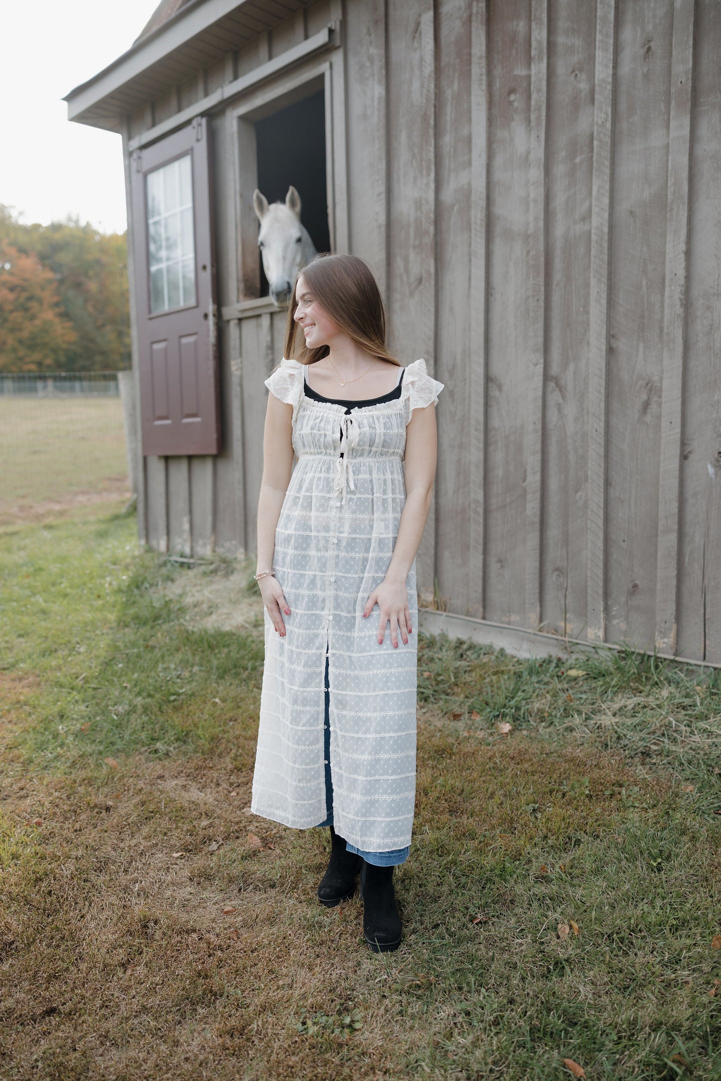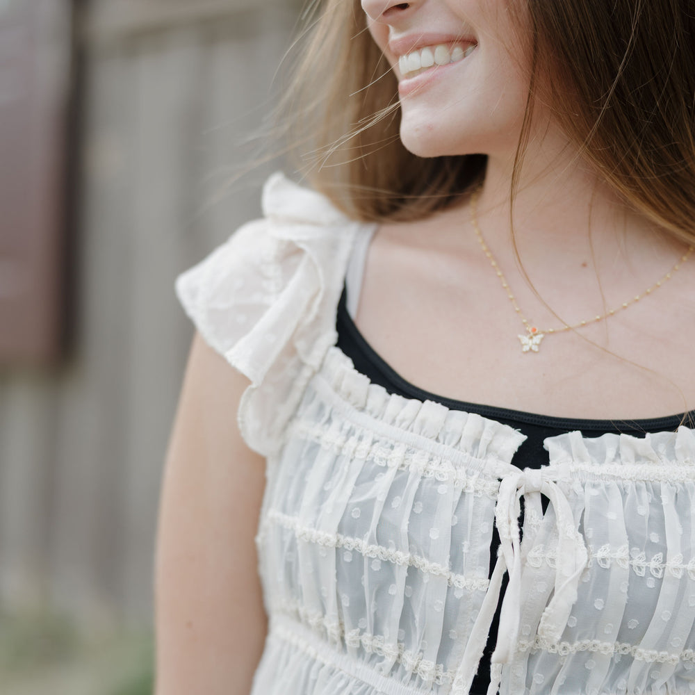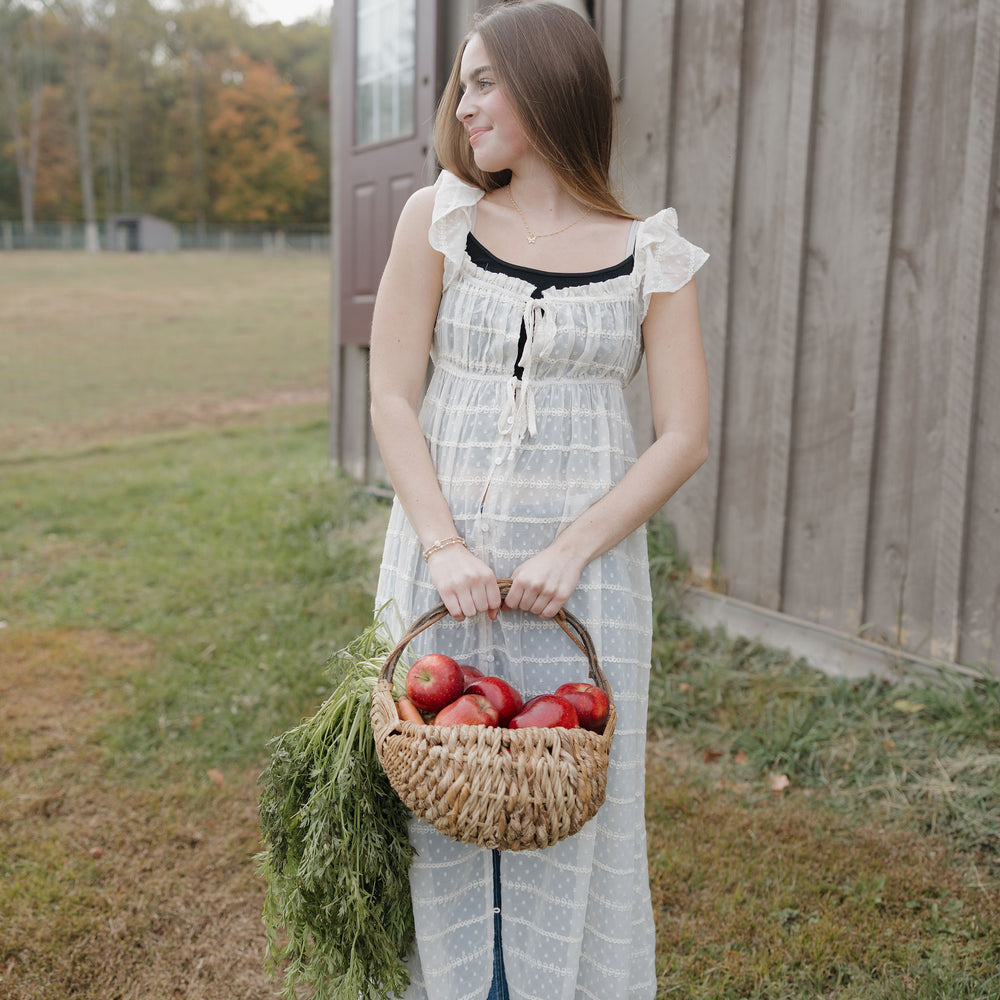 The Dust up dress in cream is a sheer chiffon textured dress that has ruffle sleeves, tie at the waist and buttons. She can be worn open over a tank and shorts this piece is like nothing you have in your closet! Its as unique as you are!