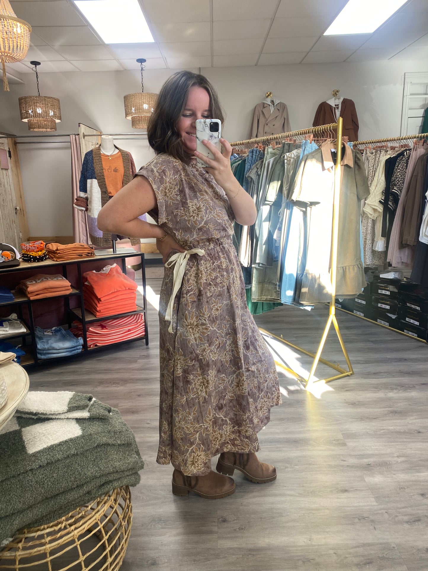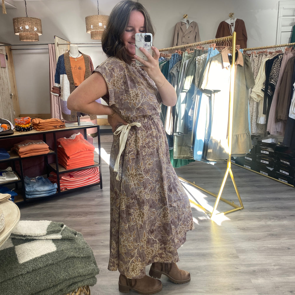 Twirl into the day with this charming midi dress that's as delightful as it is practical. Soft mauve and beige floral tones create an effortlessly romantic look, while the round neckline and cap sleeves offer sweet, feminine appeal. Cinch the waist with adorable side ribbons to customize your silhouette, and slip your essentials into hidden side pockets—because pockets make everything better. Lined skirt. The mid-length cut strikes the perfect balance between elegant and playful, making it ideal for brunches, garden parties, or whenever you want to feel a little extra fabulous.