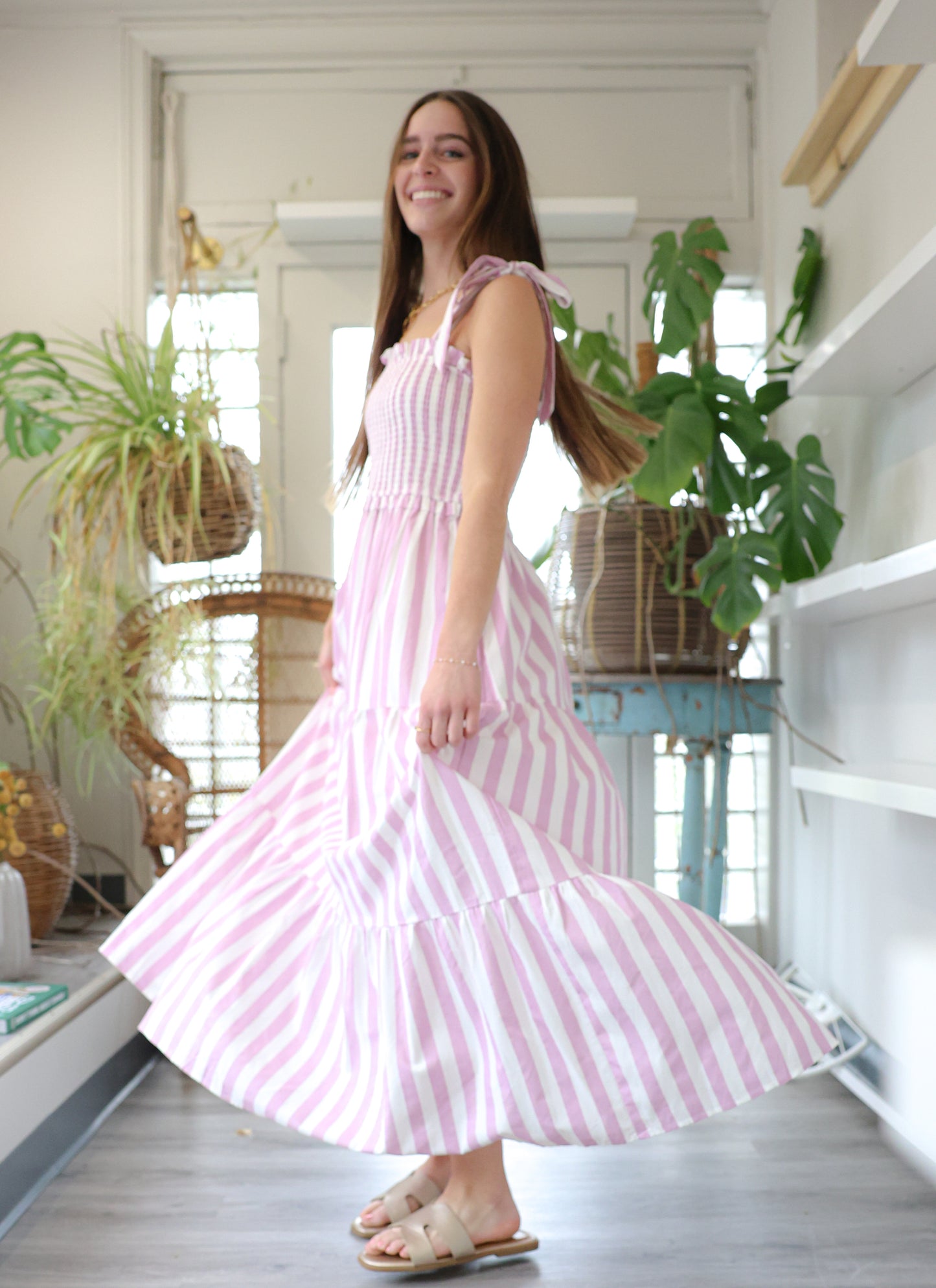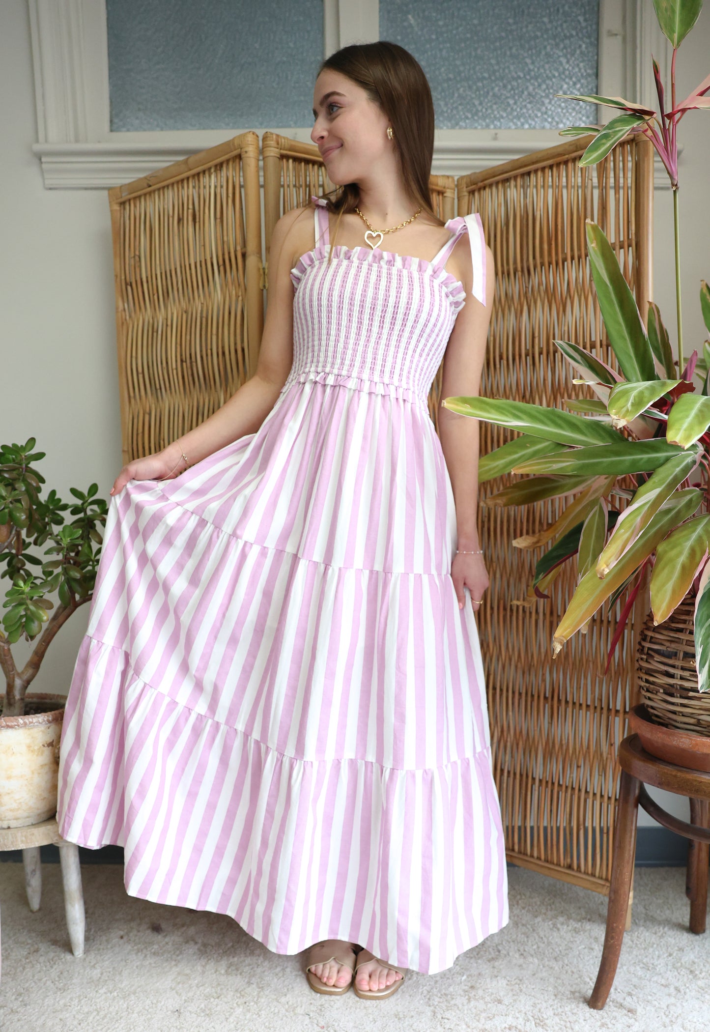 Playful stripes meet effortless elegance in this smocked dress. Adjustable tie-up shoulder straps let you customize the fit while purple and white stripes add a fun, summery vibe. Perfect for beach days, resort getaways, or whenever you want to feel relaxed and put-together.