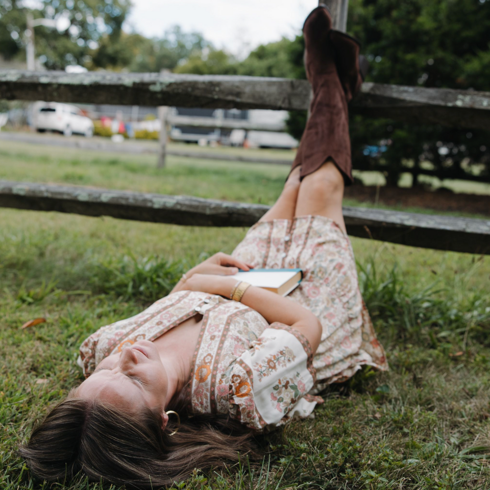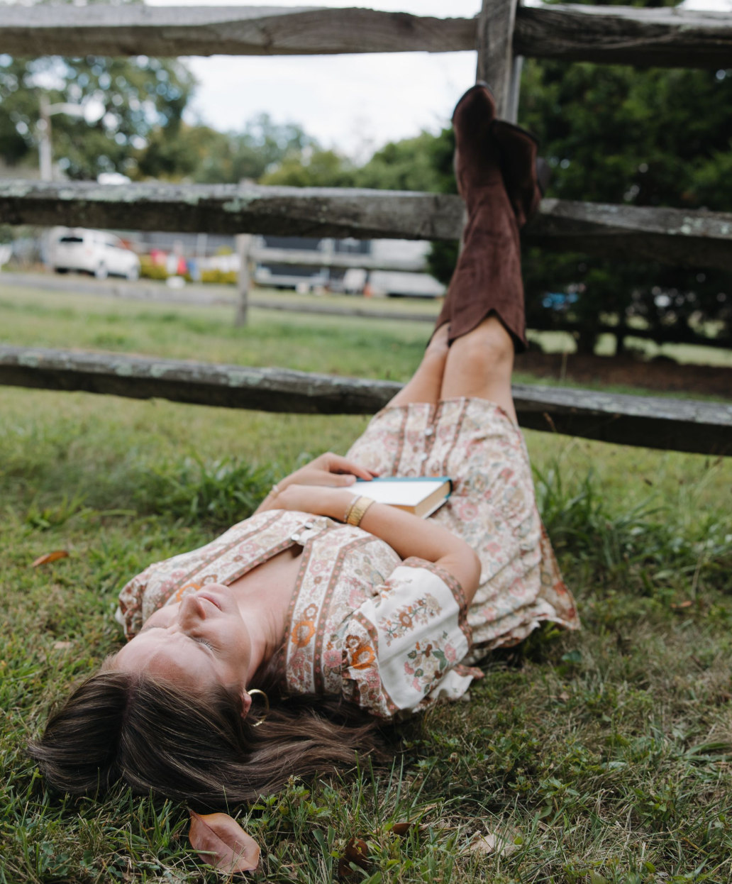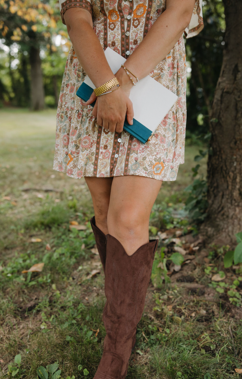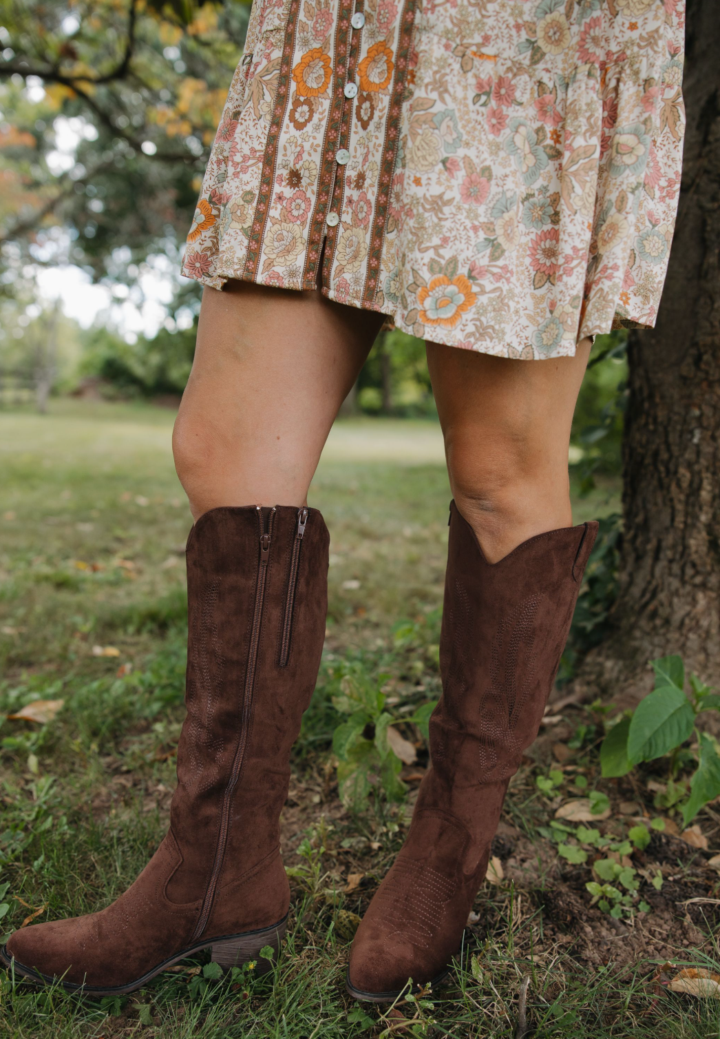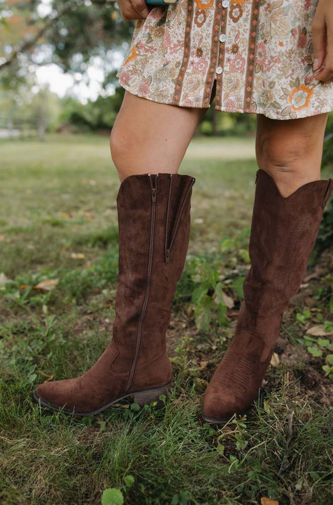 Yeehaw! Step into style with the Mila Cowboy Boot in brown. This rich brown boot features a taupe suede material with white stitching, along with a convenient zipper closure and extender.