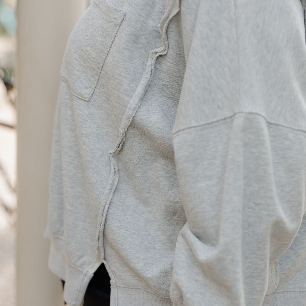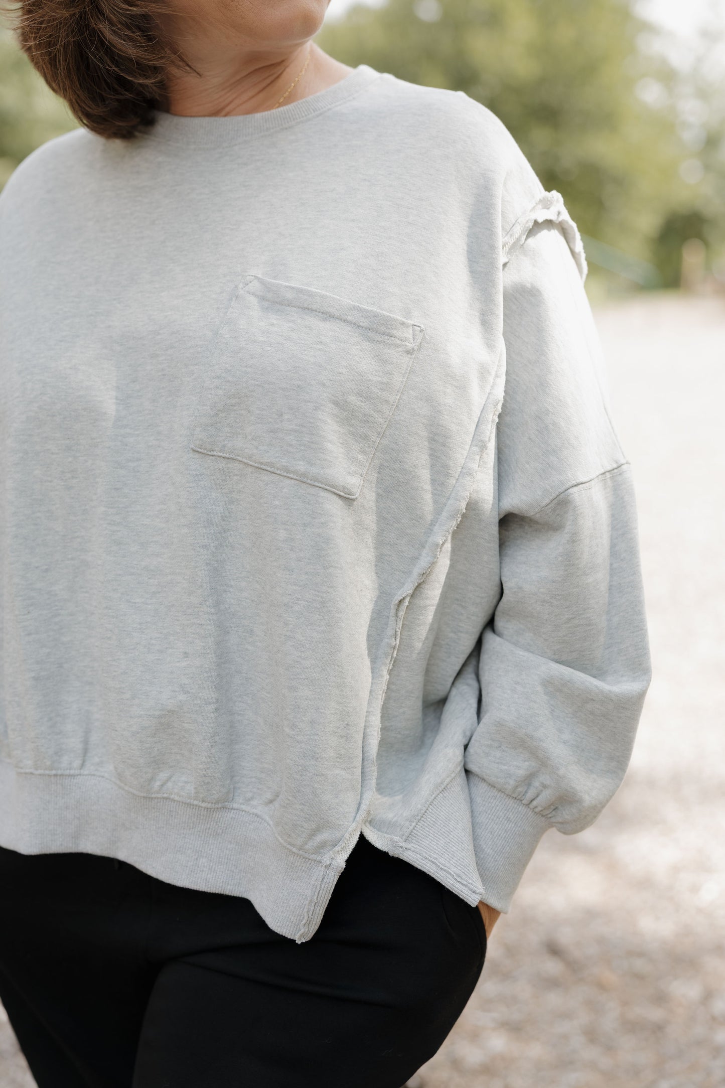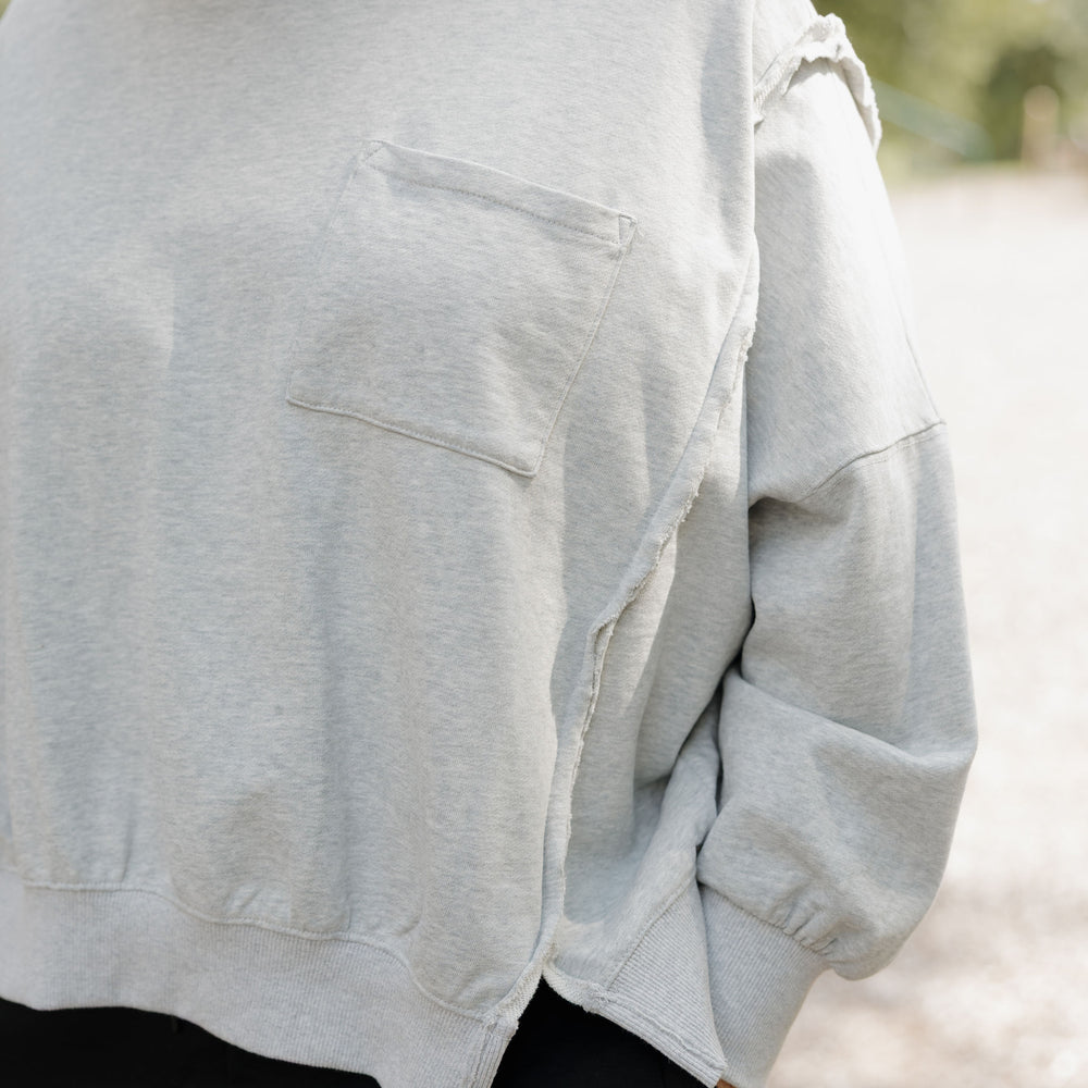 The Cara top in heather grey features a crew neckline and relaxed dropped shoulders for comfort. It includes unique reverse seam detailing and a convenient front pocket. Finished with ribbed cuffs and hem, side slits, and a mineral wash, this top offers a loose, boxy fit that supports ease of movement throughout your day.