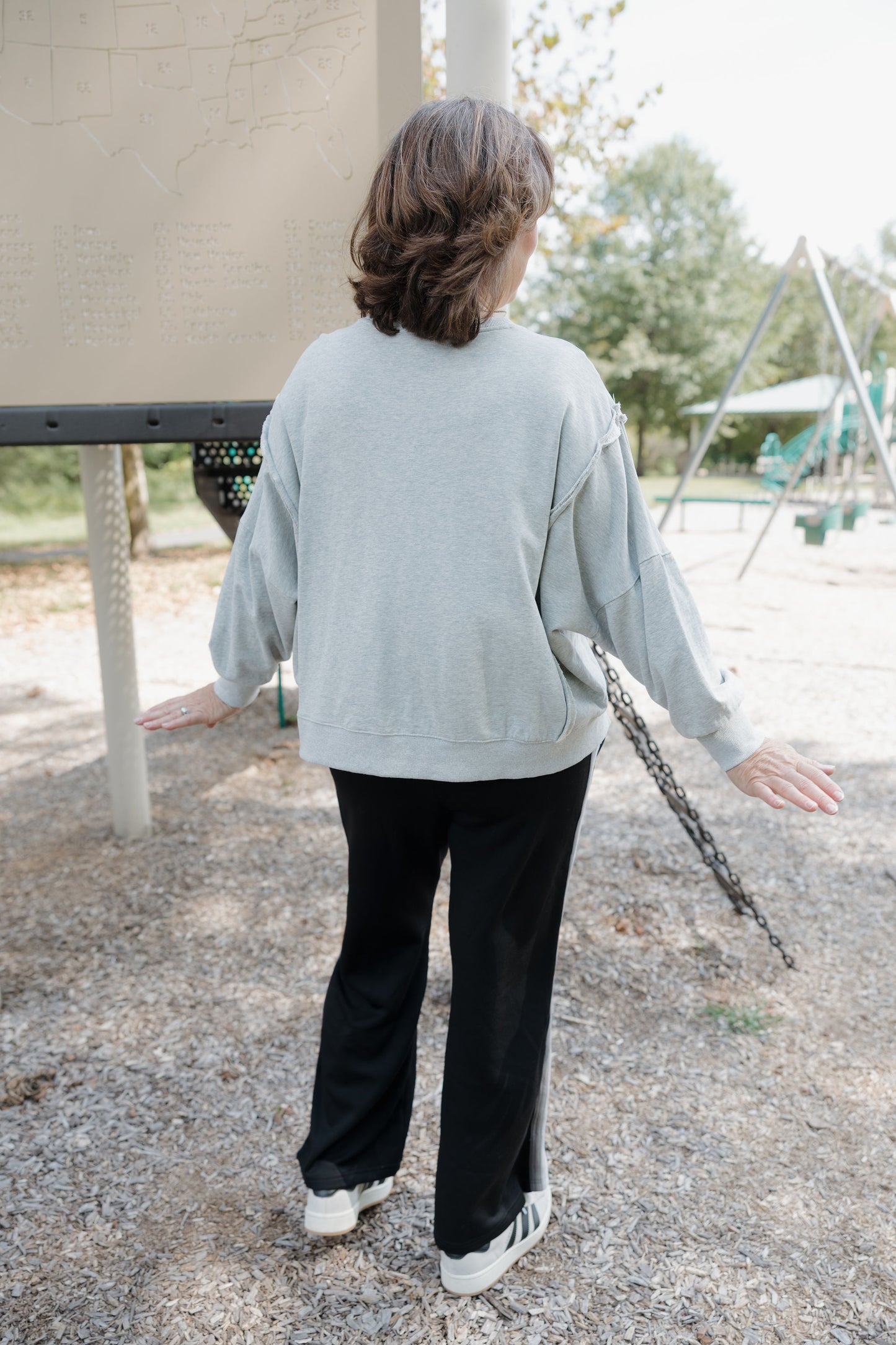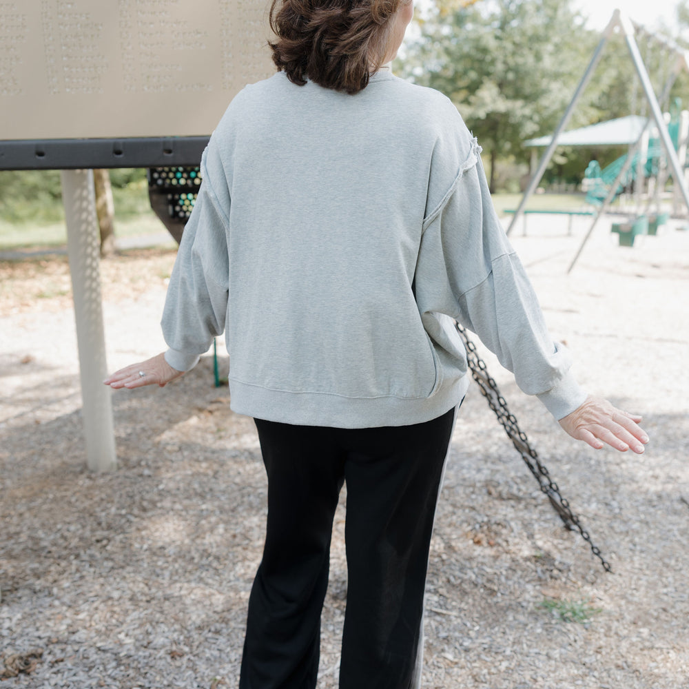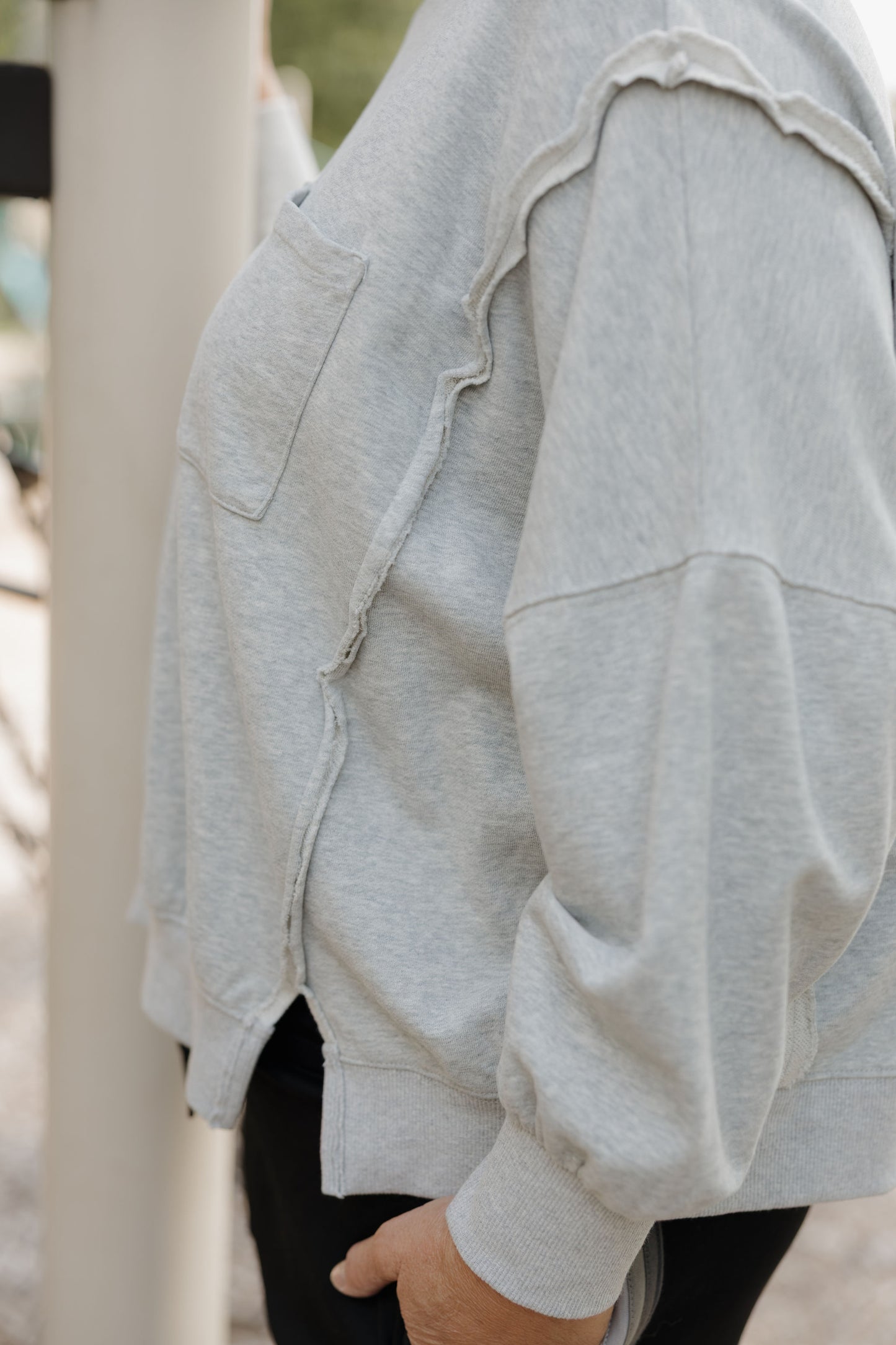 The Cara top in heather grey features a crew neckline and relaxed dropped shoulders for comfort. It includes unique reverse seam detailing and a convenient front pocket. Finished with ribbed cuffs and hem, side slits, and a mineral wash, this top offers a loose, boxy fit that supports ease of movement throughout your day.