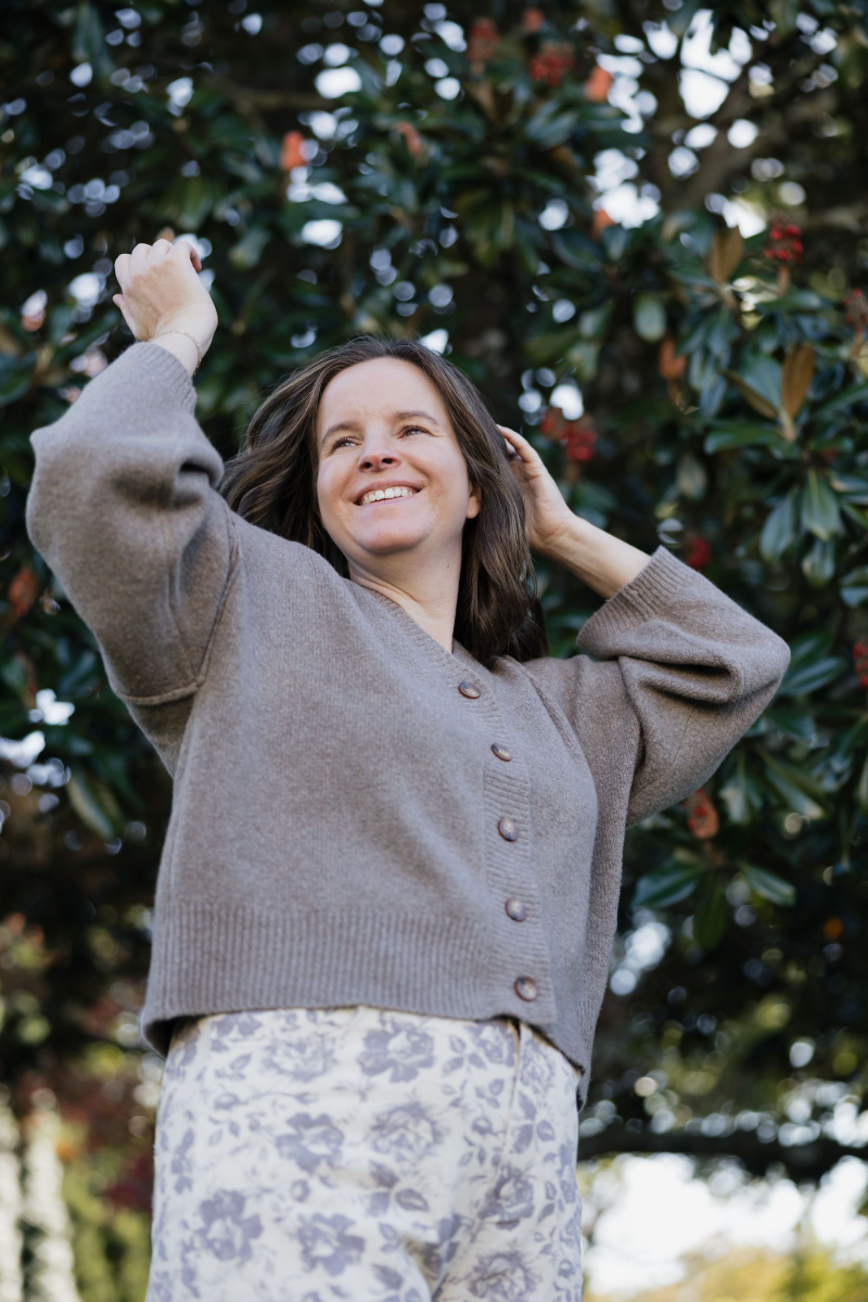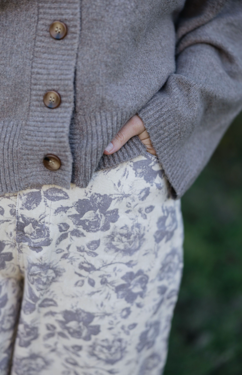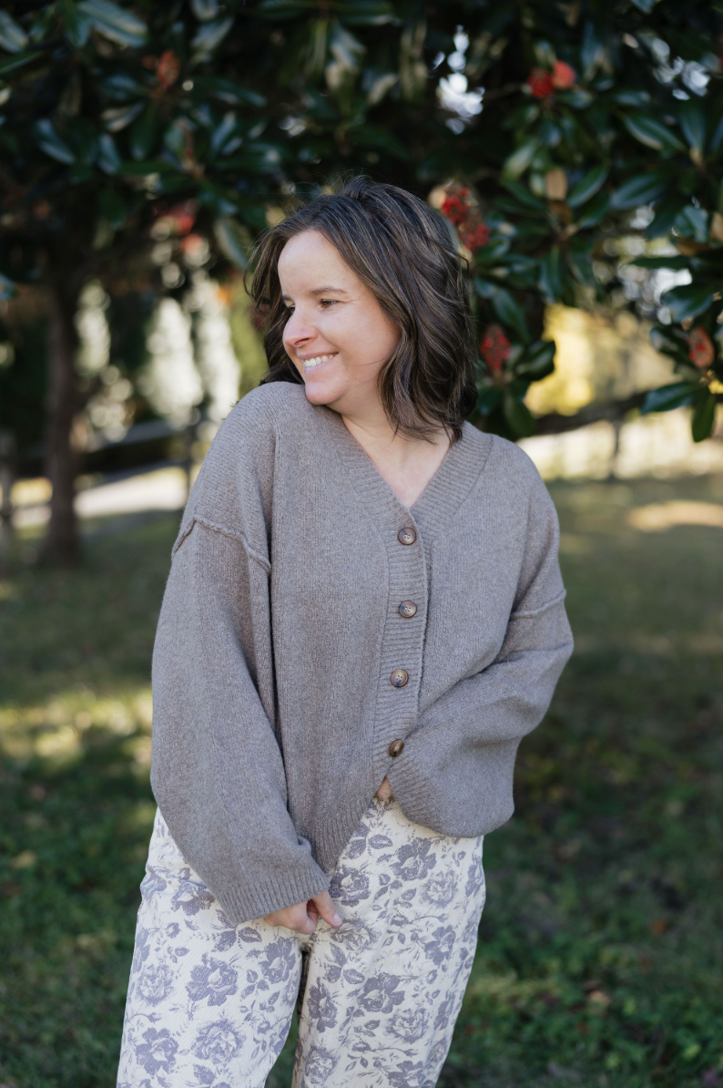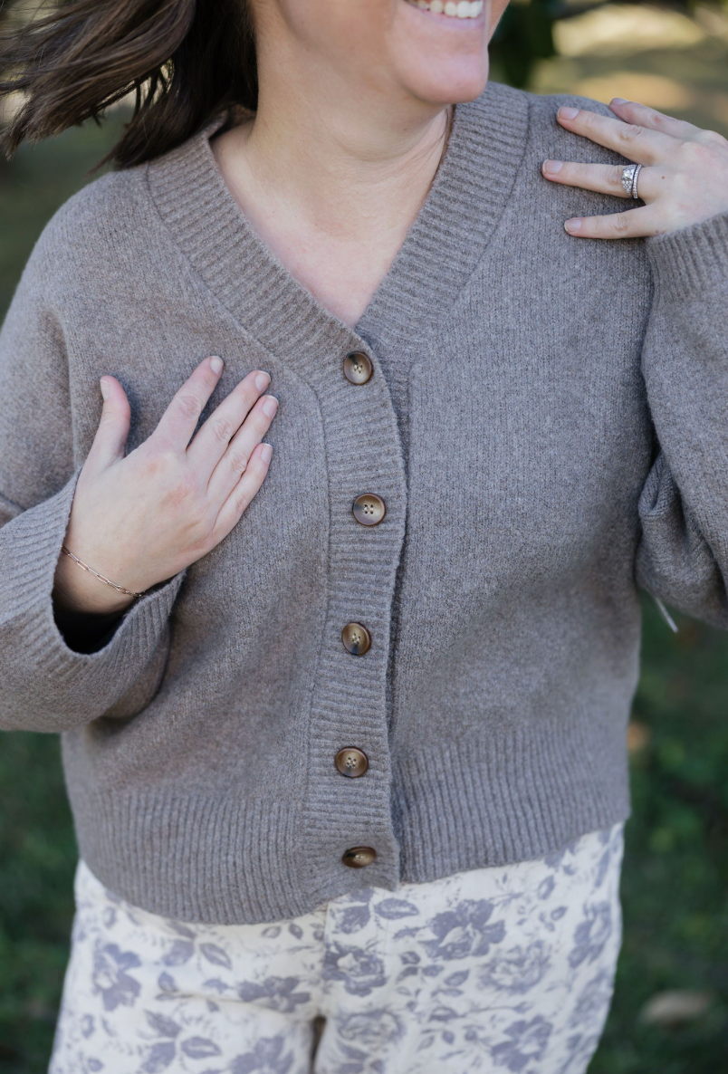 Mocha-hued, cropped cardigan with buttons for a fun twist on cozy style.