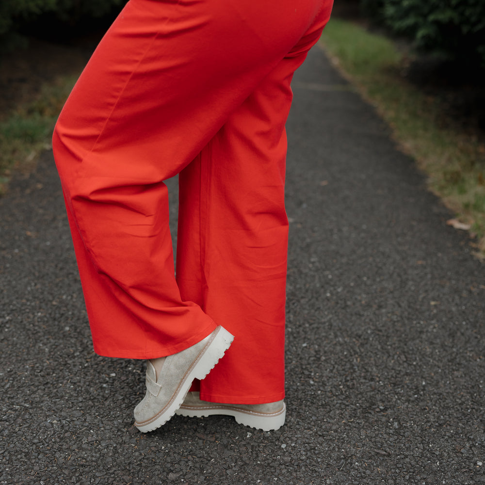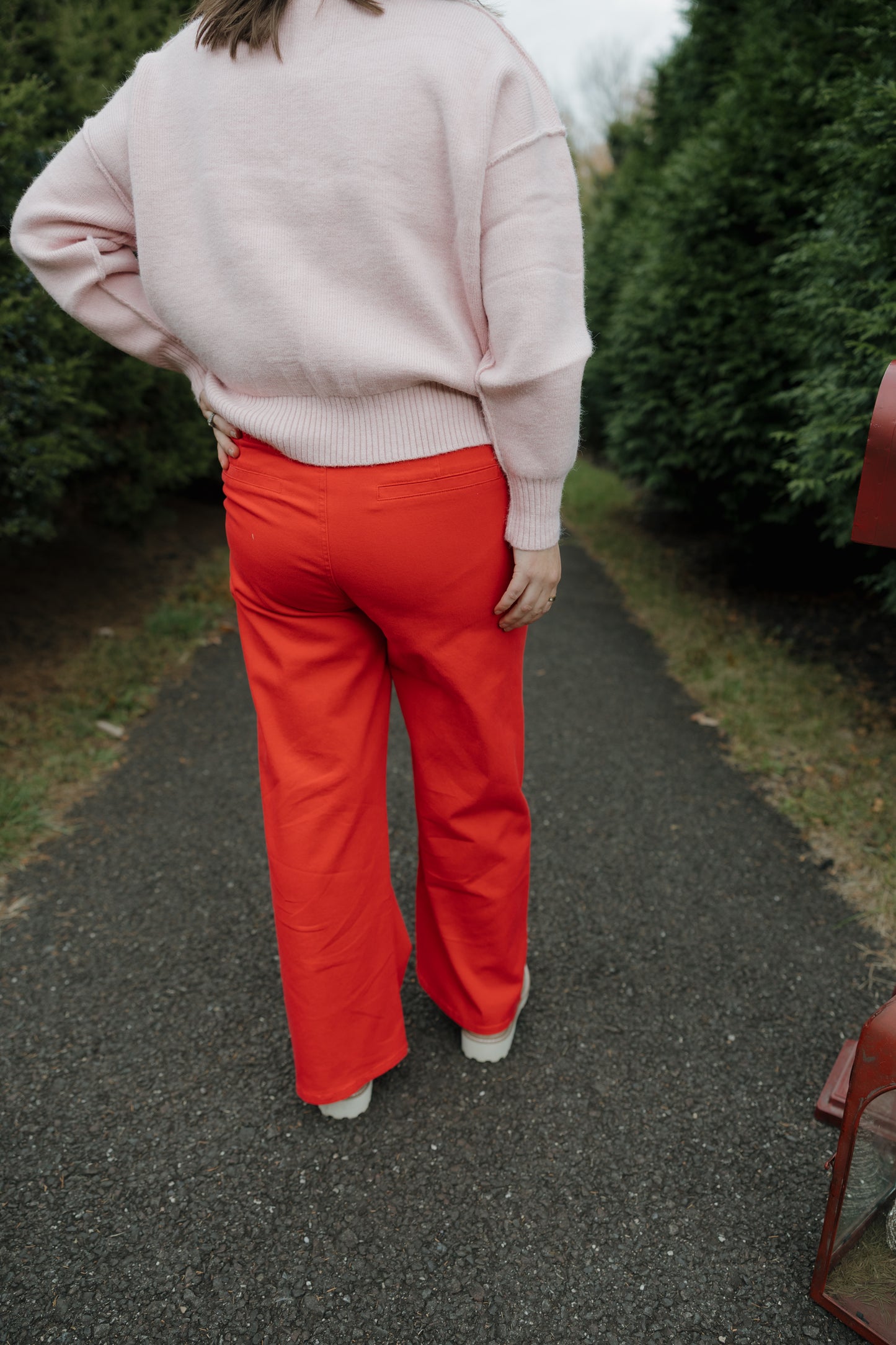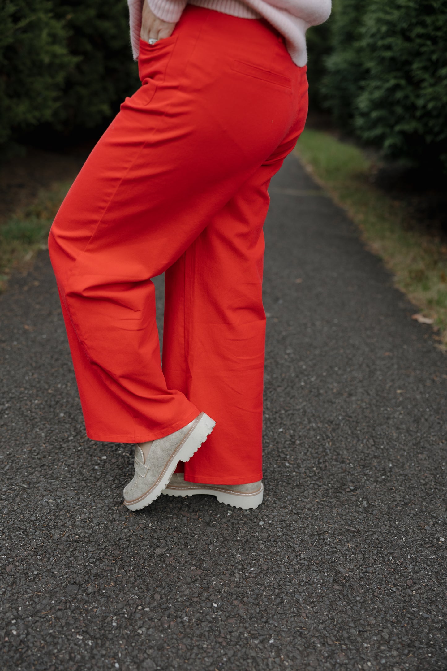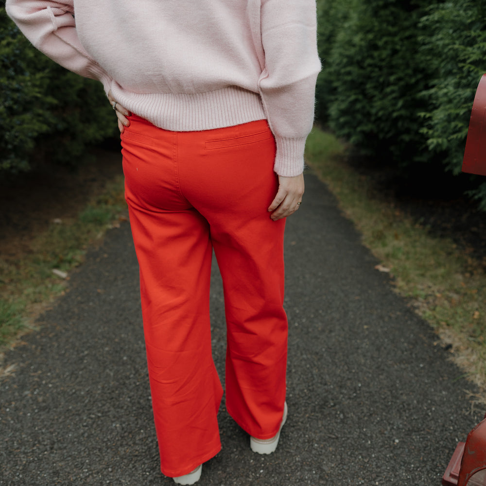 These vivid red, wide-leg jeans with front pockets exude a lively, daring vibe—imagine a retro flair combined with a standout fashion statement.