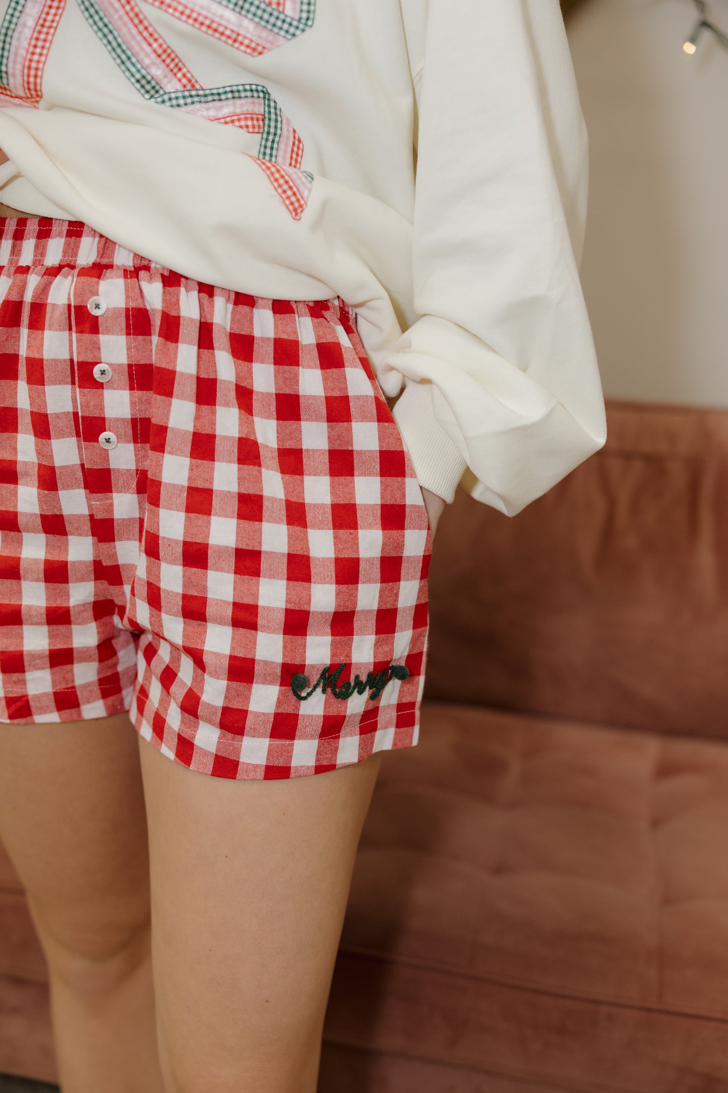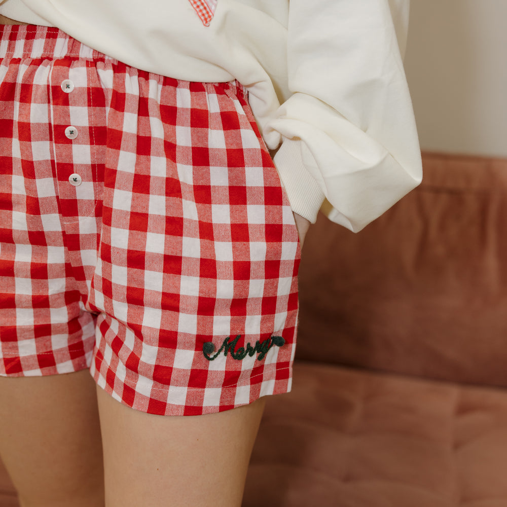 These playful shorts feature a red and white checker pattern accented with buttons and a cheerful red merry adorned