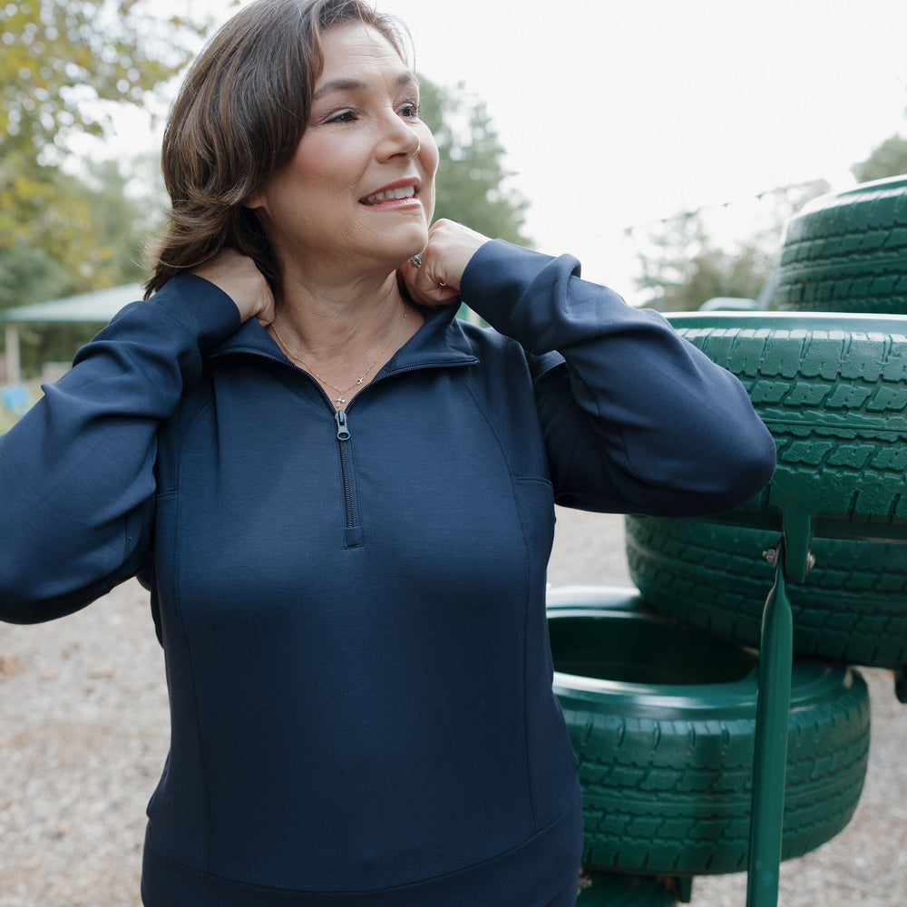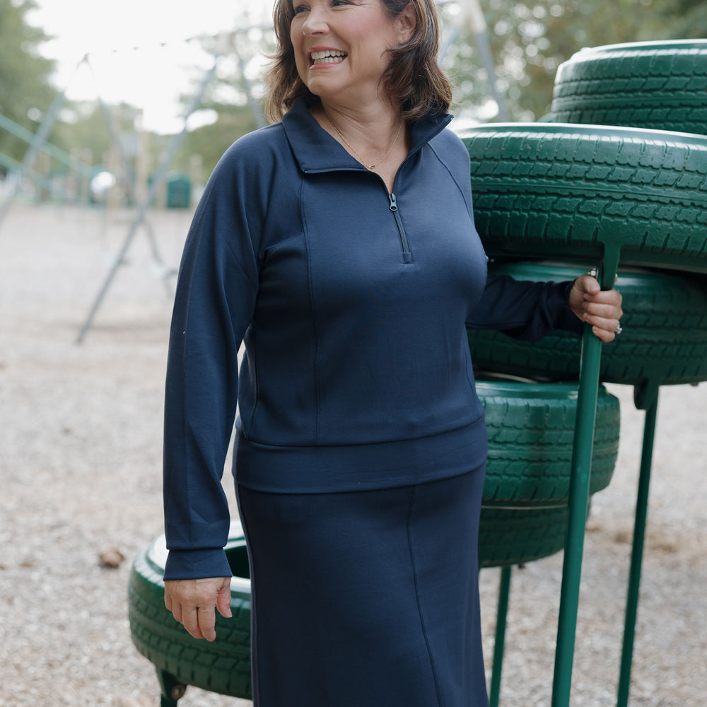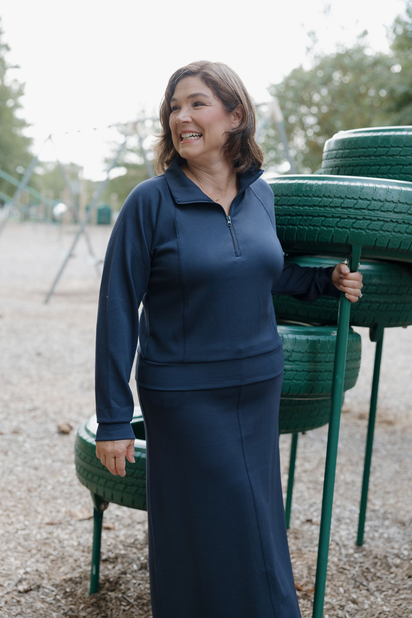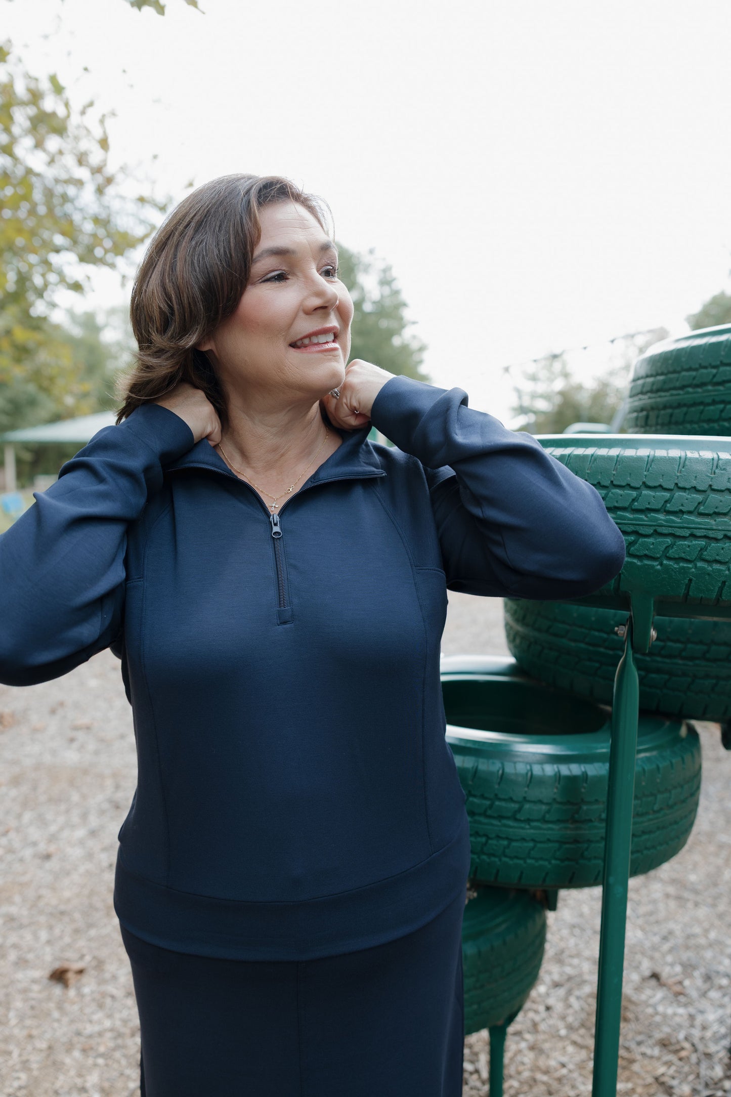 Stay warm and stylish with this navy fleece quarter-zip featuring a comfortable collar. Perfect for layering, it combines cozy warmth with a sleek design to elevate your casual wardrobe. Wear with matching joggers, pants or long skirt!