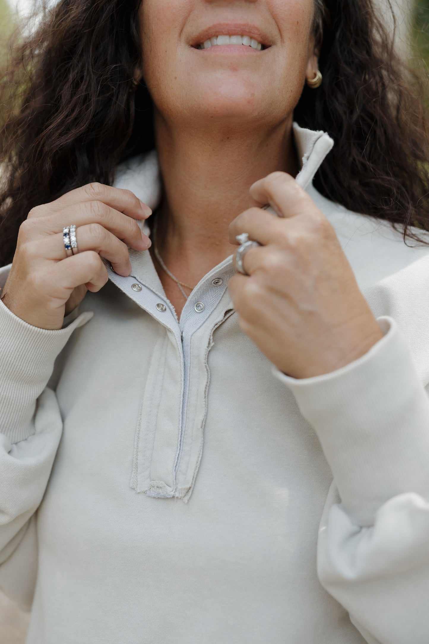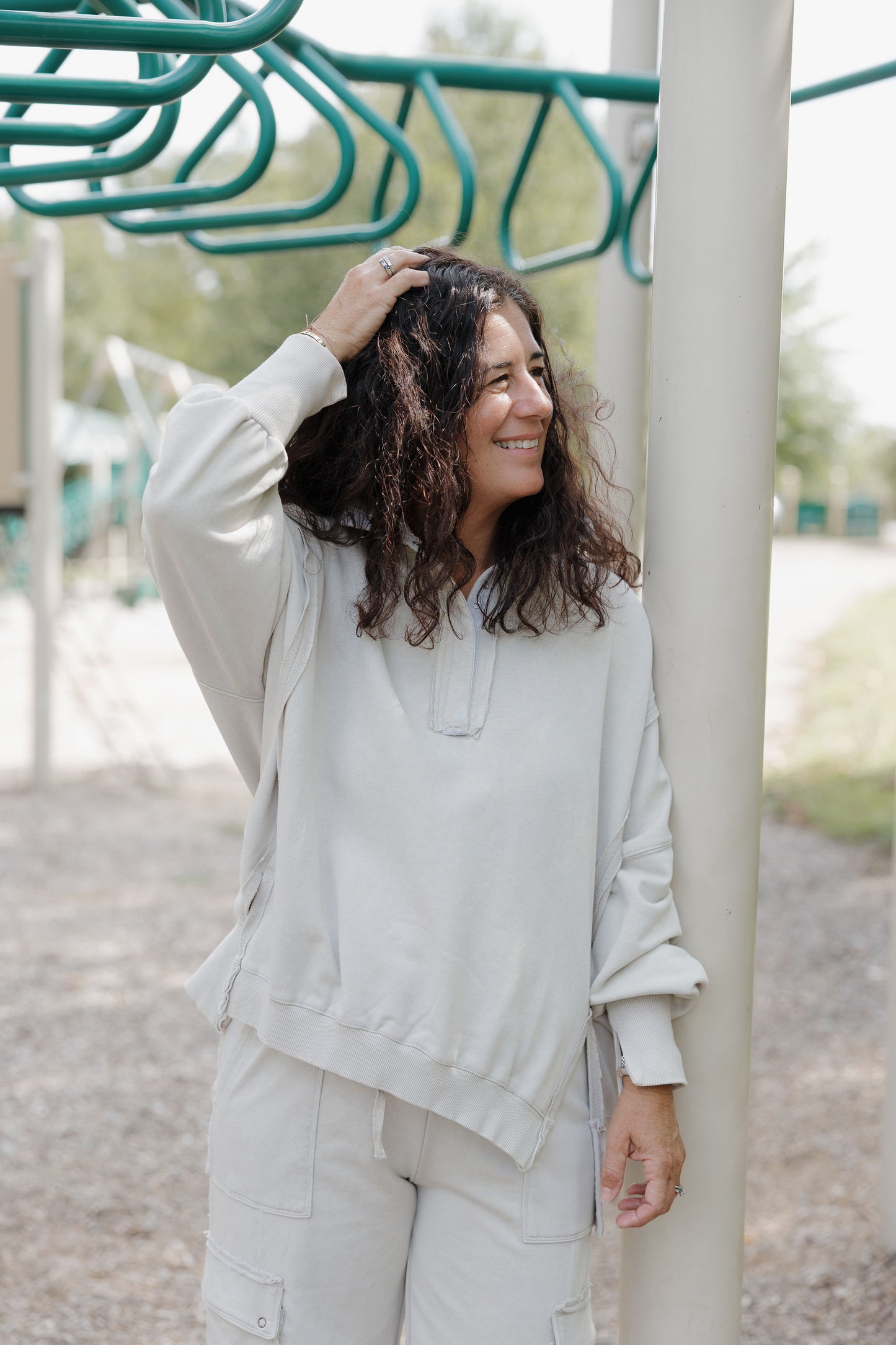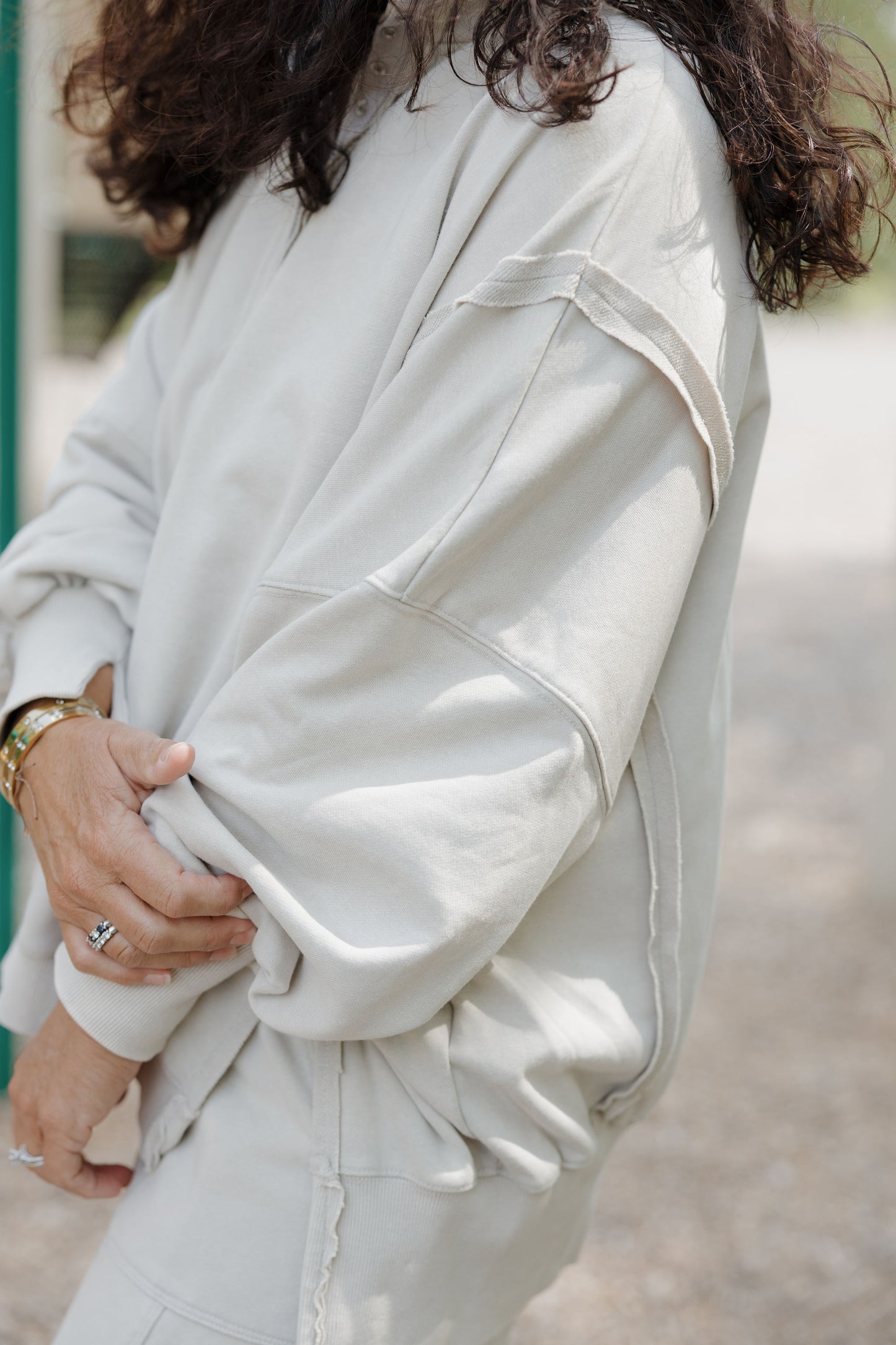 This oatmeal-colored crew features a playful boho vibe with a quarter snap-up front and stylish side slits for a relaxed, breezy look. Drop shoulder dolman sleeve with exposed raw seam details. Shorter front and longer in back. Ribbed mock neck, cuffs and hem add an elevated touch. Comfort yet cute and stylish! Pair with Oatmeal Washed Cargo Pants for a matching set!