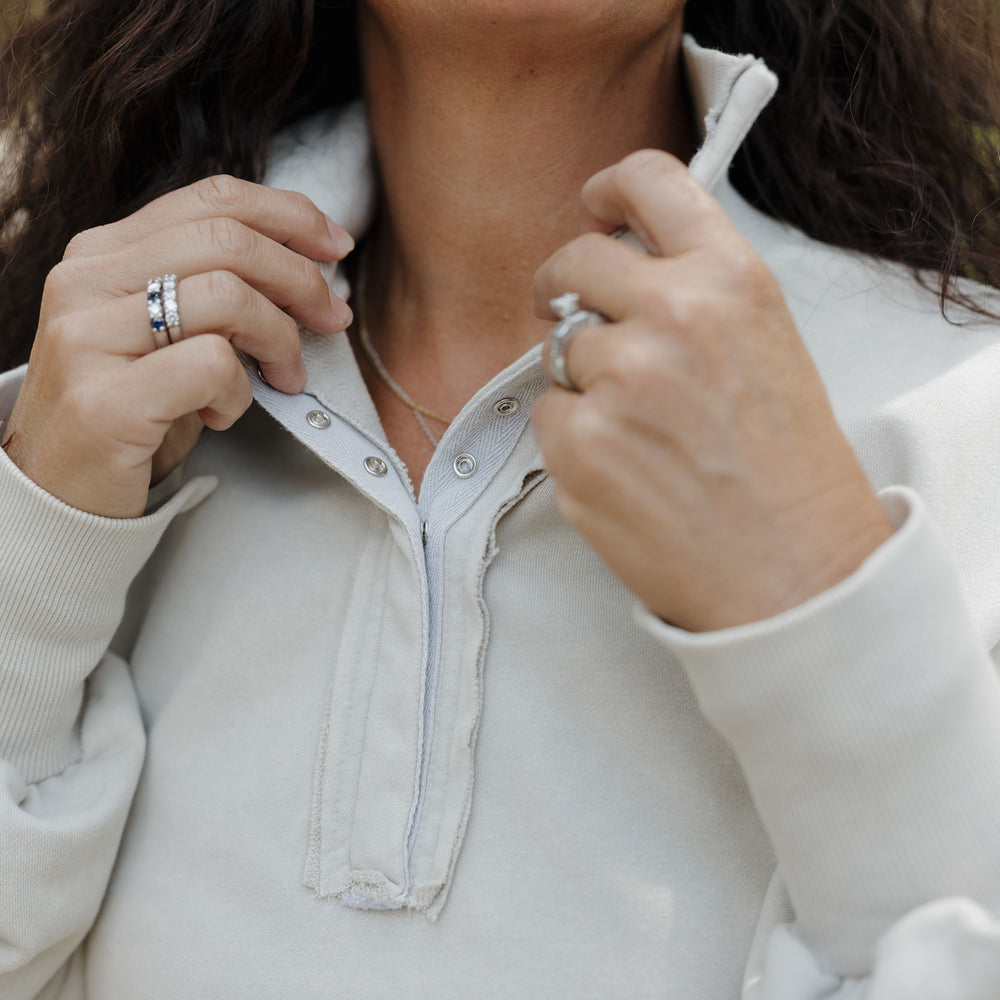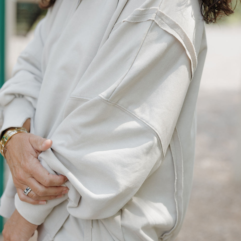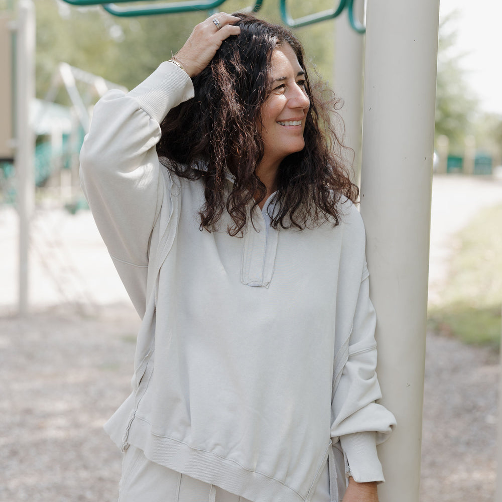 This oatmeal-colored crew features a playful boho vibe with a quarter snap-up front and stylish side slits for a relaxed, breezy look. Drop shoulder dolman sleeve with exposed raw seam details. Shorter front and longer in back. Ribbed mock neck, cuffs and hem add an elevated touch. Comfort yet cute and stylish! Pair with Oatmeal Washed Cargo Pants for a matching set!
