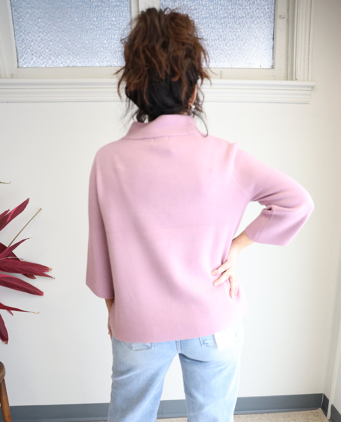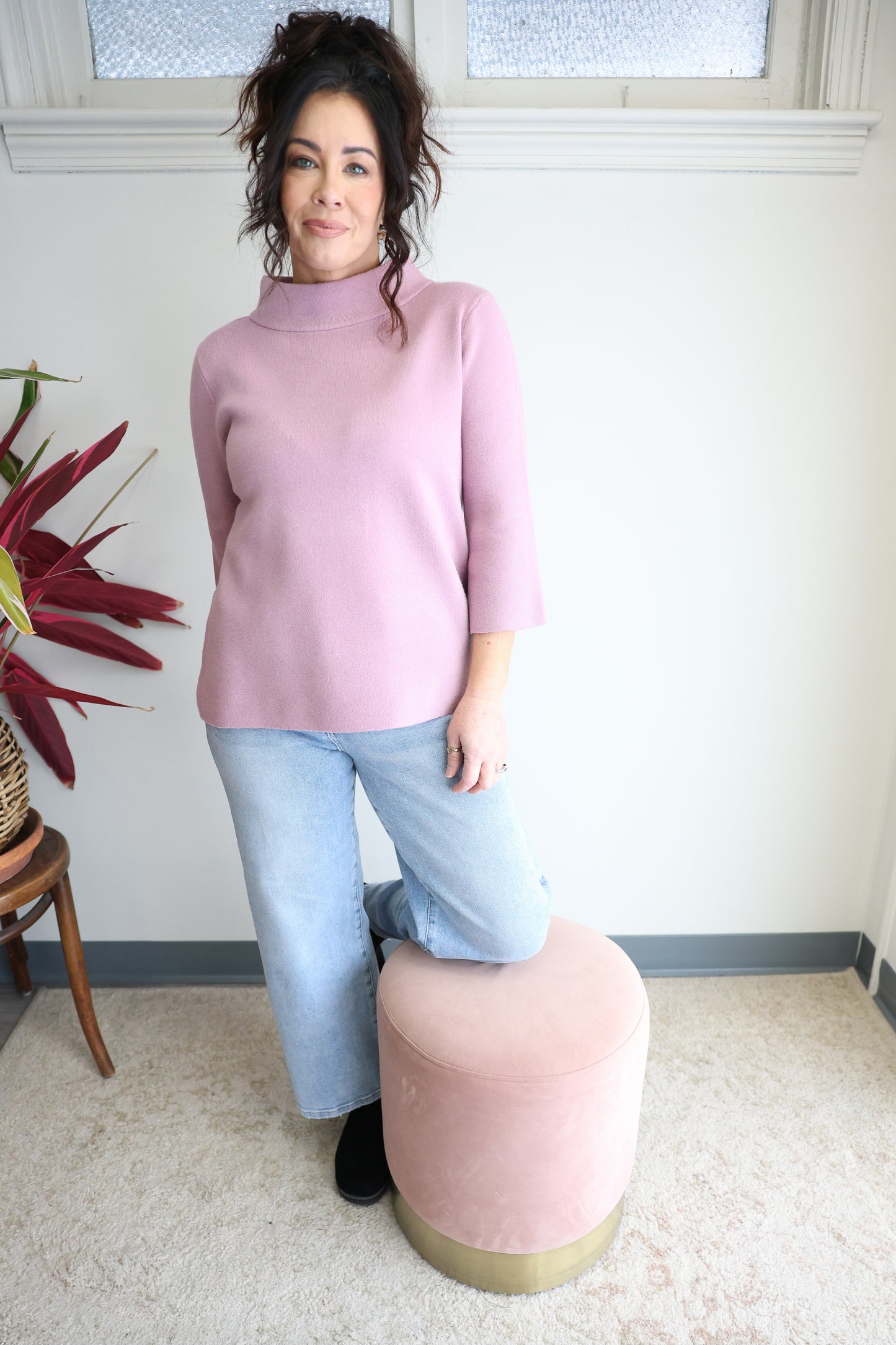 The Penny Top in dusty mauve is a snug mock neck pullover sweater with delightful bell sleeves, keeping you comfy yet effortlessly polished.