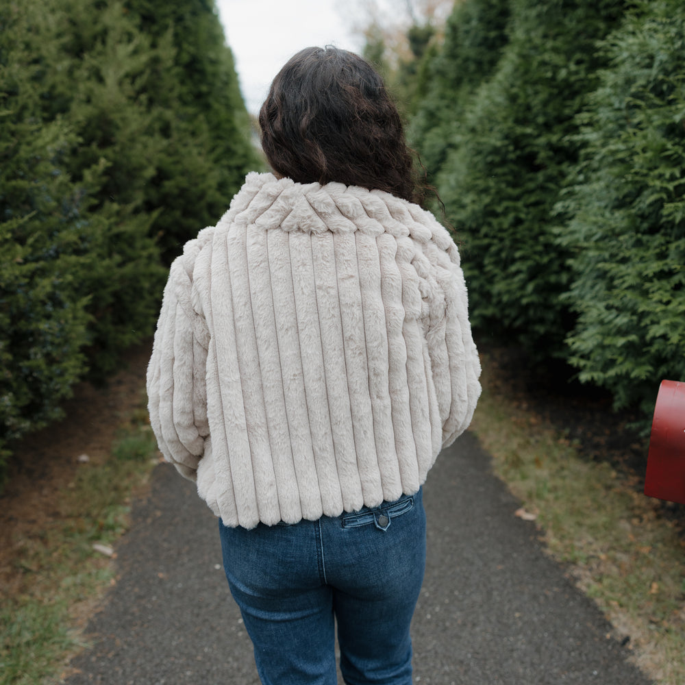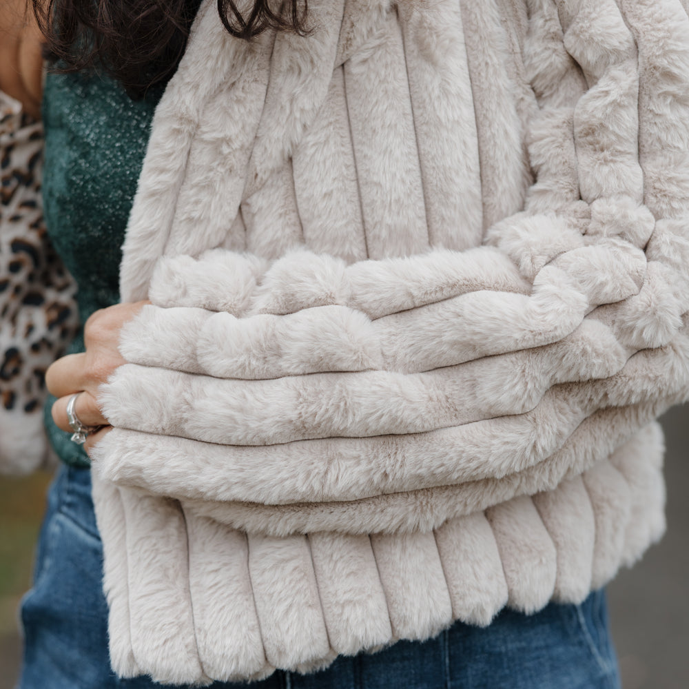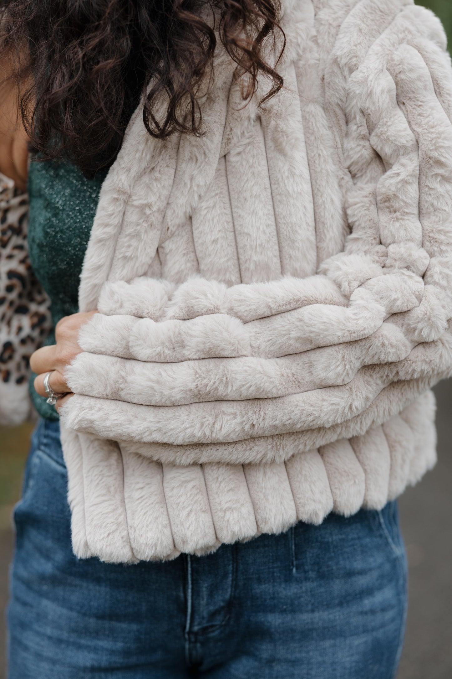 This cropped faux fur jacket is a great addition to any outfit. Elevate a dressy outfit or wear with denim for a luxurious feel. The neutral color works perfect. The ribbing adds an elegant touch. The front is draped so you can fold over for a effortless look. It has pockets as well as printed lining for a fun touch.
