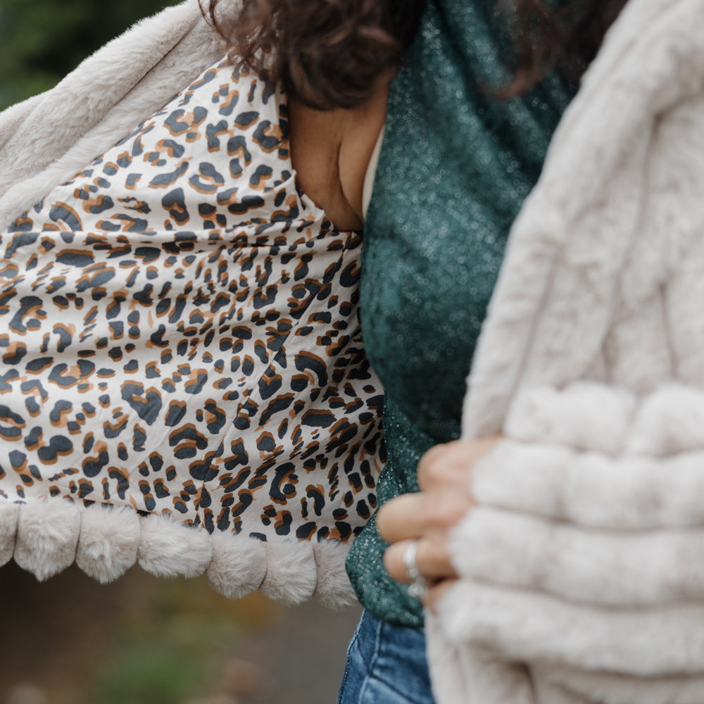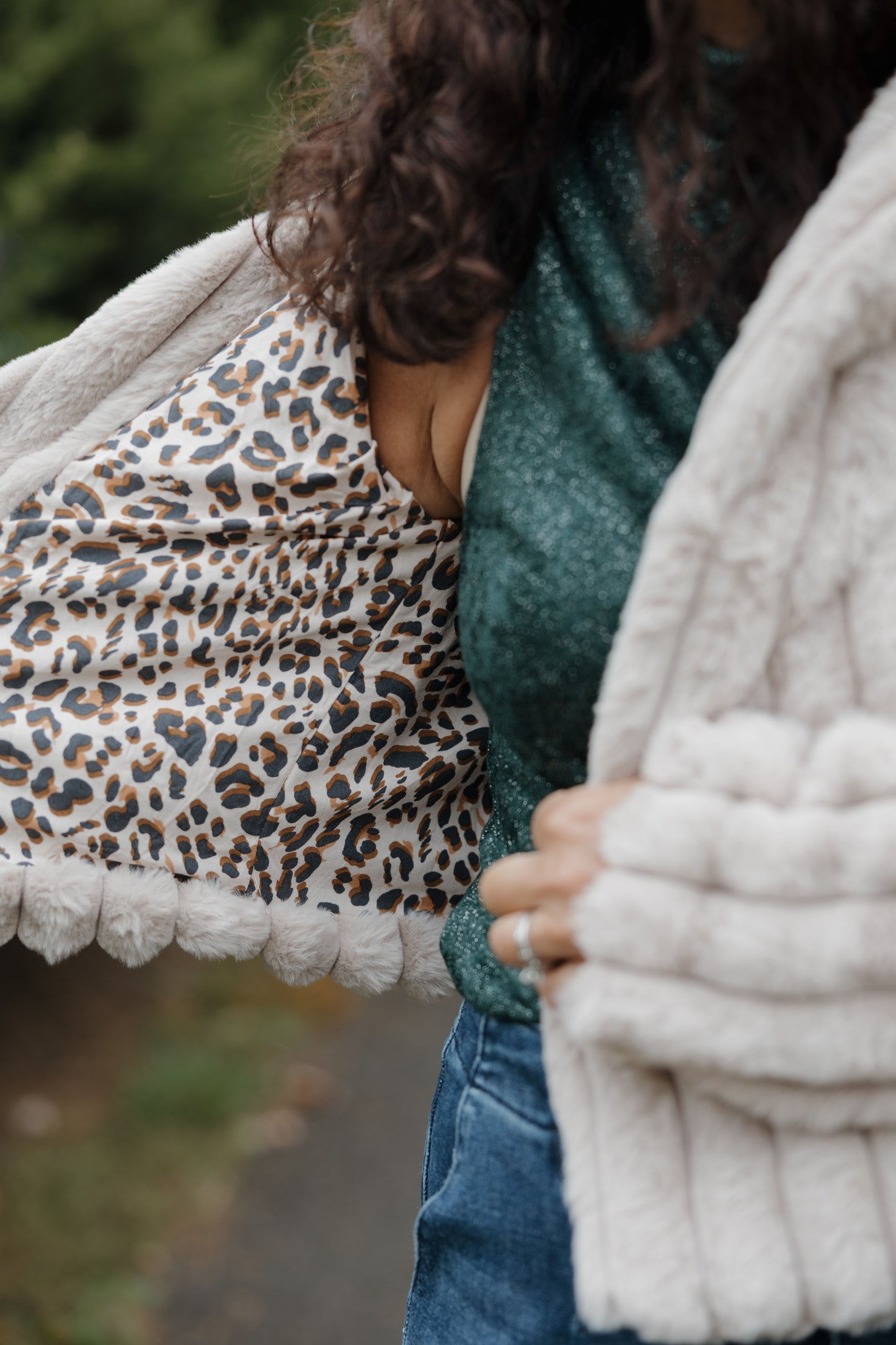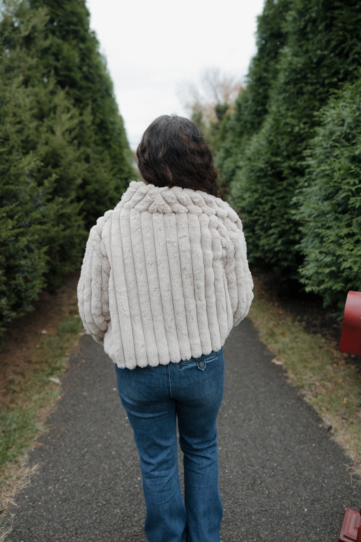 This cropped faux fur jacket is a great addition to any outfit. Elevate a dressy outfit or wear with denim for a luxurious feel. The neutral color works perfect. The ribbing adds an elegant touch. The front is draped so you can fold over for a effortless look. It has pockets as well as printed lining for a fun touch.