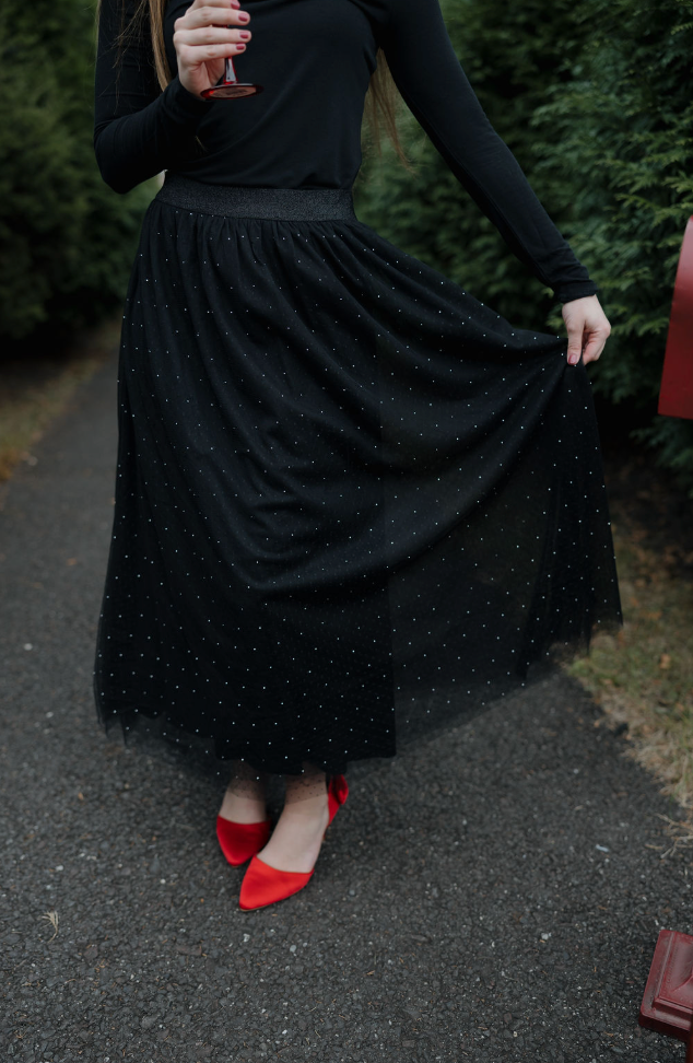This Black Tulle delightful skirt shines with glittering sparkle and lightweight mesh, gracefully hitting a flattering mid-length. It boasts an elastic stretch waistband with a glittery band, an A-line silhouette, and is sprinkled with tiny gemstones for extra charm.