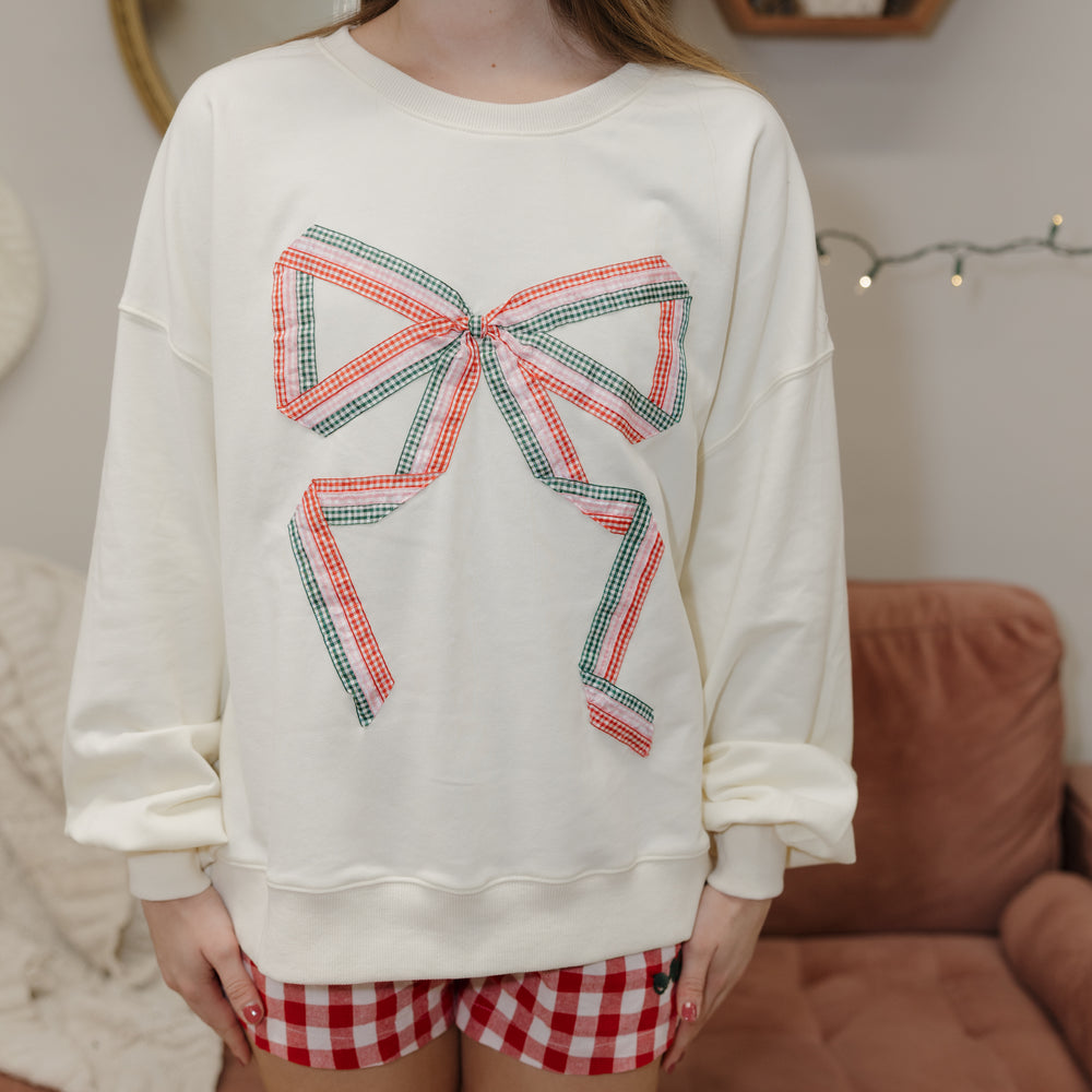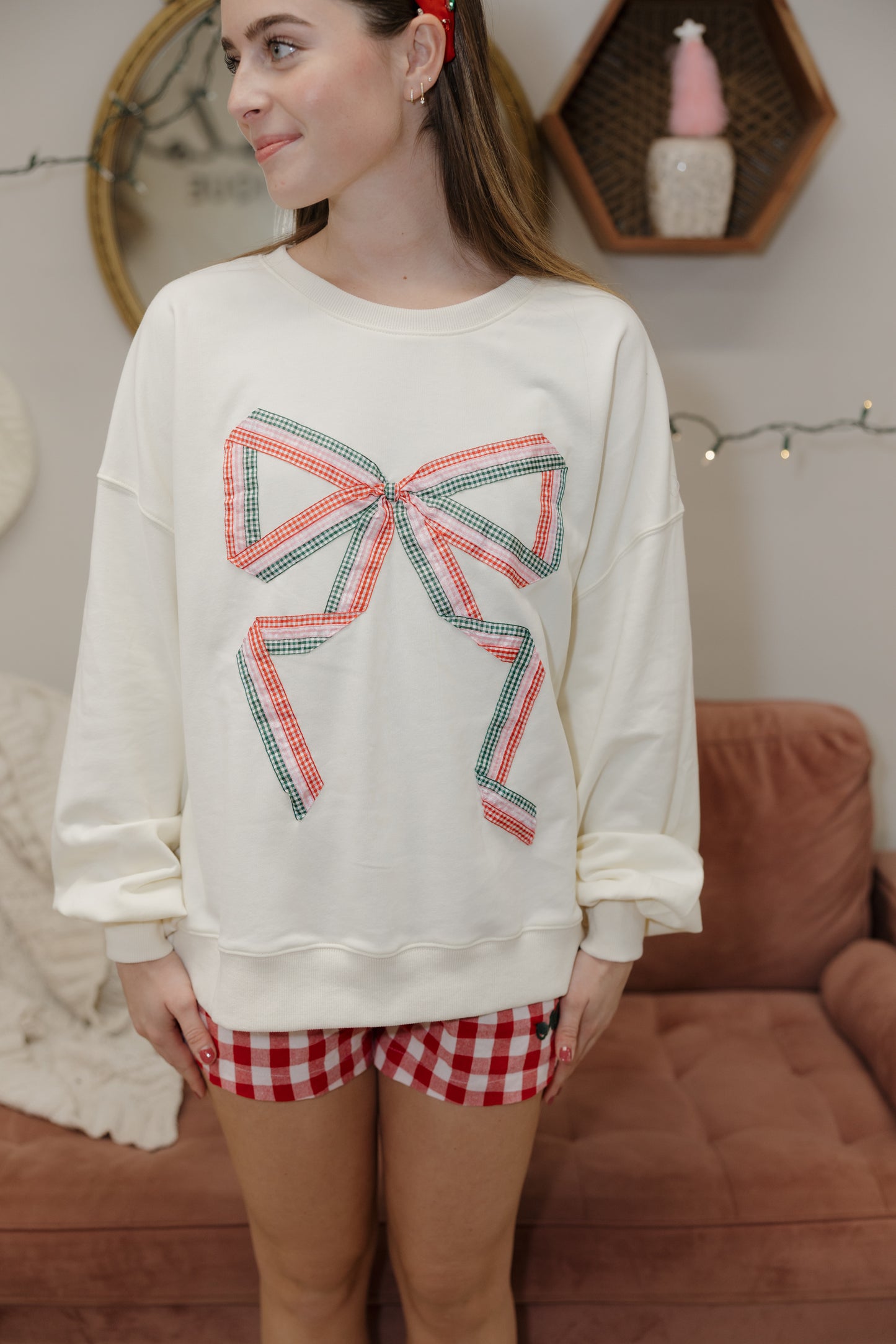 Celebrate the season with a cream sweater featuring a festive checkered ribbon bow—a perfect blend of cozy charm and holiday cheer!