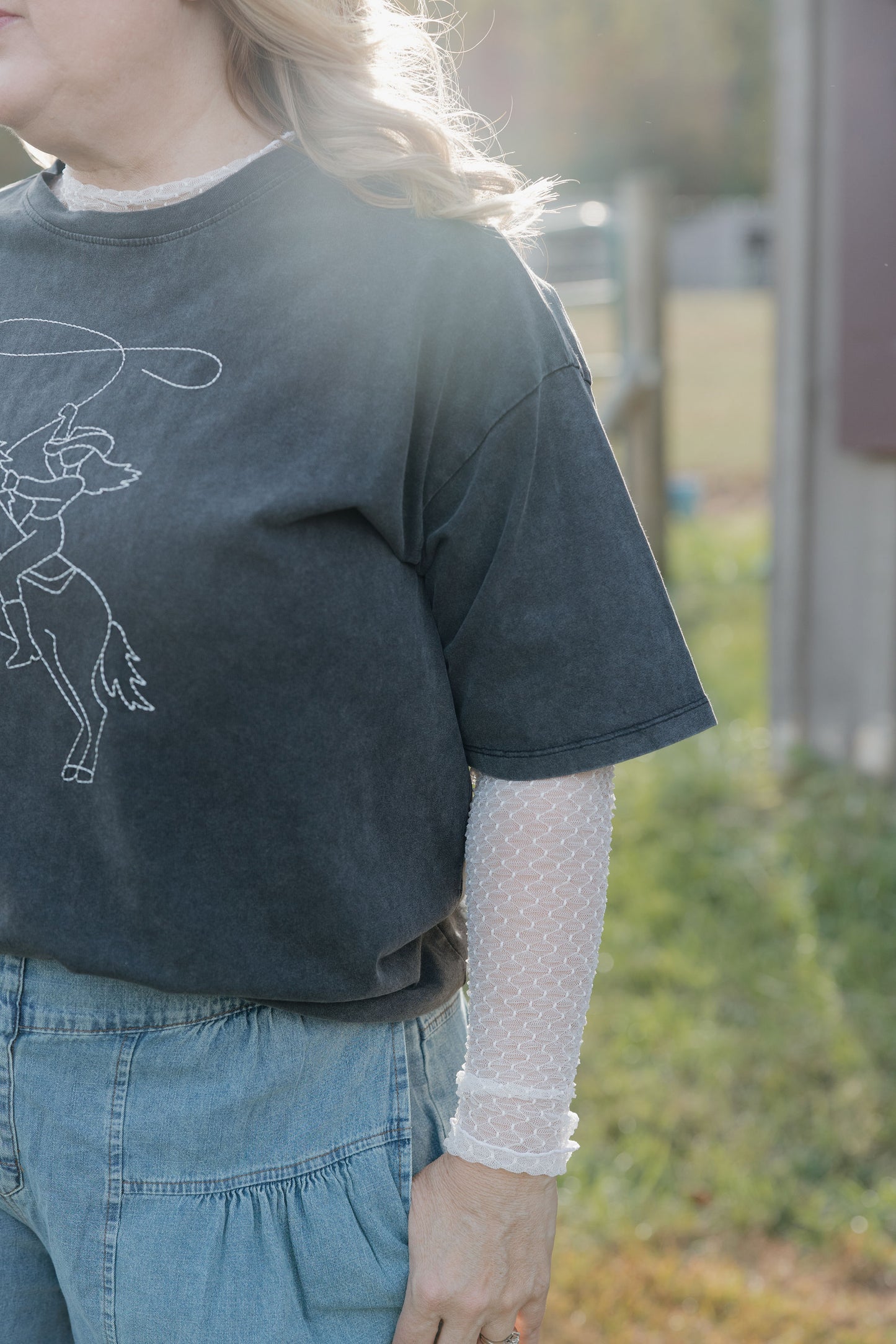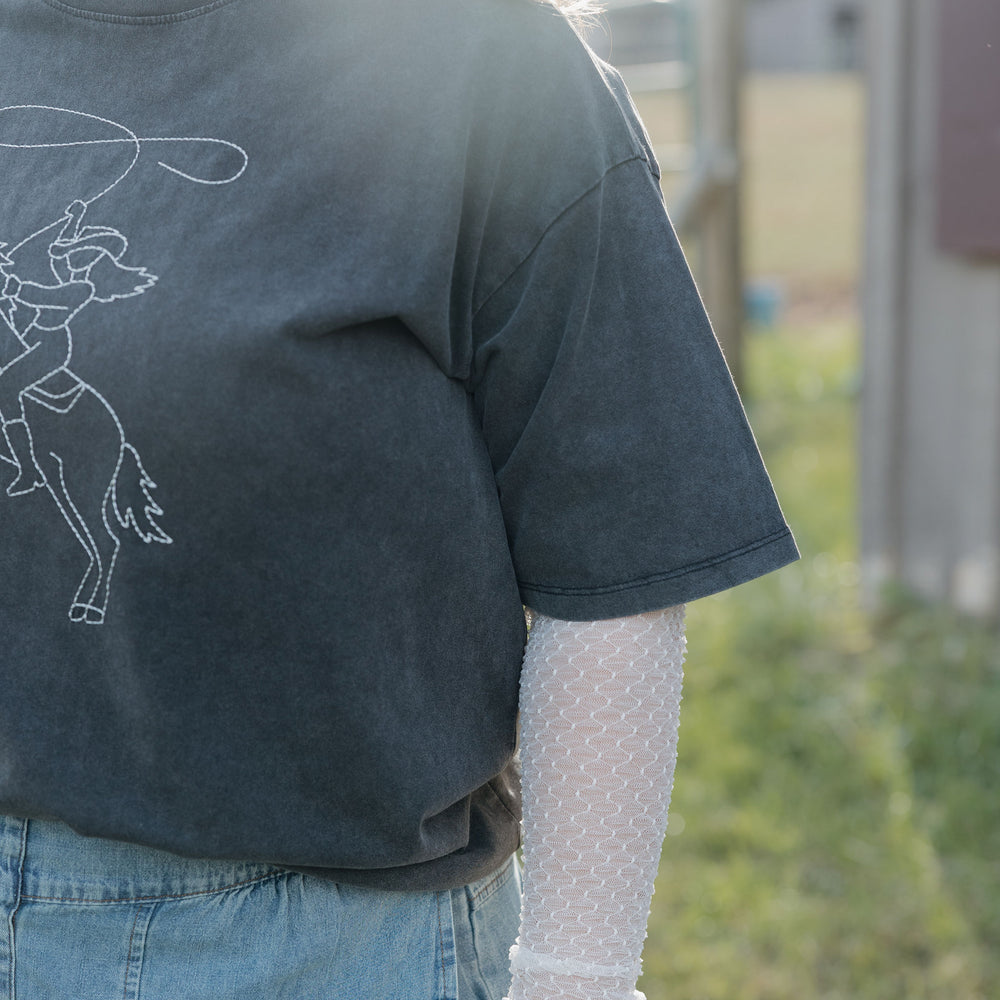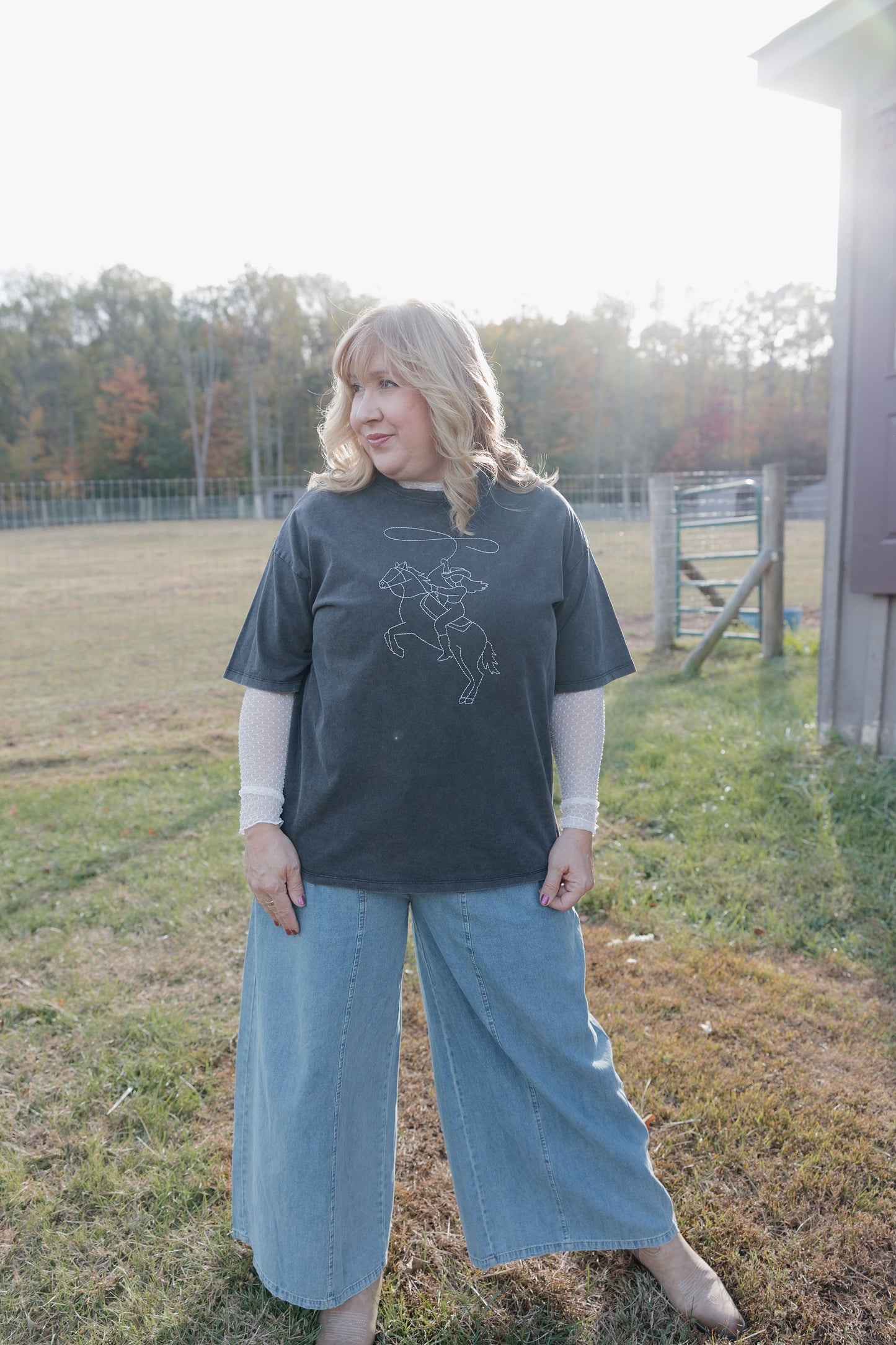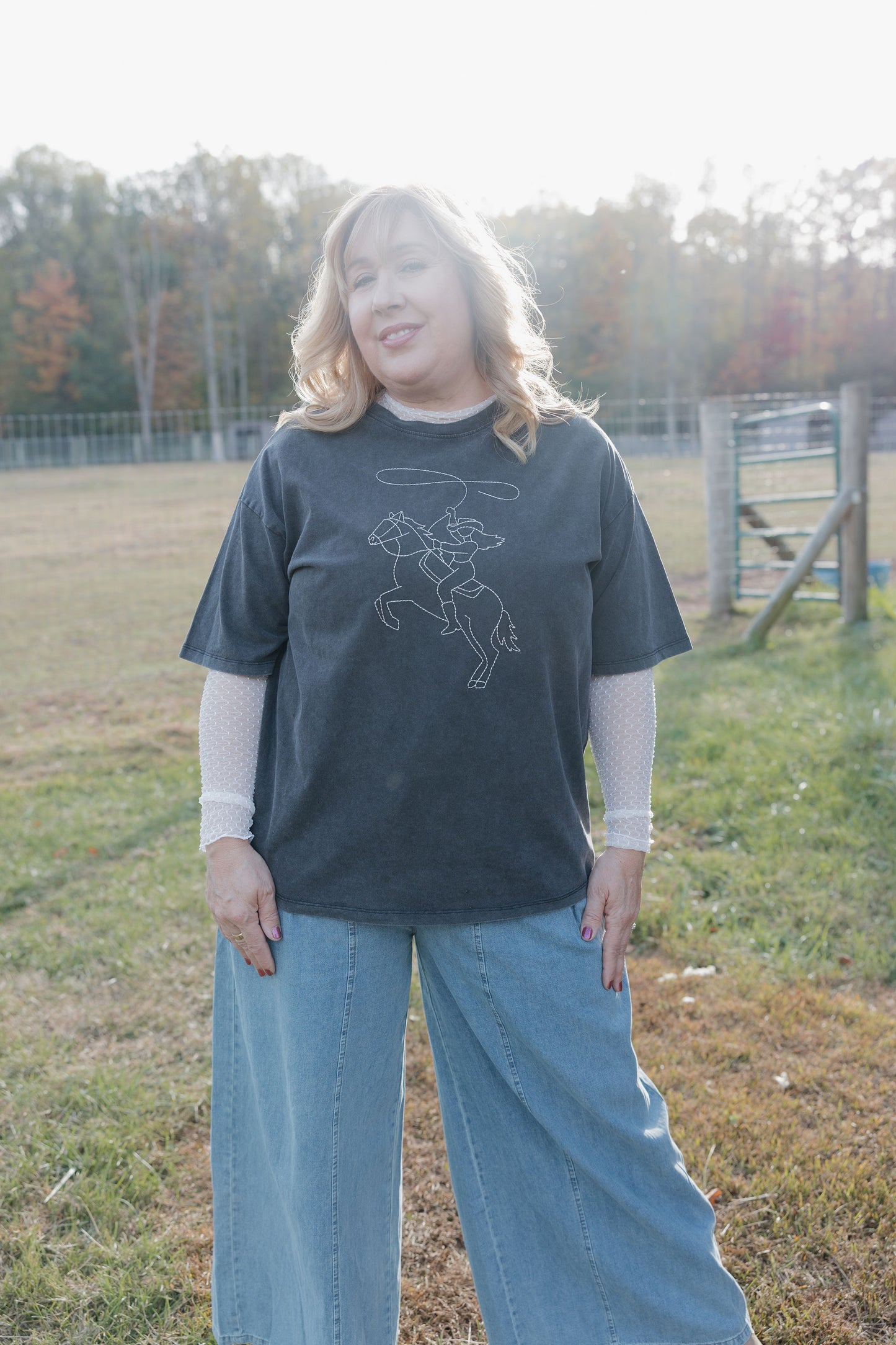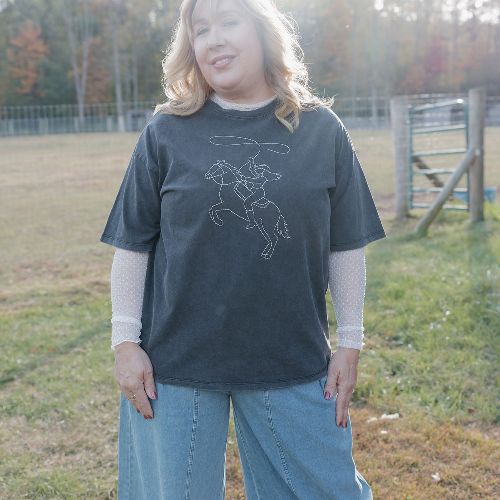 The Wrangle Up Tee comes in a black washed finish with charming white stitching. It features a cowboy on horseback, ready to wrangle cattle—making it a perfect match for denim or cream-colored bottoms.