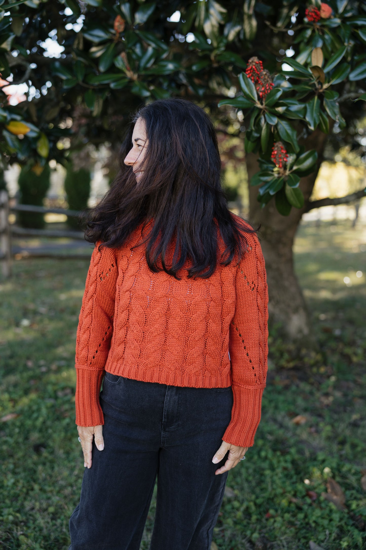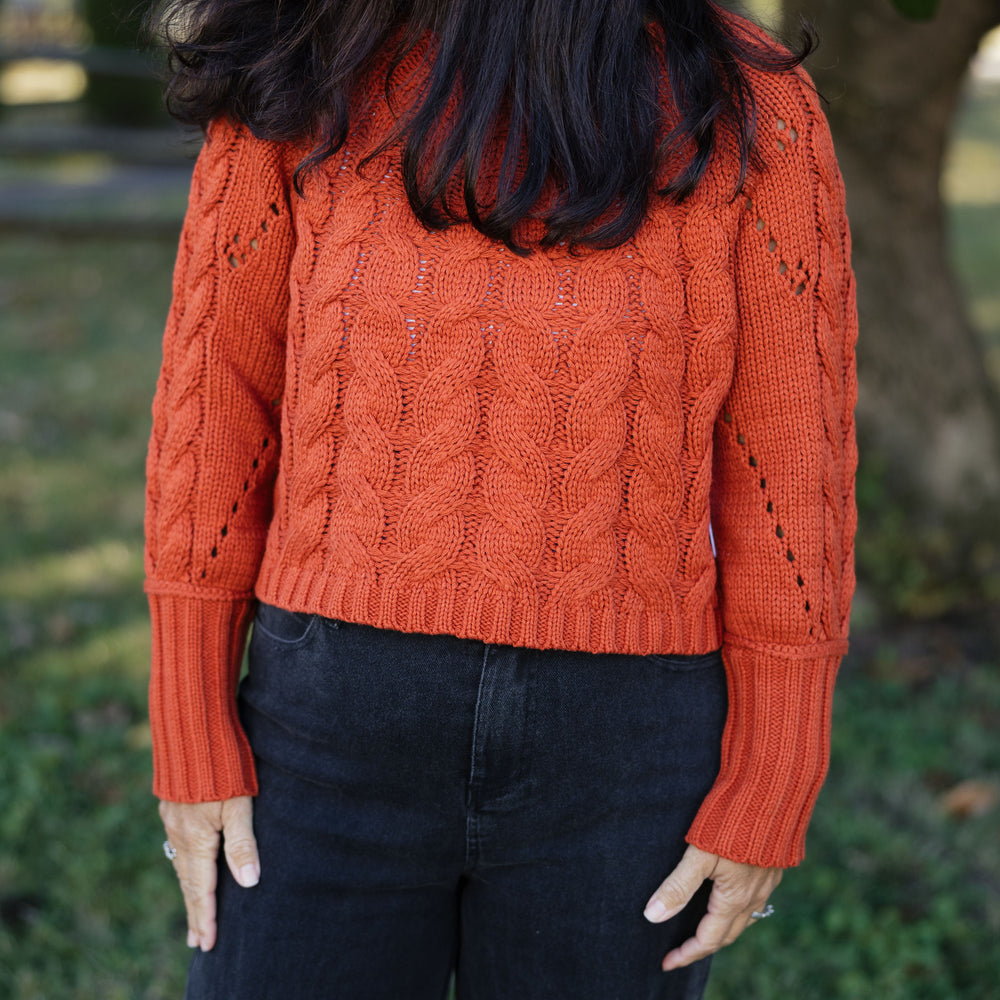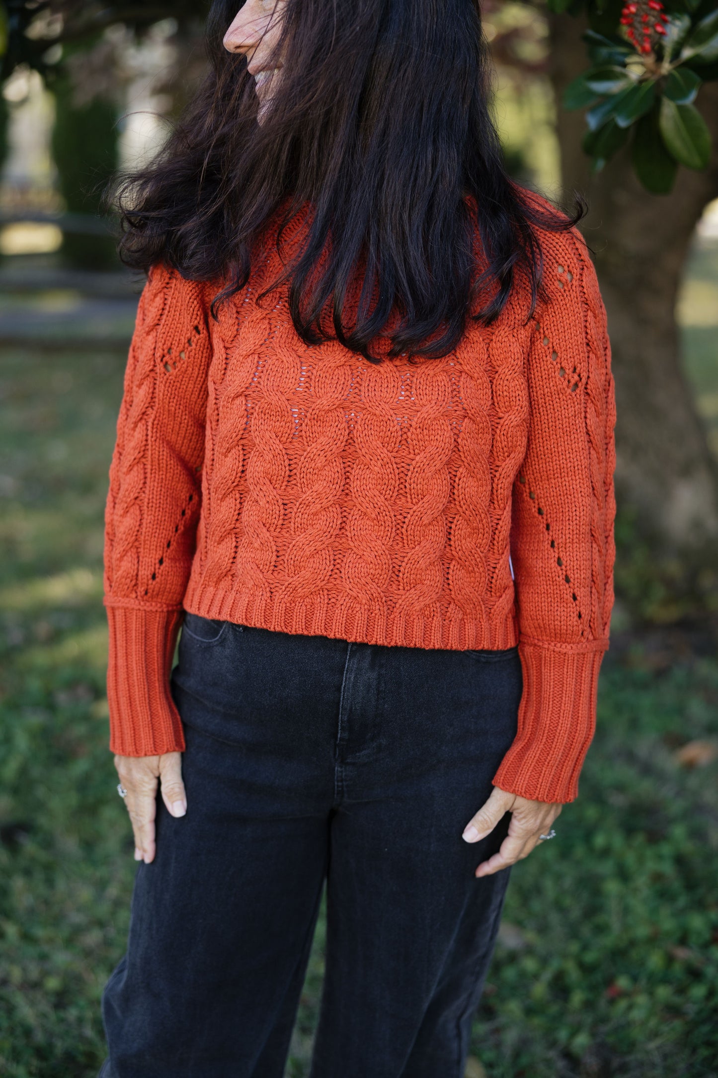 This cozy cable knit crewneck sweater keeps you perfectly comfy—warm without the heavy feeling. Its lively brick color pops, while the fitted waist and cuffs add a fun, flattering touch.