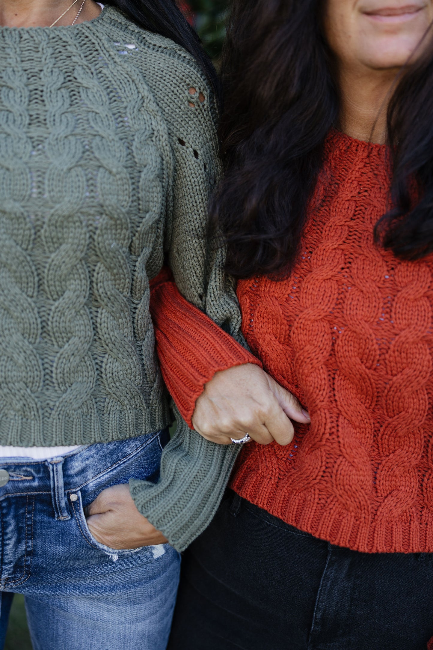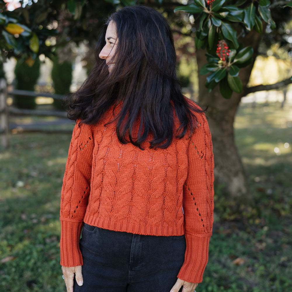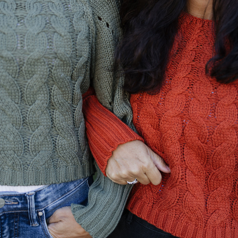 This cozy cable knit crewneck sweater keeps you perfectly comfy—warm without the heavy feeling. Its lively brick color pops, while the fitted waist and cuffs add a fun, flattering touch.