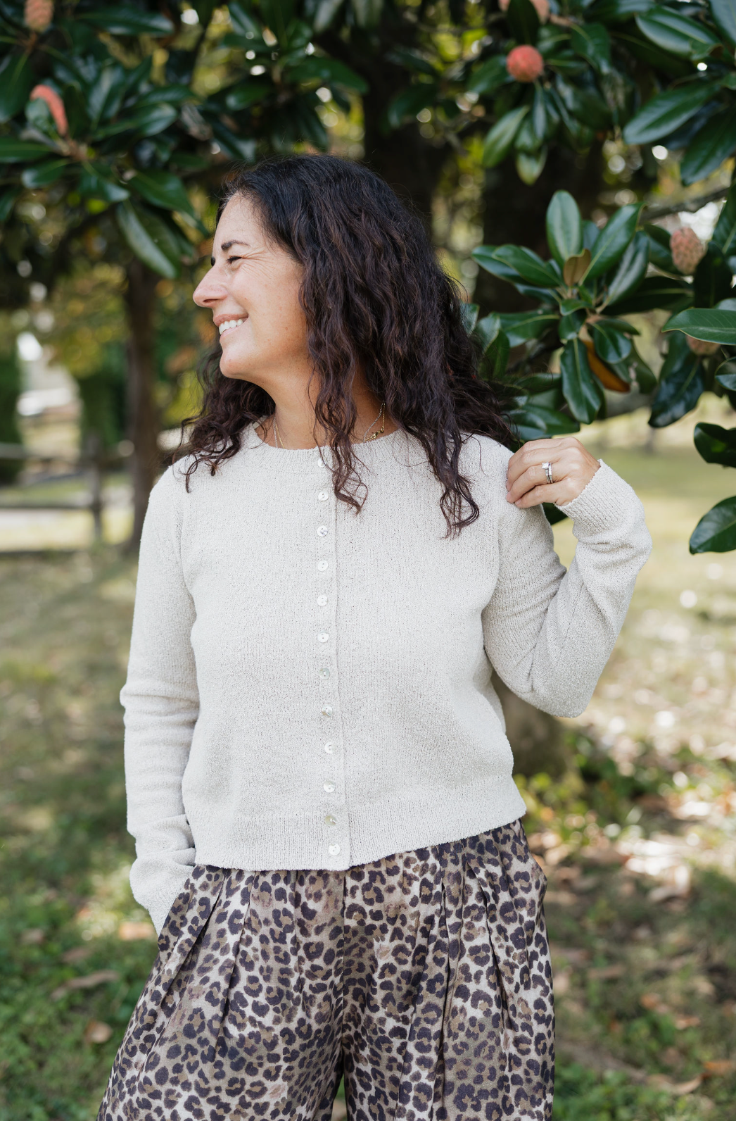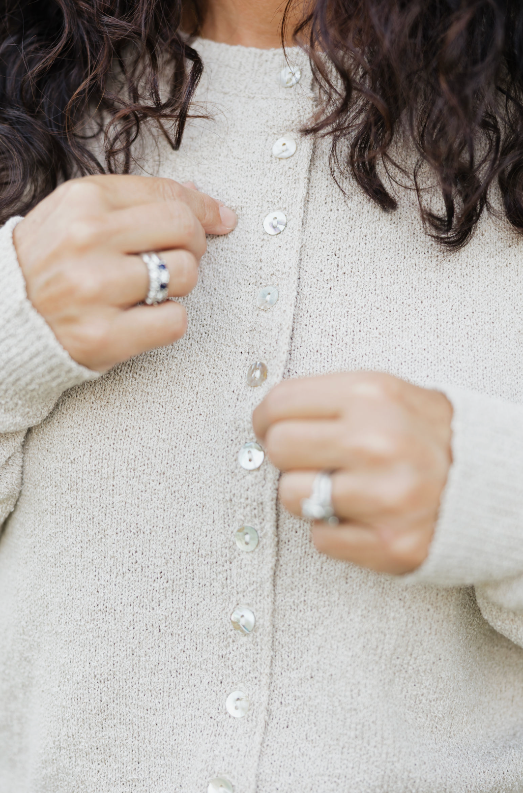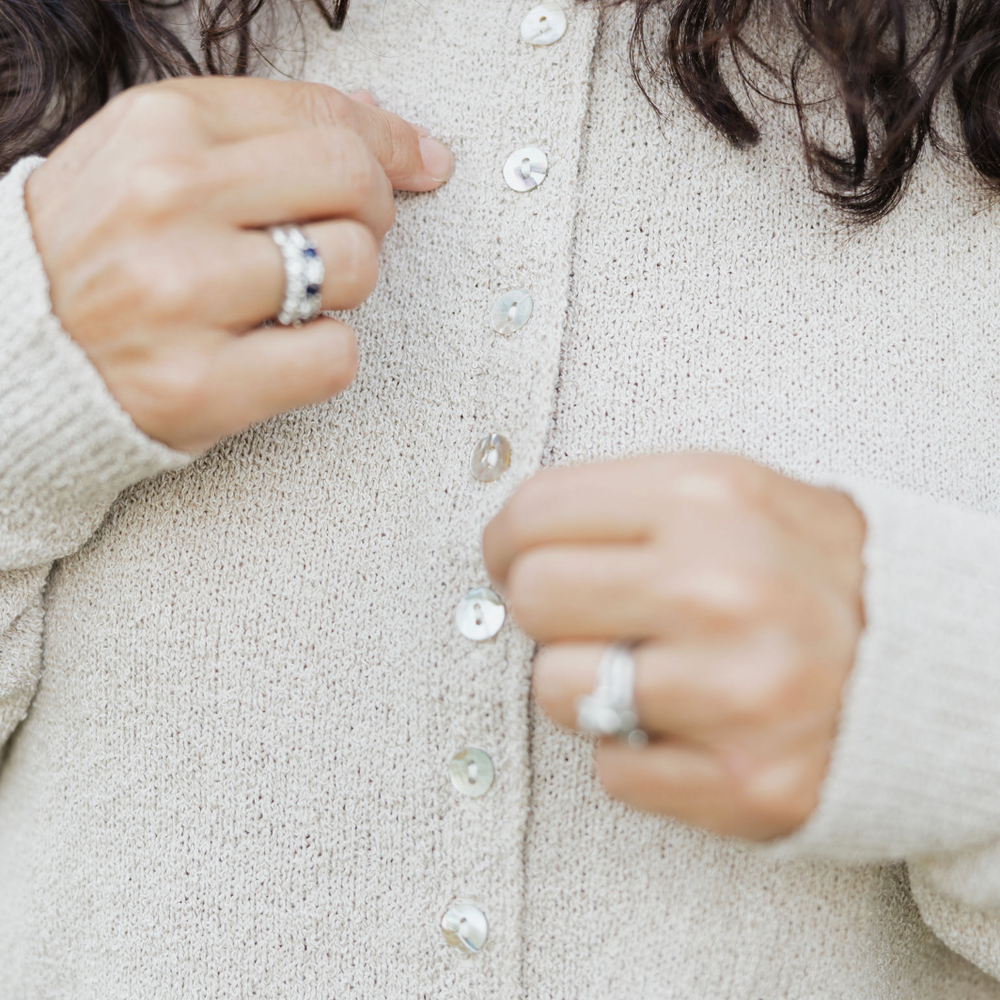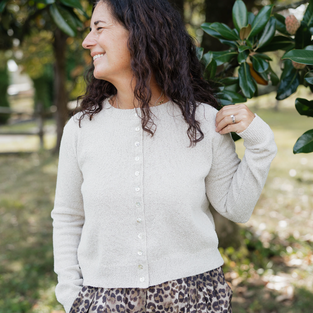 This oatmeal-colored knit button up sweater is delightfully soft and cozy, perfect to pair with jeans or a cute patterned dress.