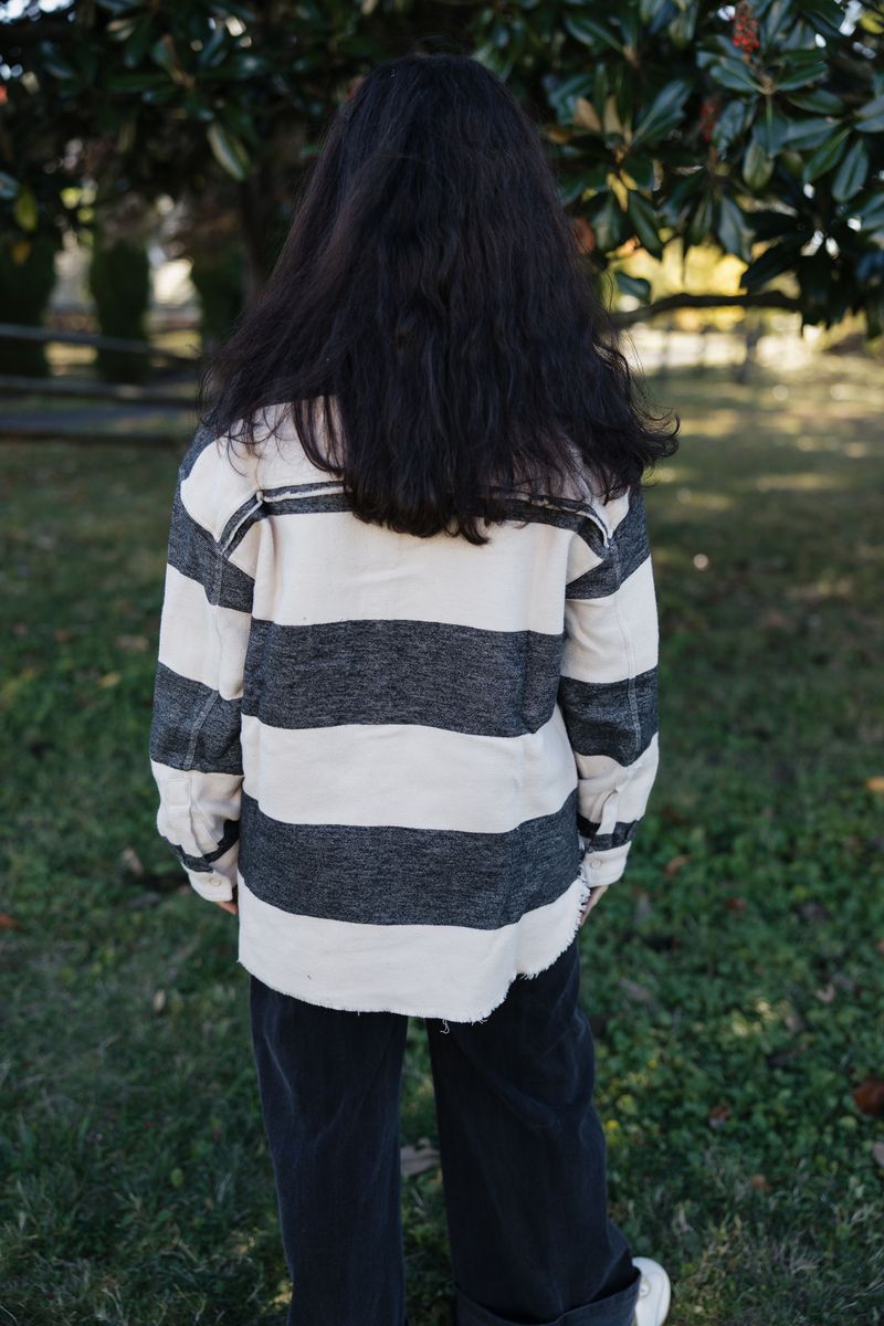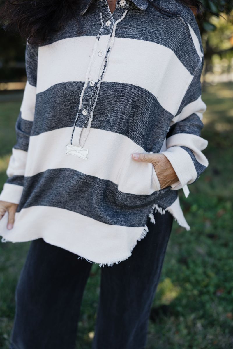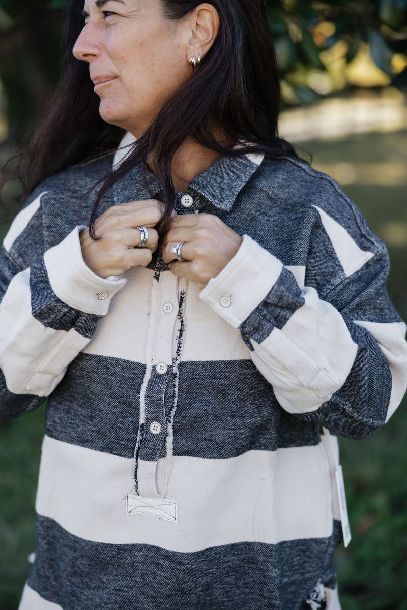 The Buffalo Quarter Button Up Top features bold black and cream buffalo stripes, complete with raw edges, a collar, buttoned cuffs, and handy pockets. Whether you rock it as a jacket or a standalone top, this soft 100% cotton beauty is a stylish win every time.