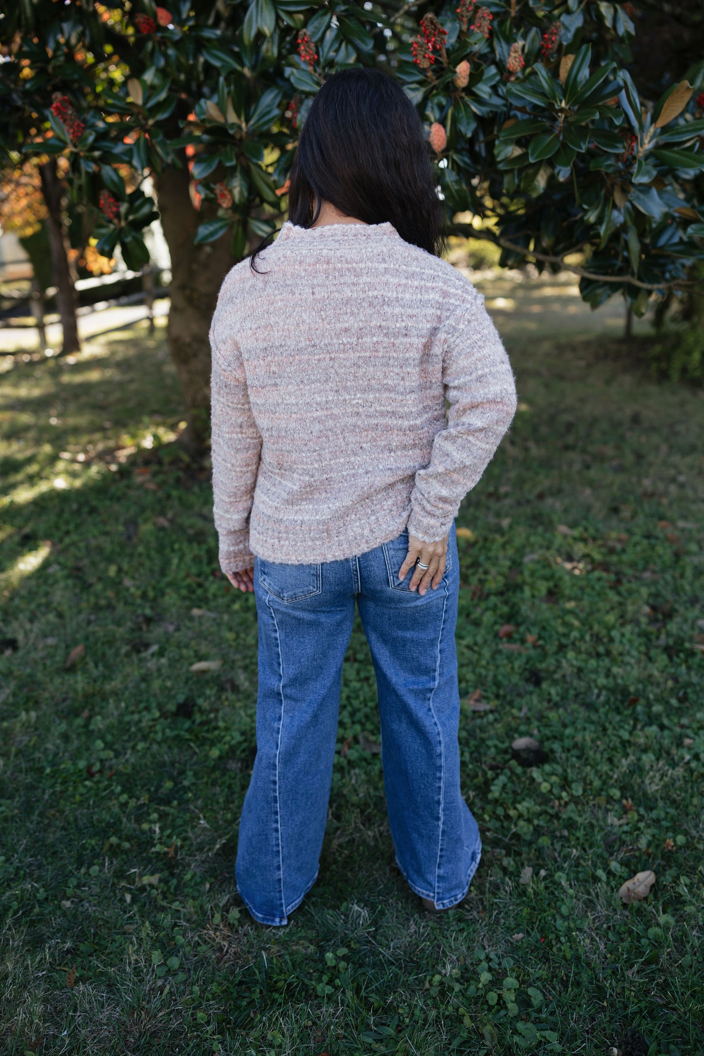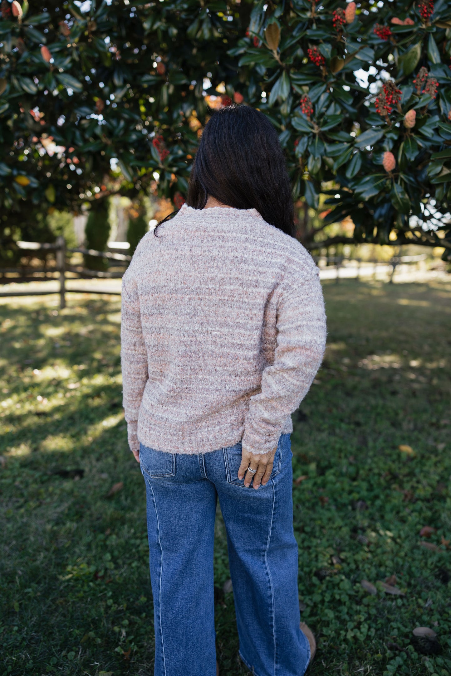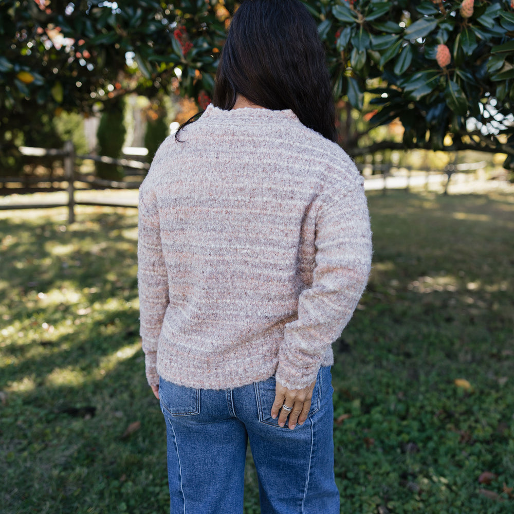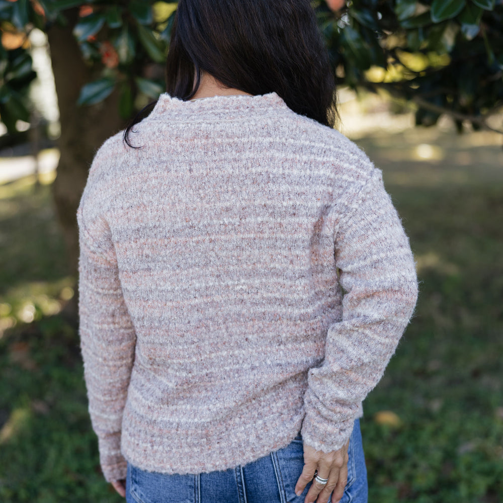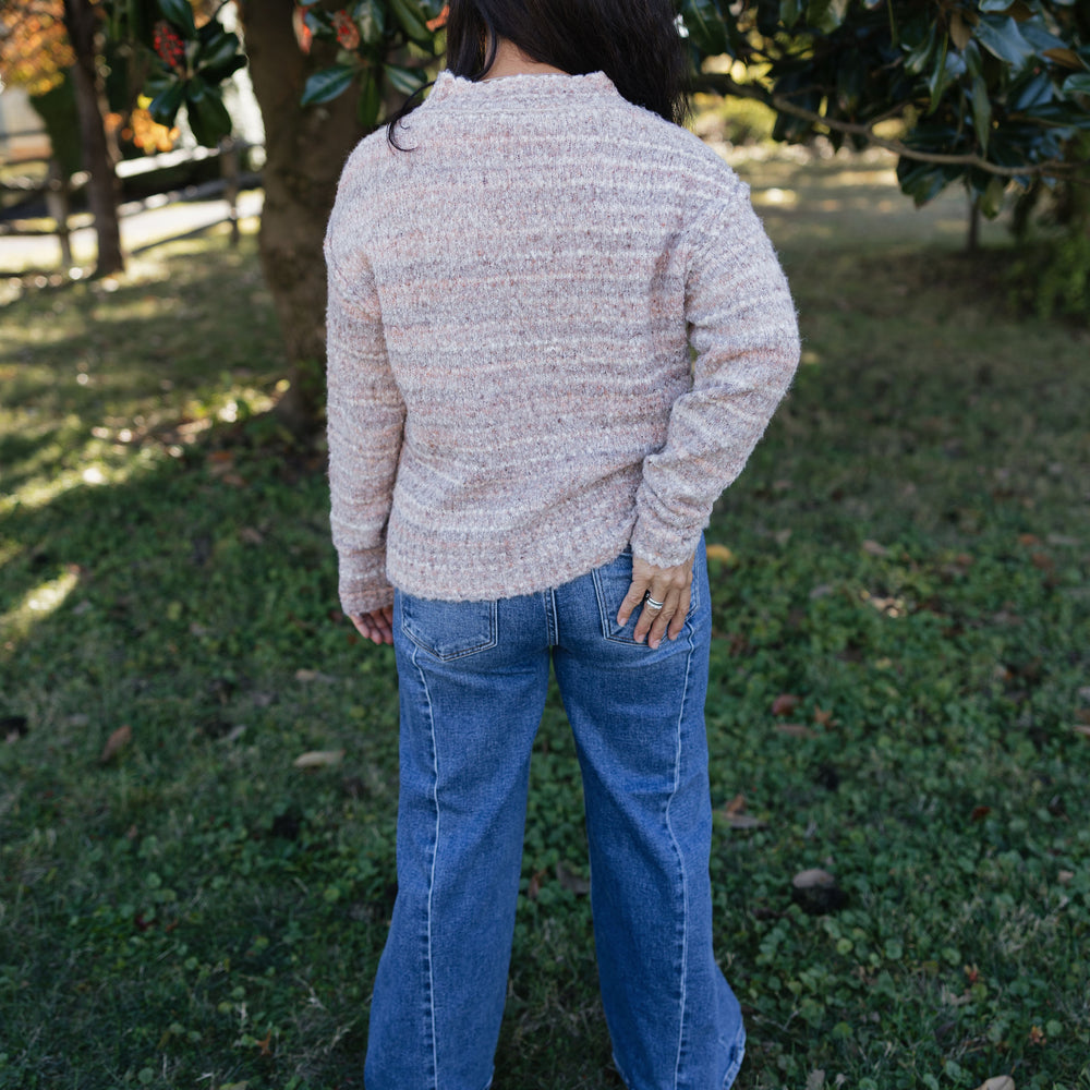 This gorgeous multi color boucle sweater is warm and cozy with soft fall colors. Rounded neck line and seaming detail. V-cut out in front. Pair this with denim and booties!