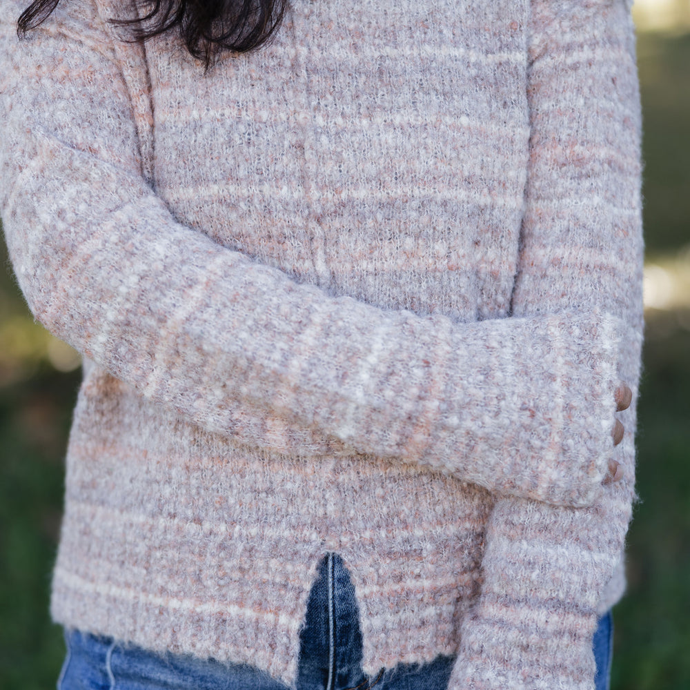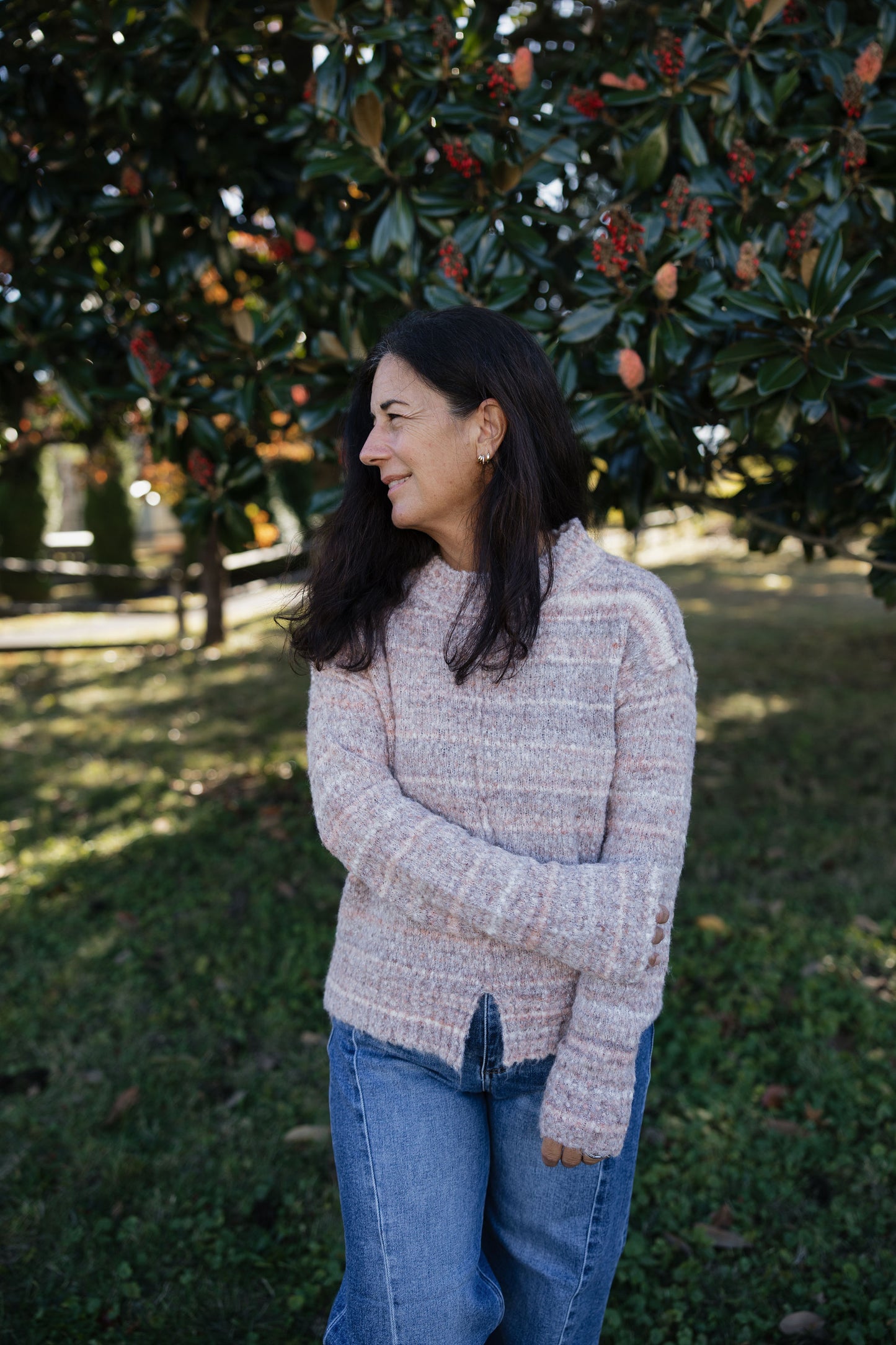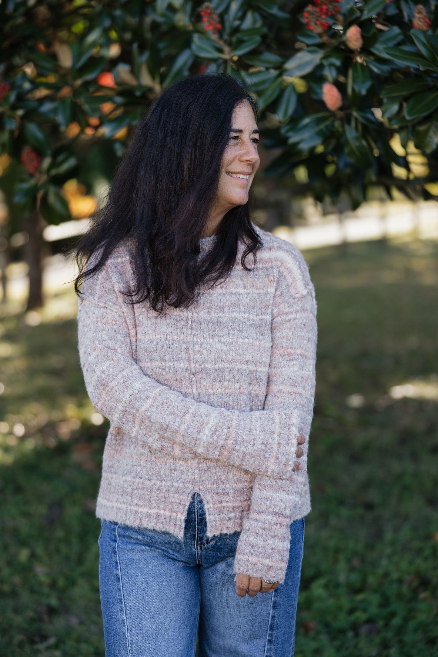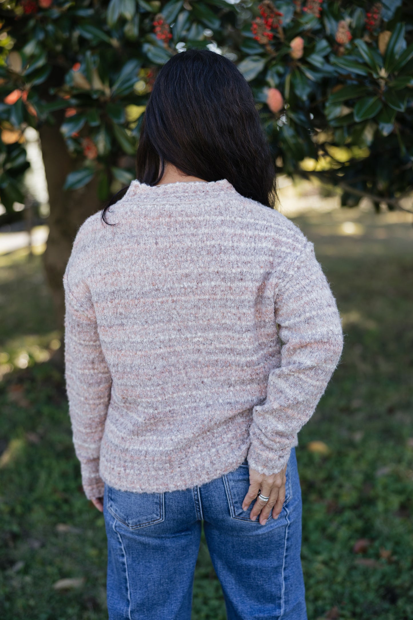 This gorgeous multi color boucle sweater is warm and cozy with soft fall colors. Rounded neck line and seaming detail. V-cut out in front. Pair this with denim and booties!
