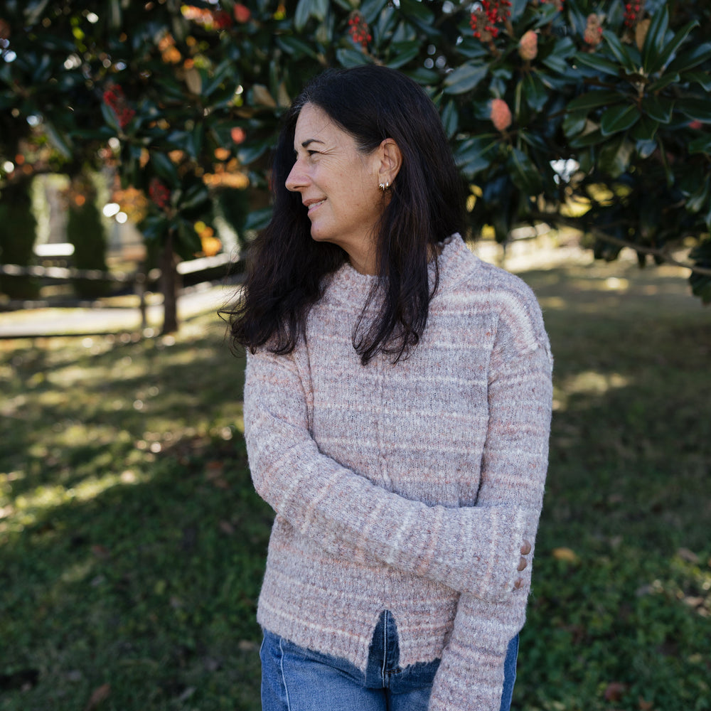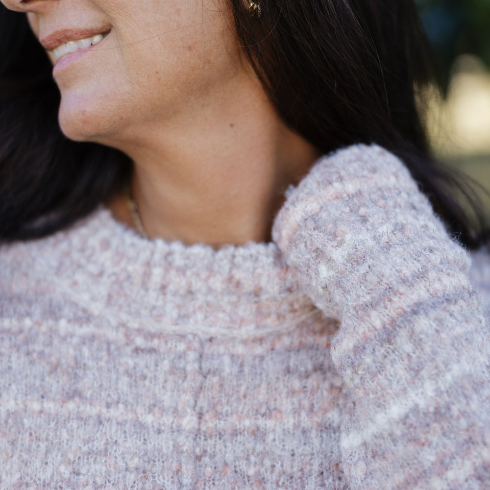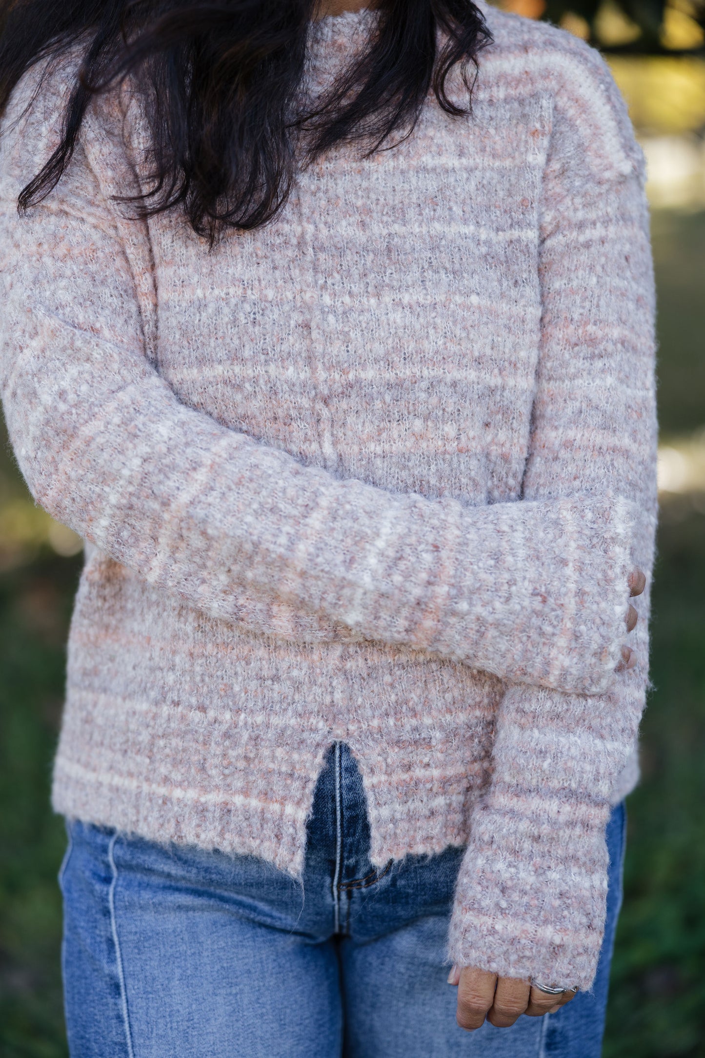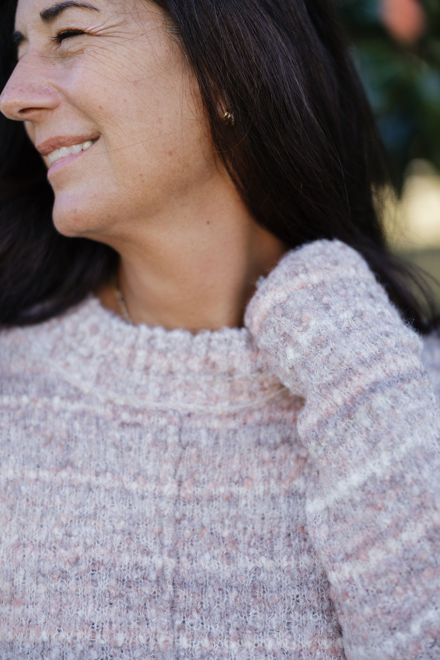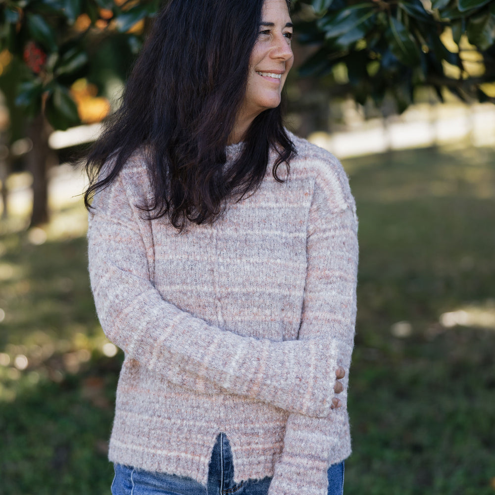 This gorgeous multi color boucle sweater is warm and cozy with soft fall colors. Rounded neck line and seaming detail. V-cut out in front. Pair this with denim and booties!