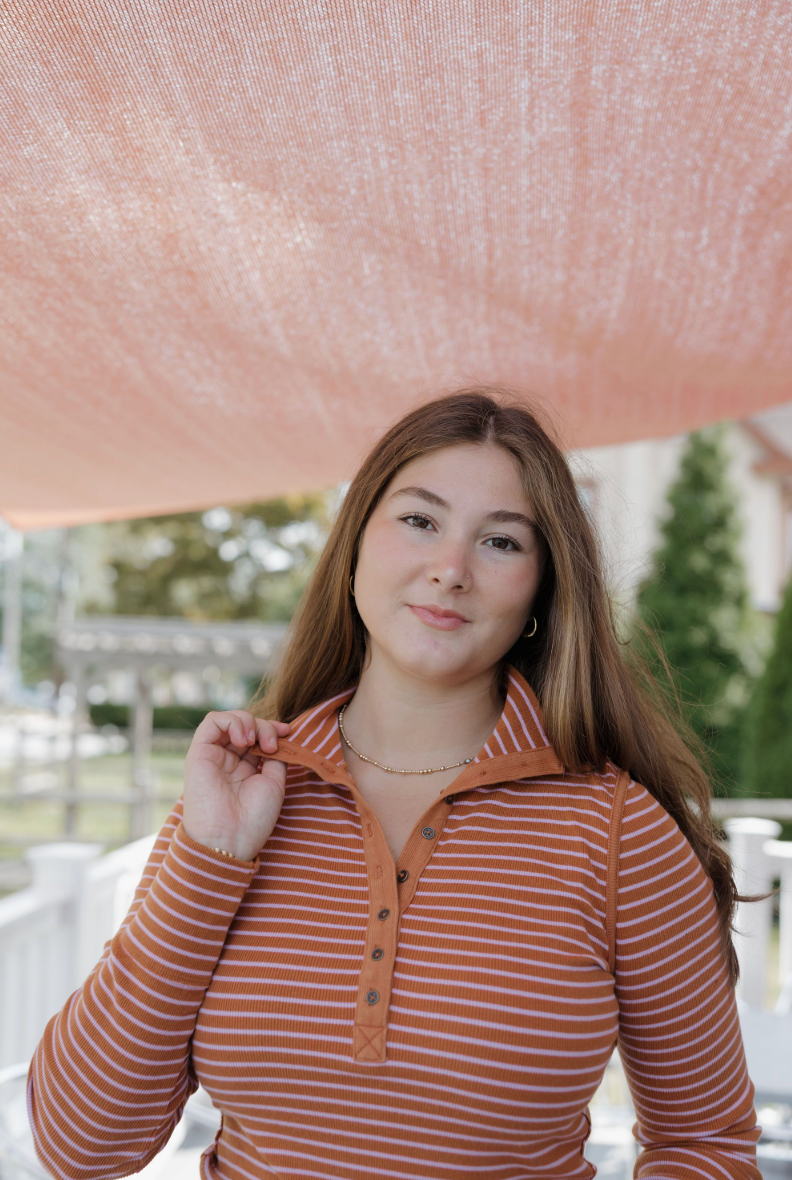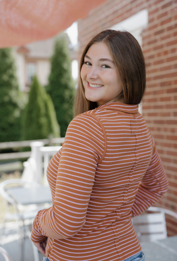 This Cinnamon combo striped button-up shirt features a luxuriously soft fabric and a refined mock neck collar for an elegant touch.
