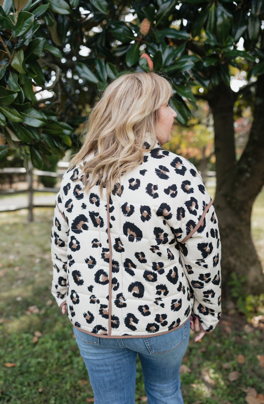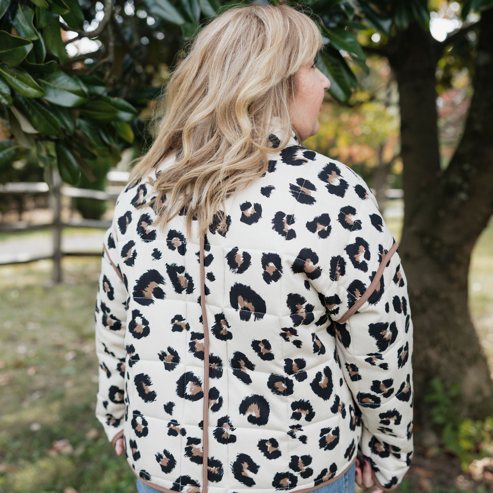 The Leopardess Jacket showcases a quilted leopard print design with contrasting accent binding. It includes front pockets and a front hook-and-eye closure. Fully lined and woven, this lightweight jacket offers non-sheer coverage, making it an elegant choice for fall or layering.
