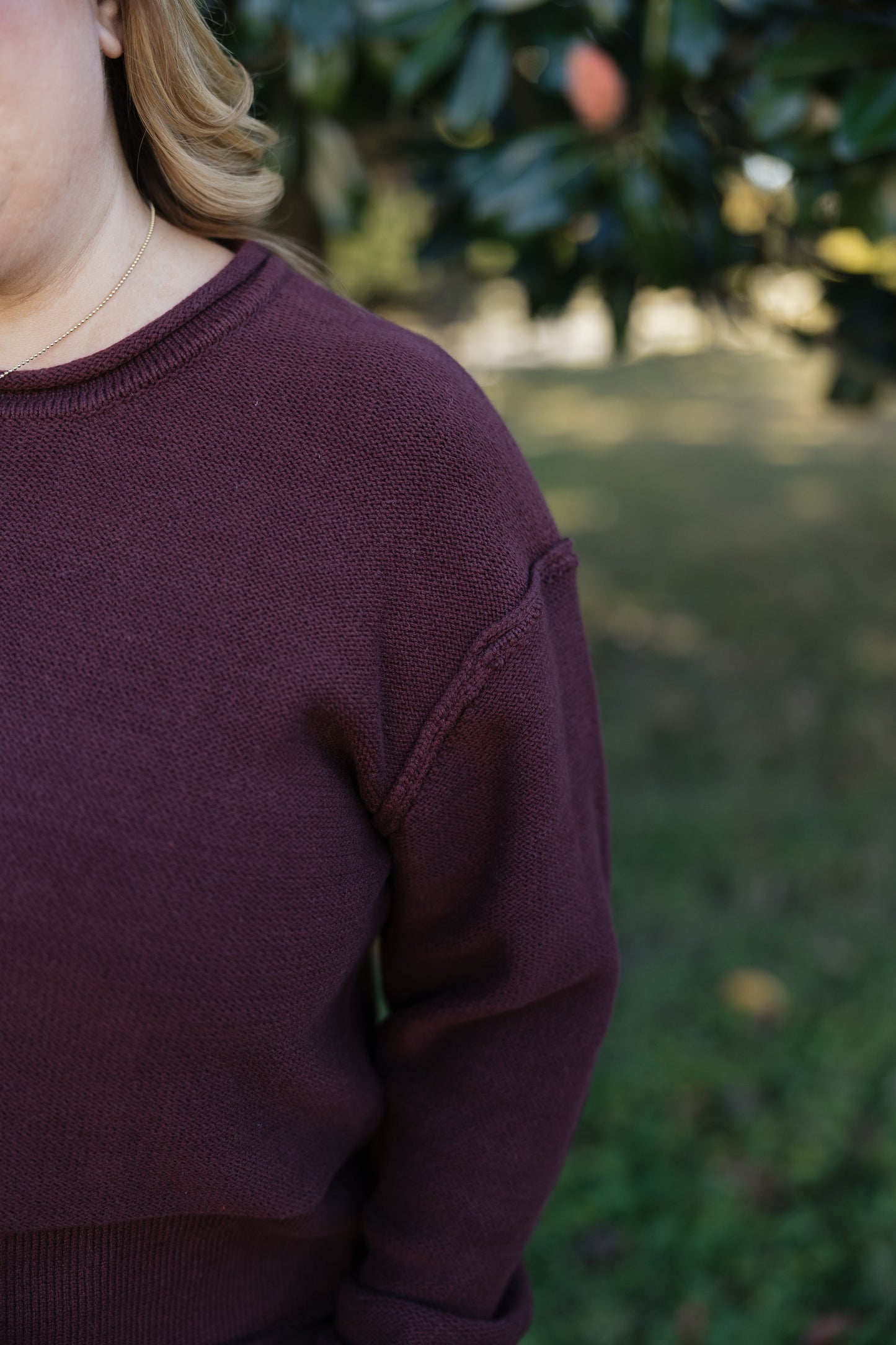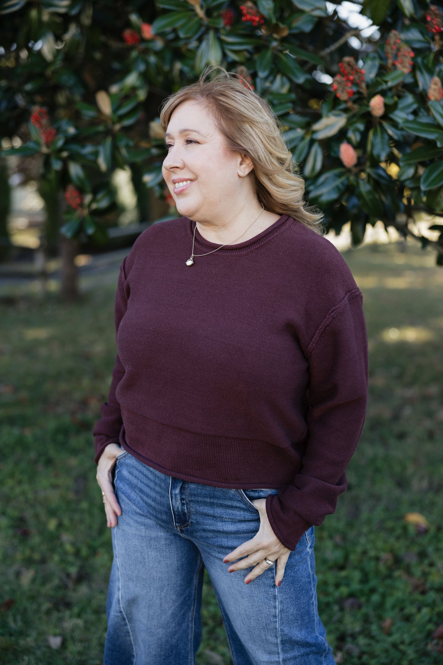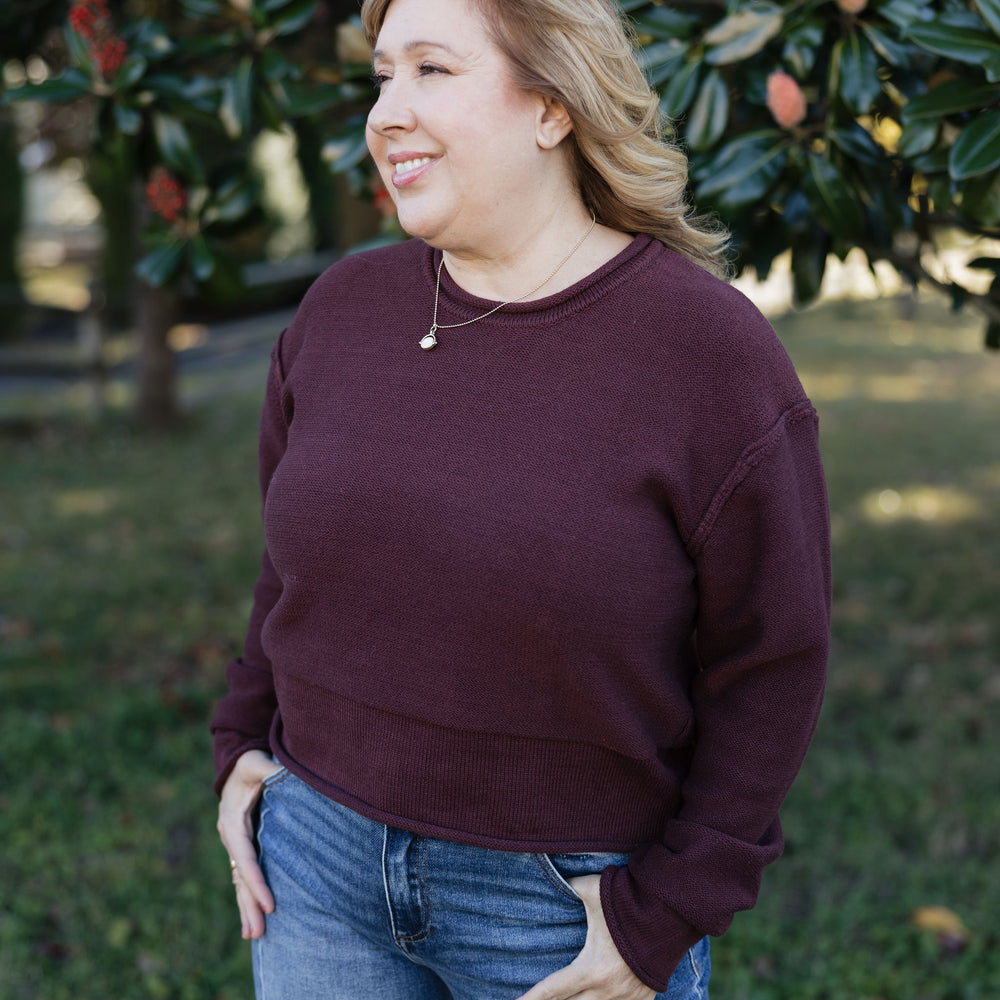 This playful sweater features a slightly cropped fit and charming rolled edge details on the long sleeves for a fun, stylish look.