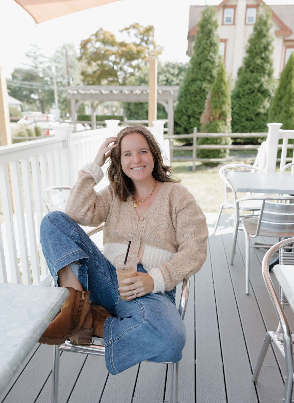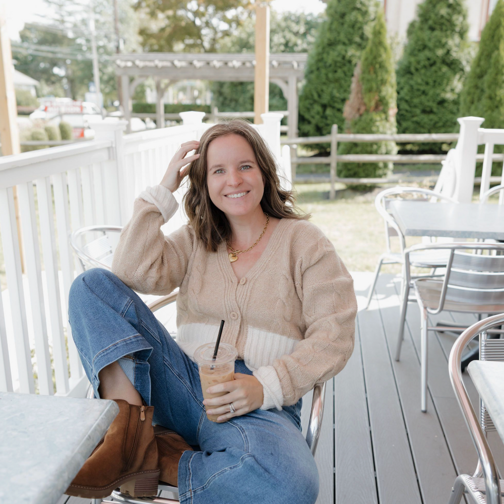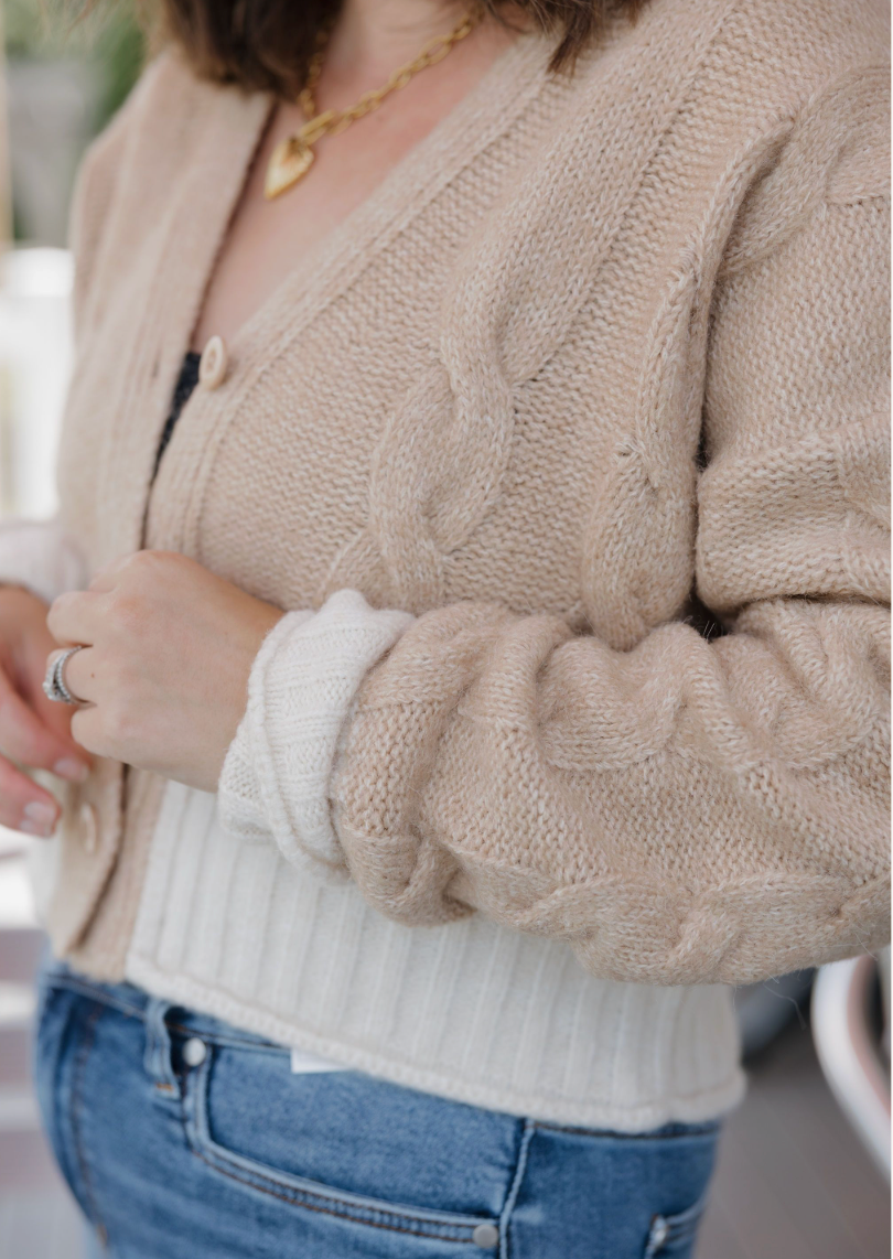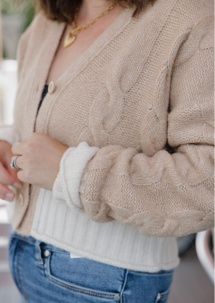 This warm tan cable knit cardigan has cream banded hem and cuffs. V-neck with matching buttons. Cropped to hit at the perfect length. Wear to work or casual. Warm and cozy for the fall and winter.