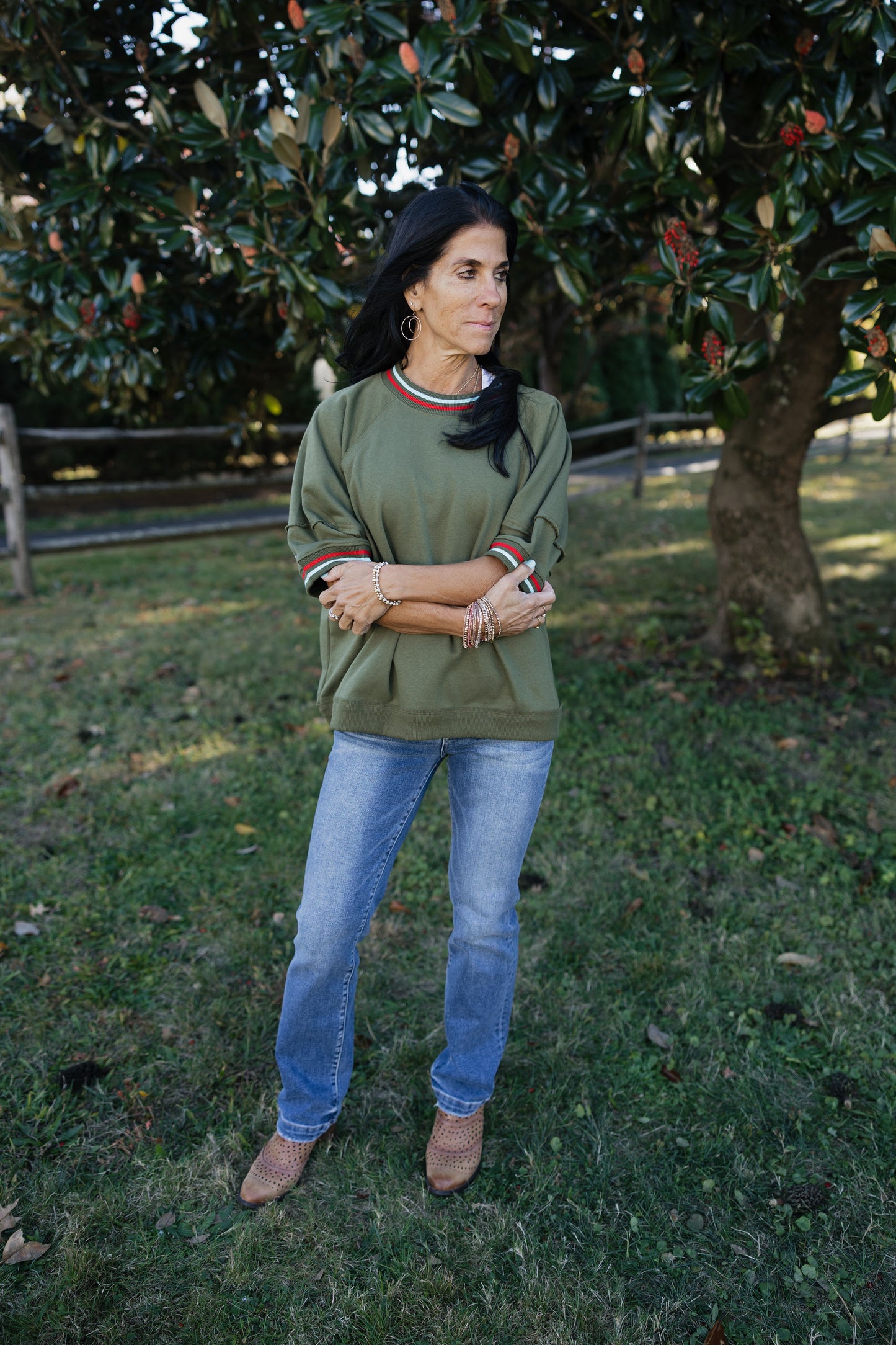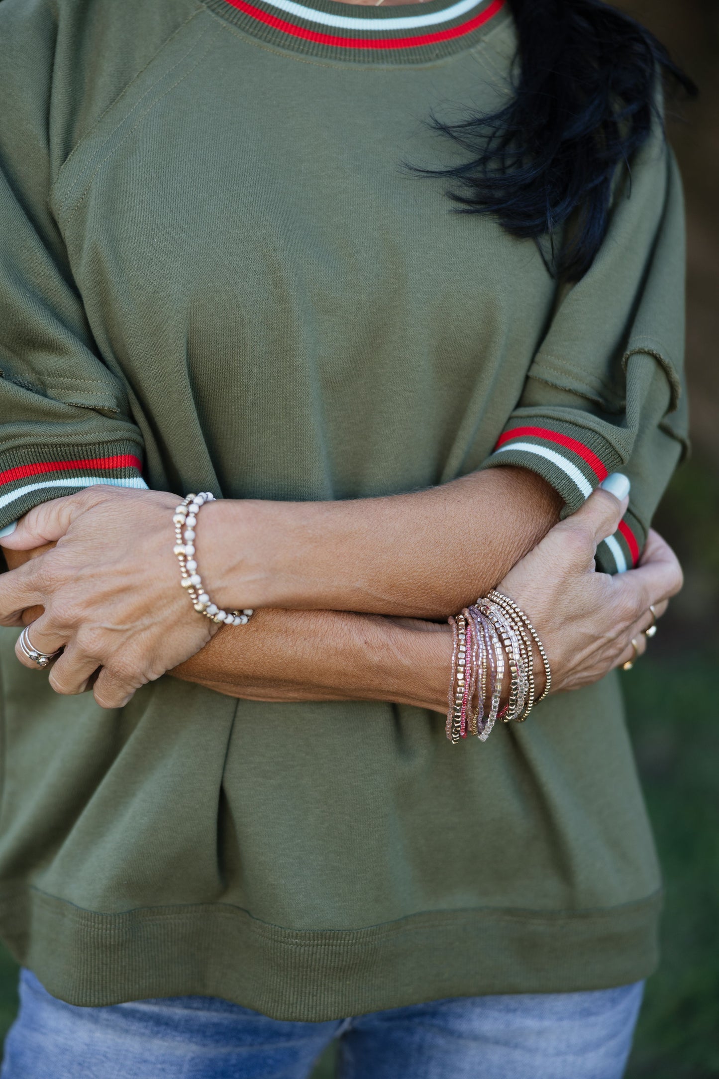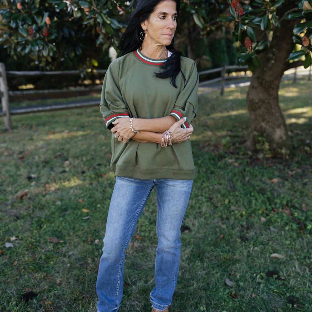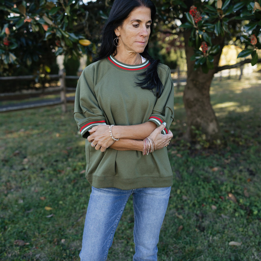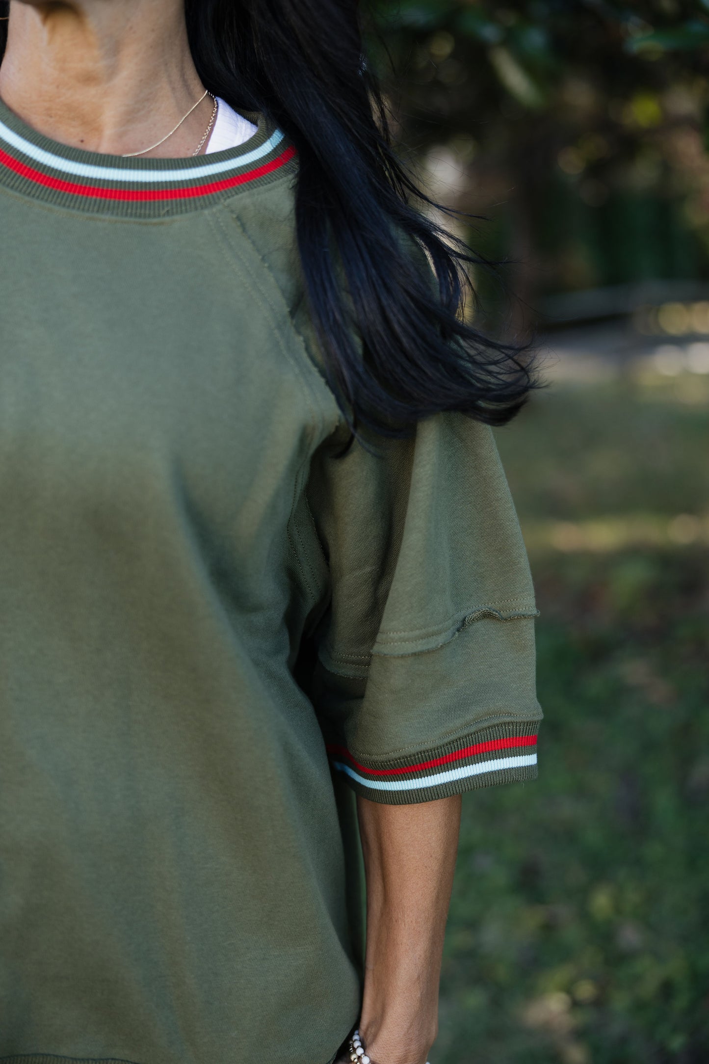Solid elbow-length raglan sleeve pullover knit top featuring multicolor band accent. Unlined. Knit. Non-sheer. Lightweight.