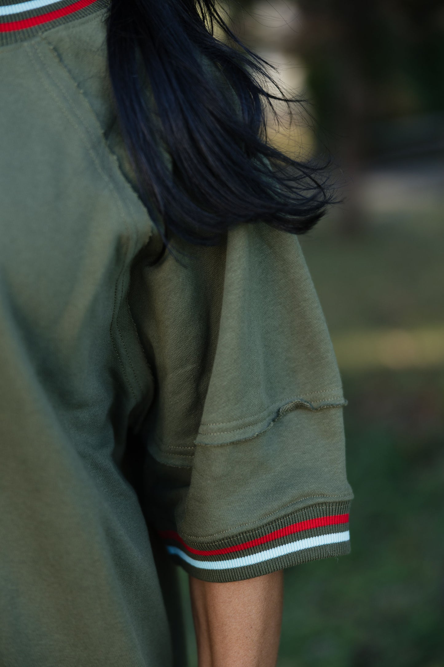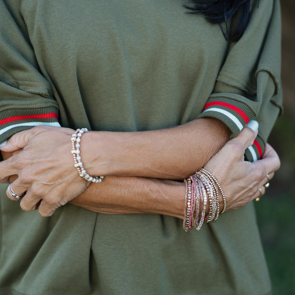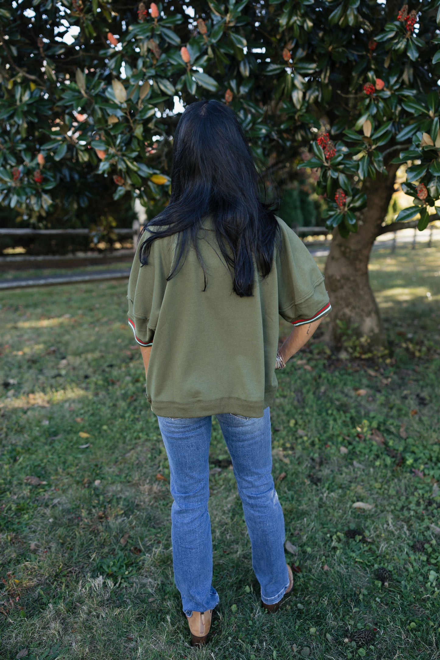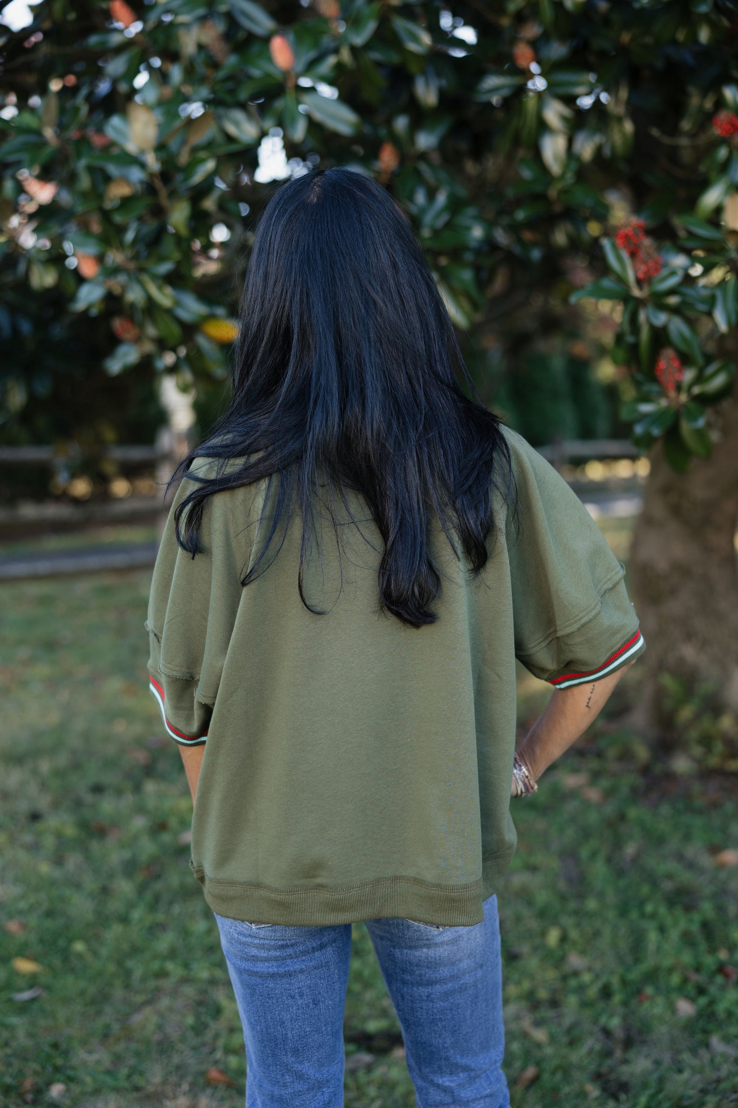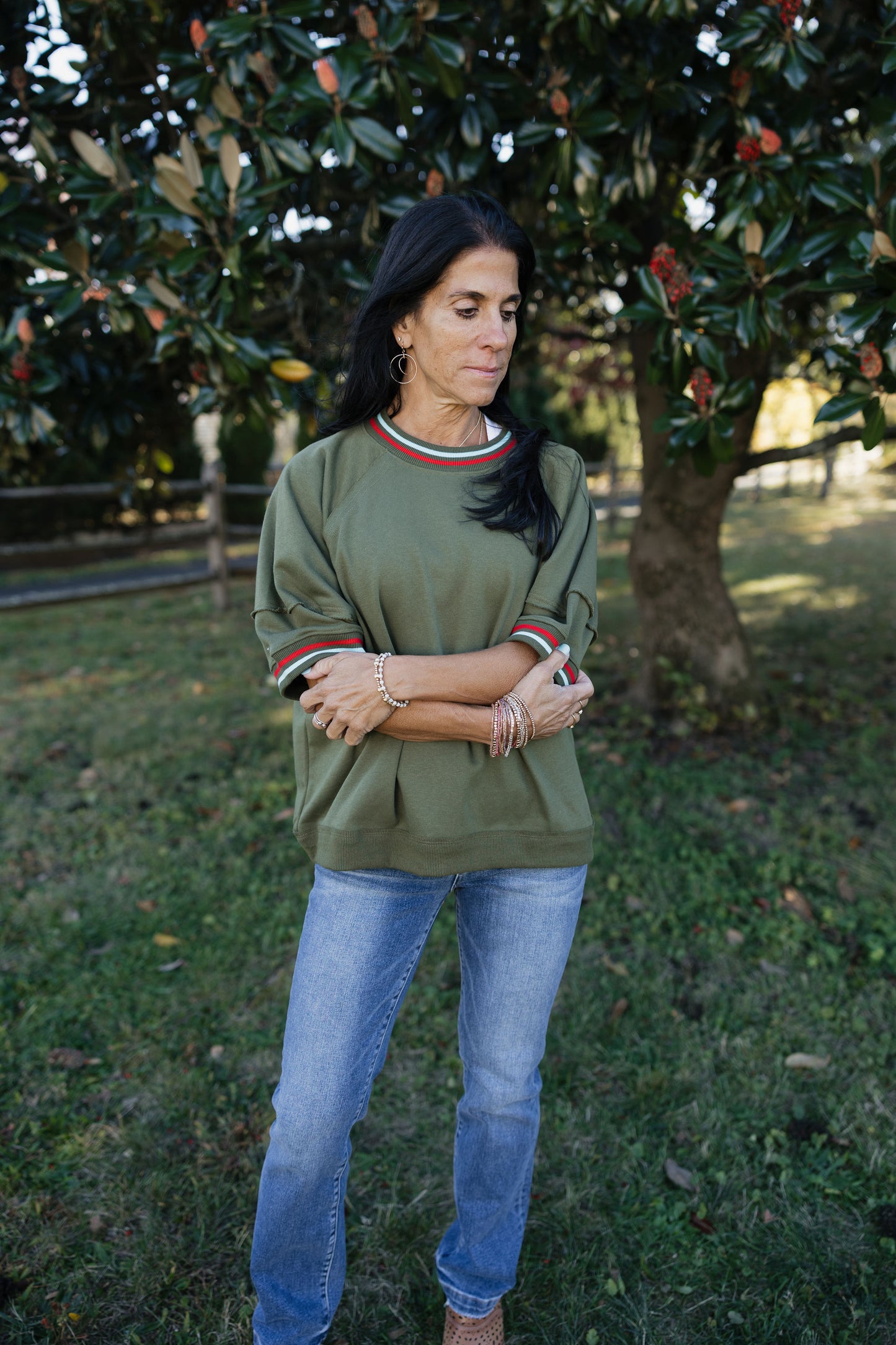 Solid elbow-length raglan sleeve pullover knit top featuring multicolor band accent. Unlined. Knit. Non-sheer. Lightweight.