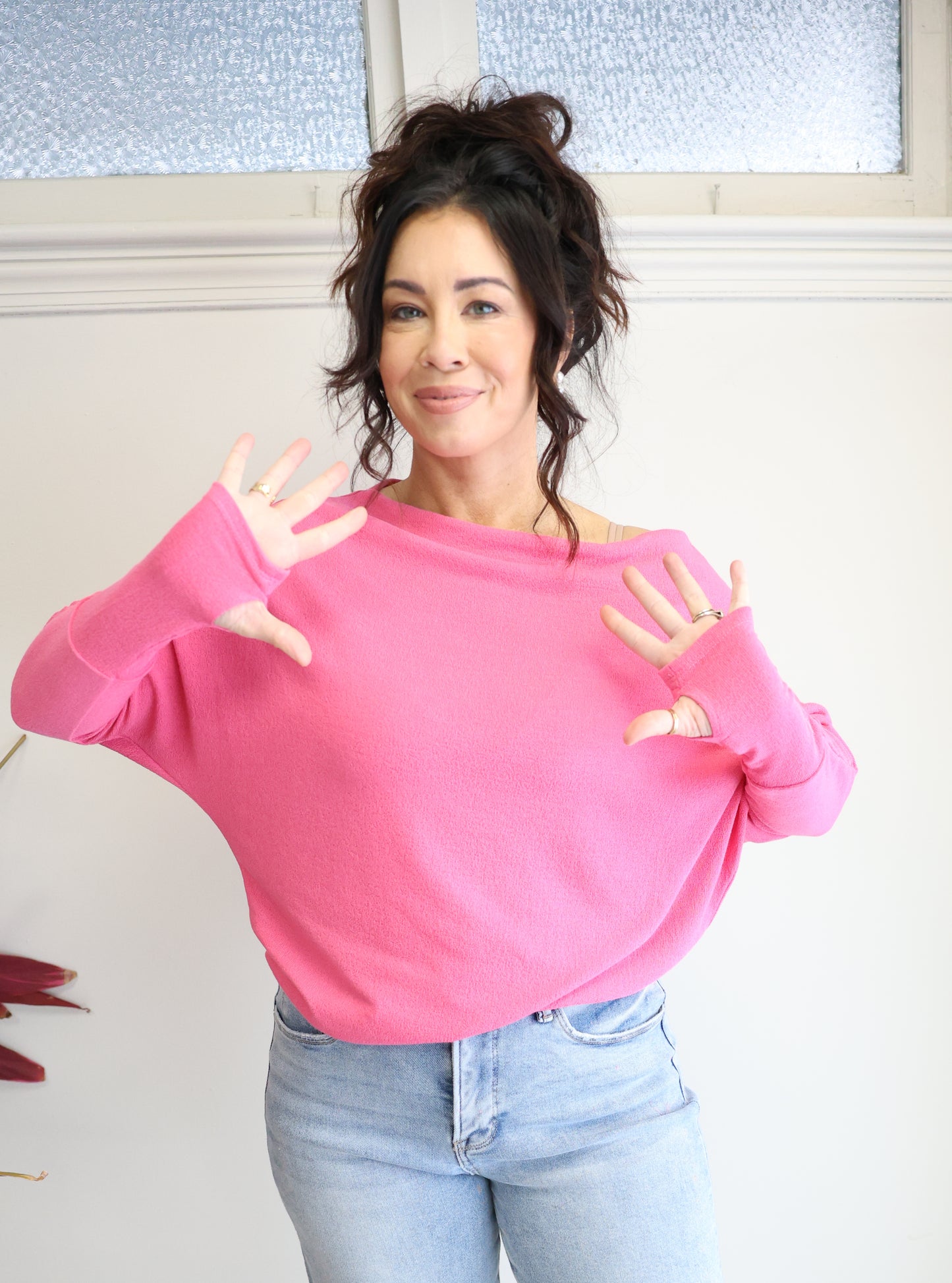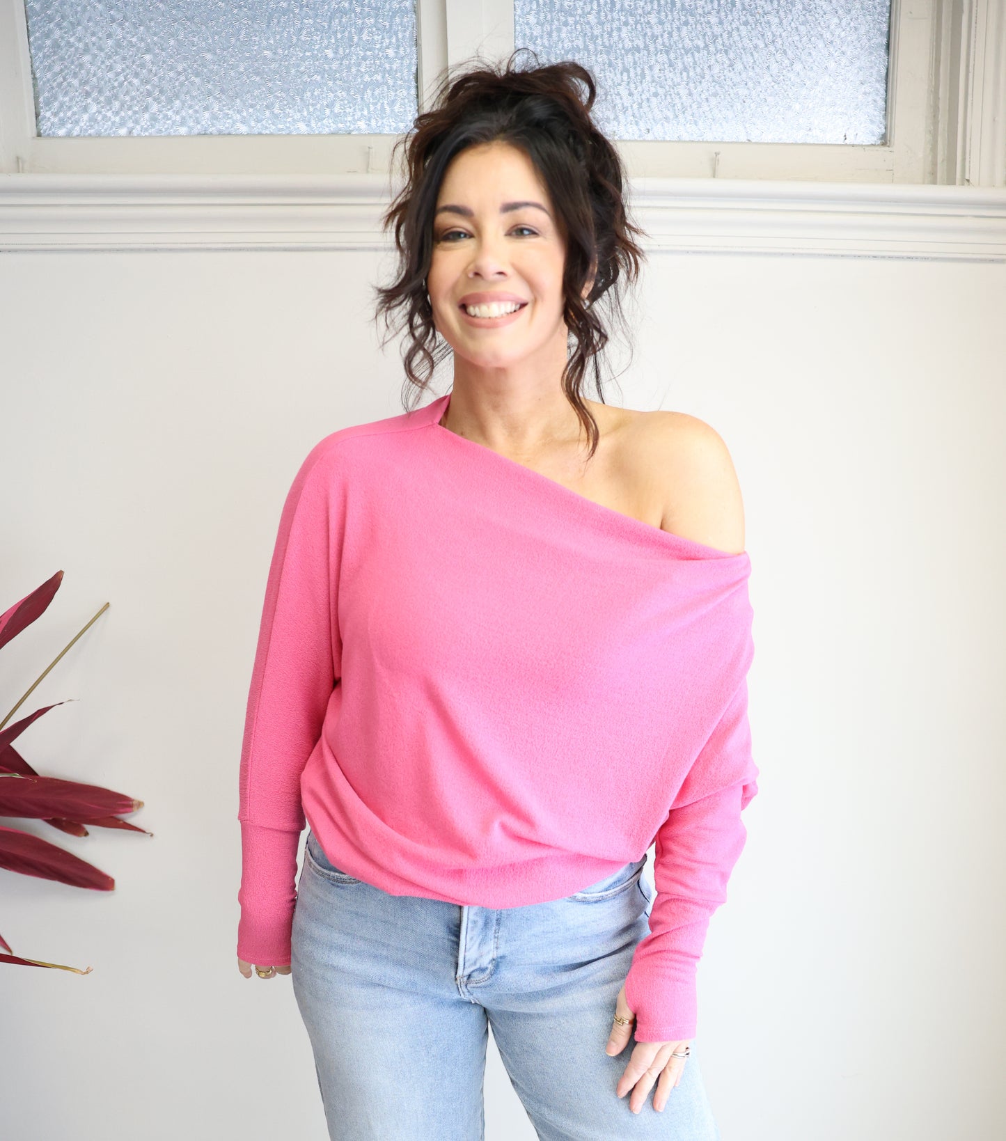 The Fearless (Anywhere Top) Off the Shoulder Sweater by Six Fifty is perfect for date night or drinks with the girls! Seam down the back Dolman Sleeves. Thumbholes