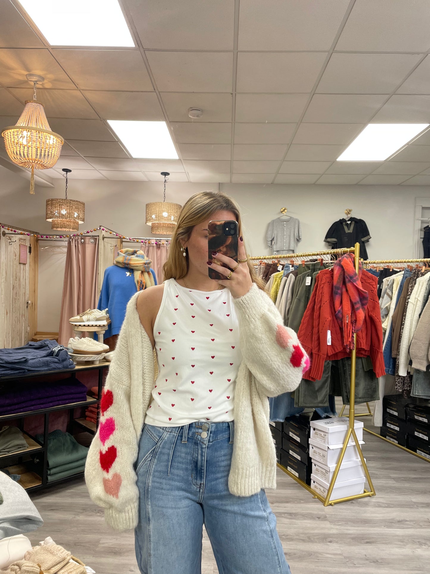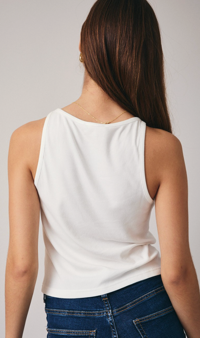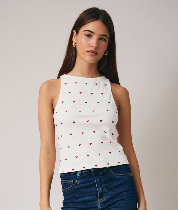 Feel the love with this crisp white tank featuring a classic ribbed boat neckline and delicate embroidered red hearts. Perfect for layering or wearing solo, this playful piece brings a touch of whimsy to your everyday wardrobe. The structured ribbed fabric keeps its shape while the sweet heart details add personality to any casual look.