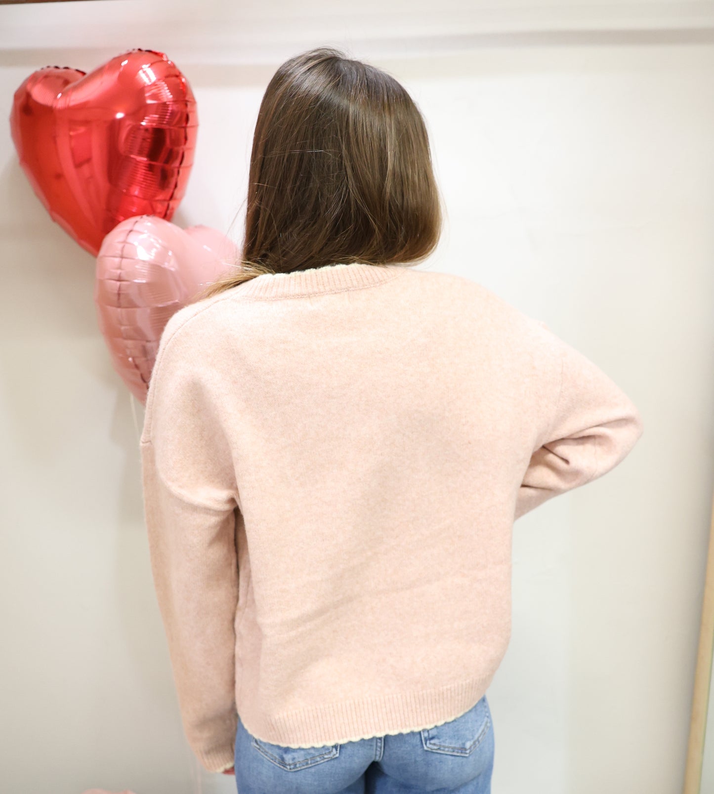 This playful pink sweater features a charming contrast knit with scalloped edges for a fun twist. The heathered knit adds texture, while the round neck and drop shoulder long sleeves keep it cozy. Details like scalloped edges on the cuffs and hem, plus ribbed finishes, give it a delightful, whimsical touch.