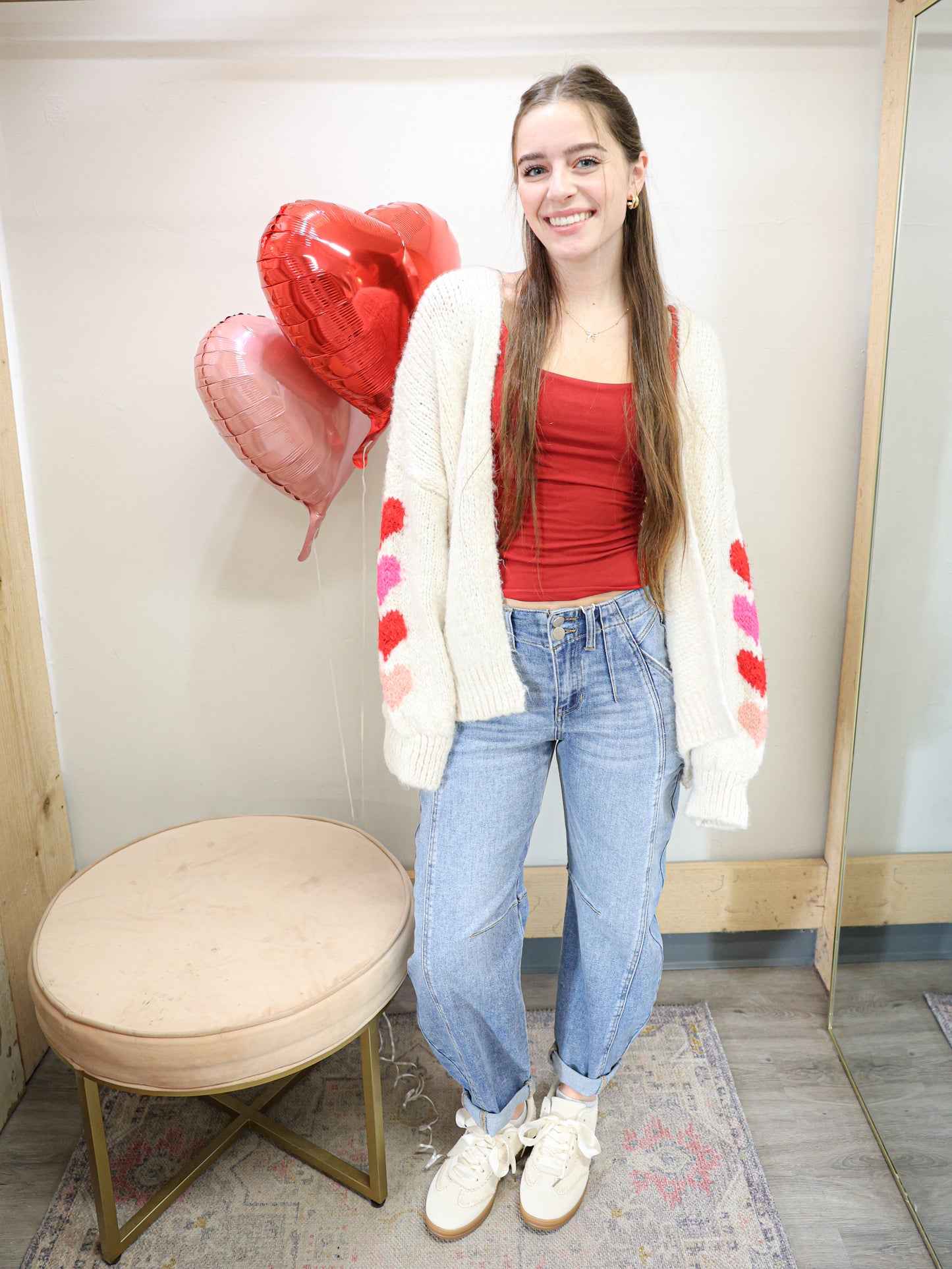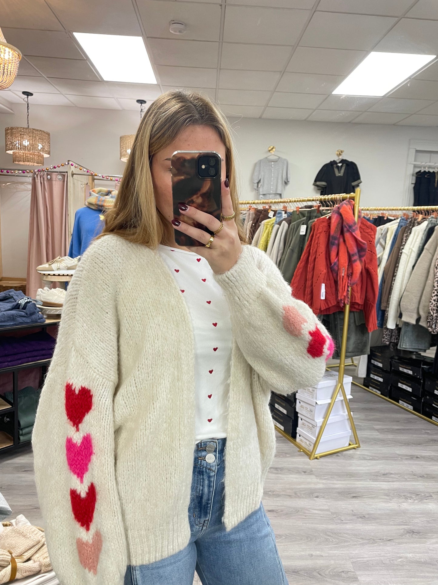 Ecru with Red and Pink Heart Jacquard Cardigan. Layer over a turtleneck or tee and you are set for Valentine's Day or any Winter Day that you want spread a little cheer.