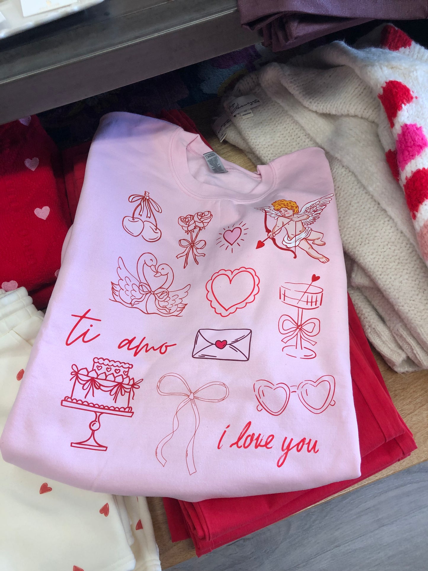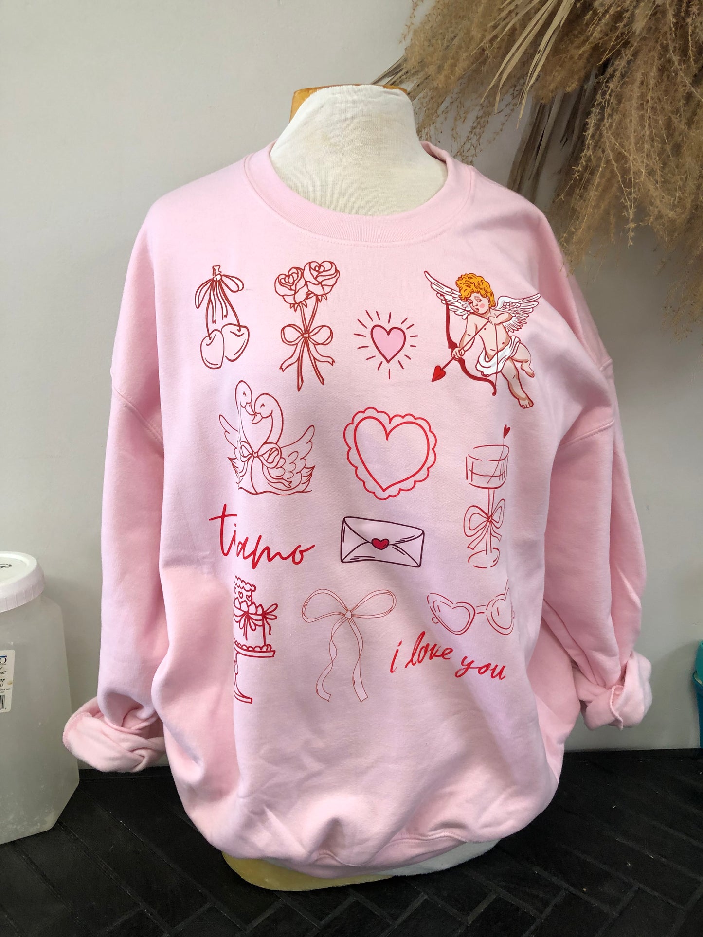 Spread the love in this oversized pink fleece sweatshirt featuring whimsical cupid and valentine doodles. Perfect for anyone who embraces their romantic side with a dash of humor, this unisex crew delivers cozy comfort with charming character. Soft, roomy fit makes it ideal for layering or lounging—a playful staple that celebrates the season with style. This is custom made piece just for Piccolo Boutique!