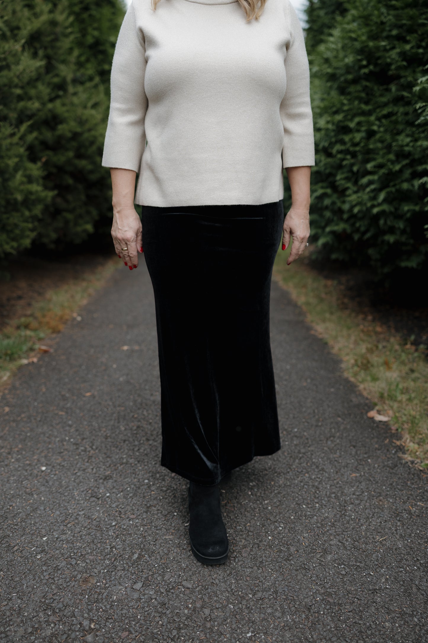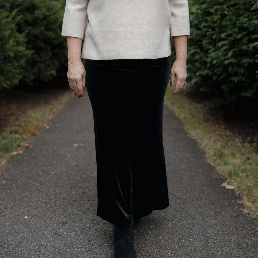 Slip into a cozy velvet maxi skirt that effortlessly pulls on for a comfy, chic look.