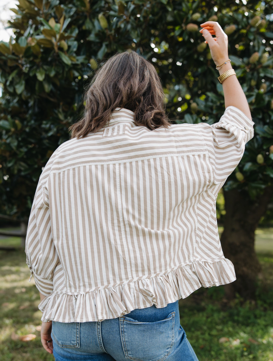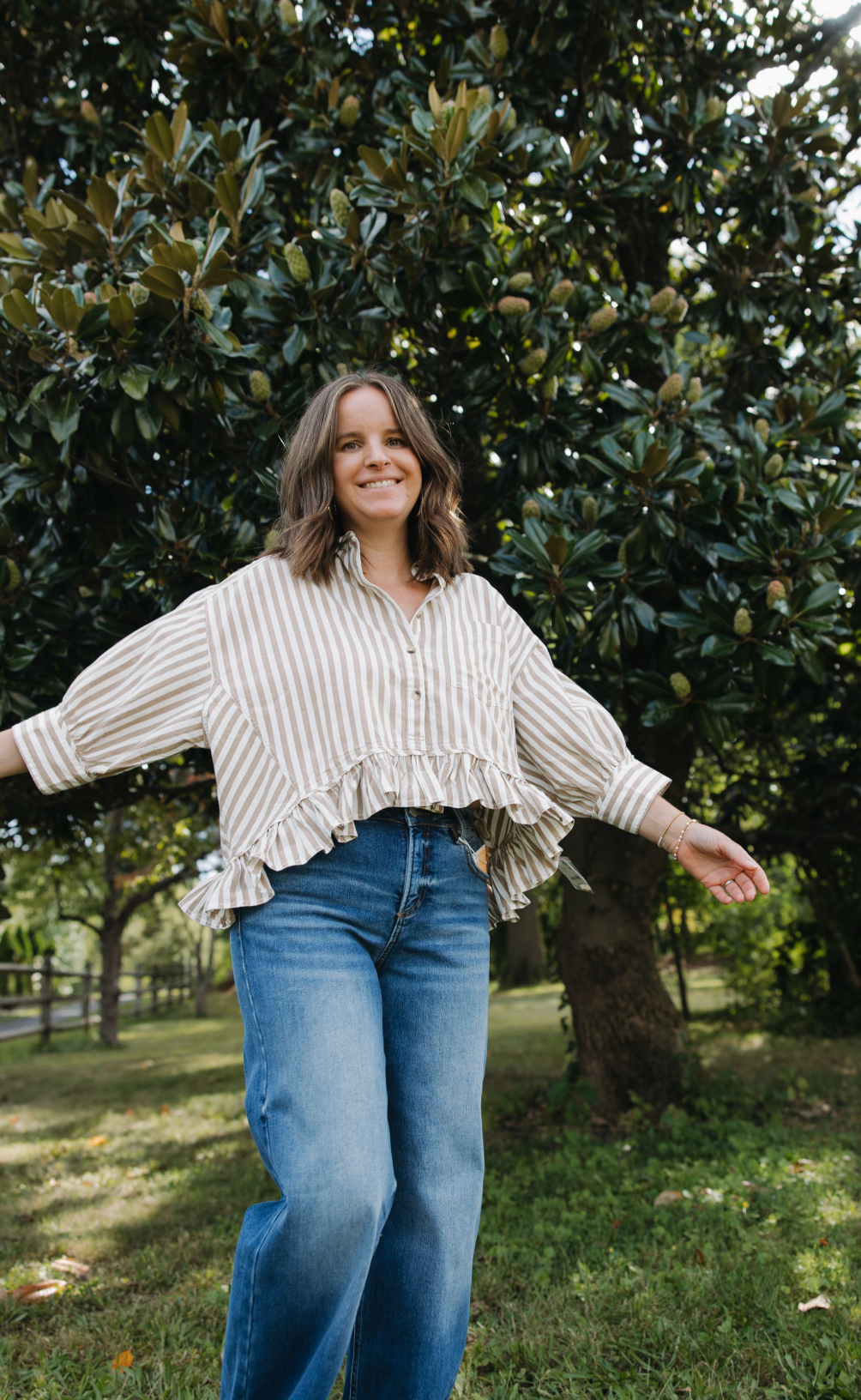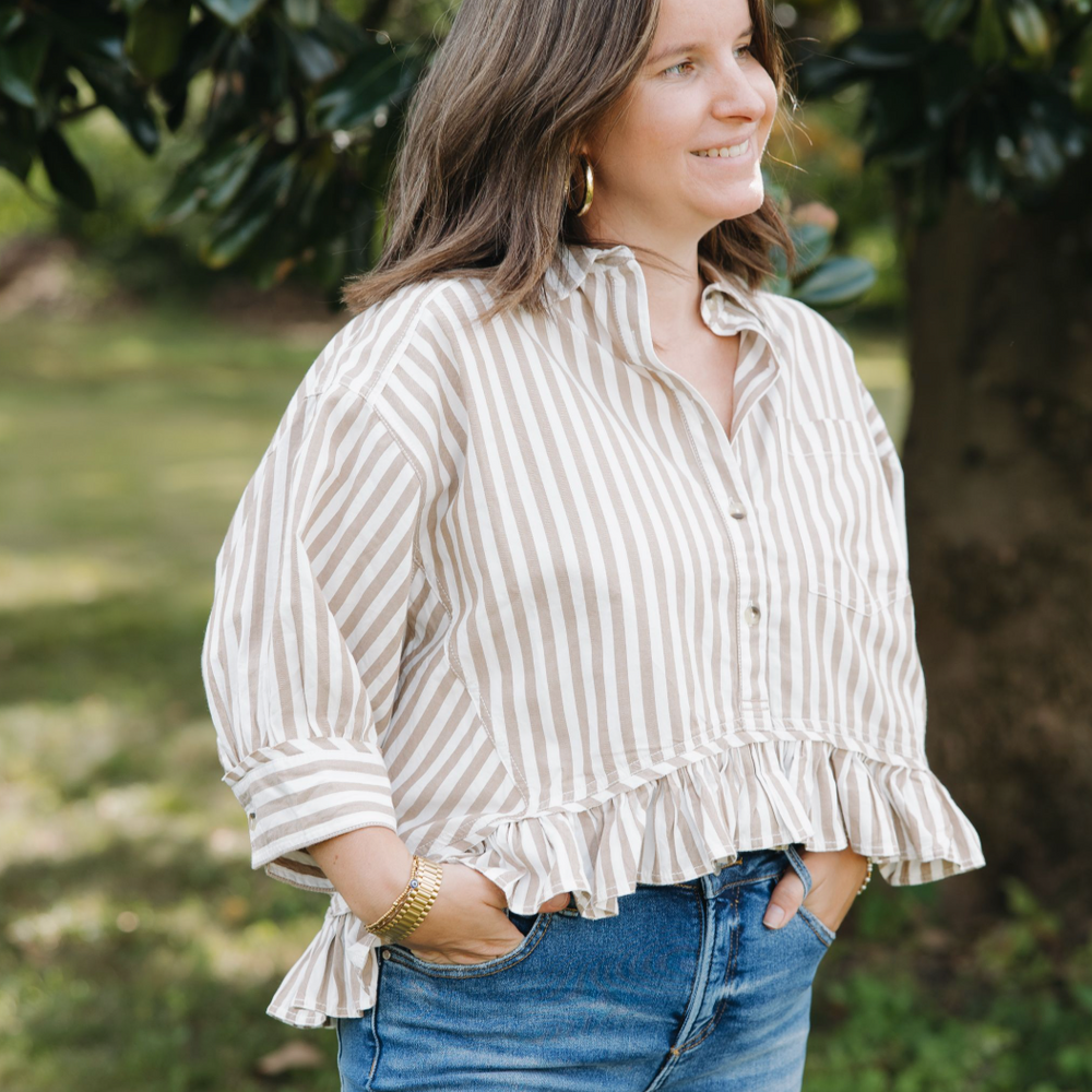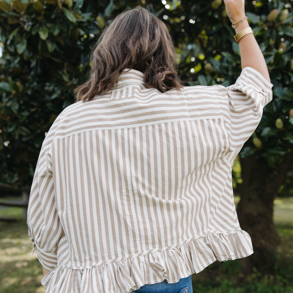 This playful Bailey Stripe Shirt features a neutral color mix, a classic collared neckline, and charming ruffled details on the sleeves and hem. Designed with short sleeves for a breezy, fun look.