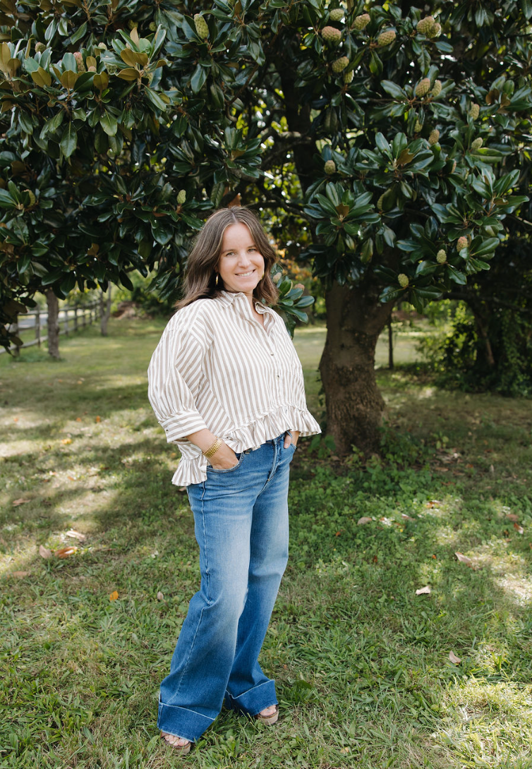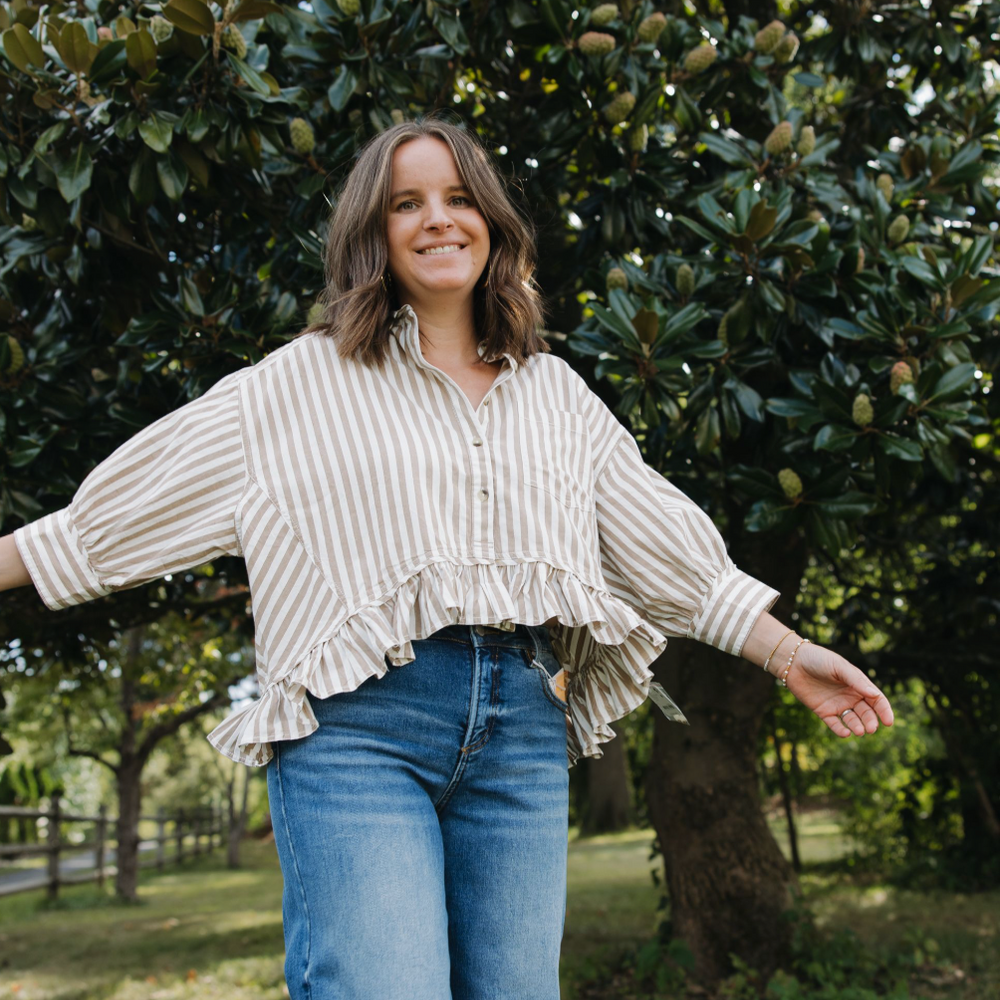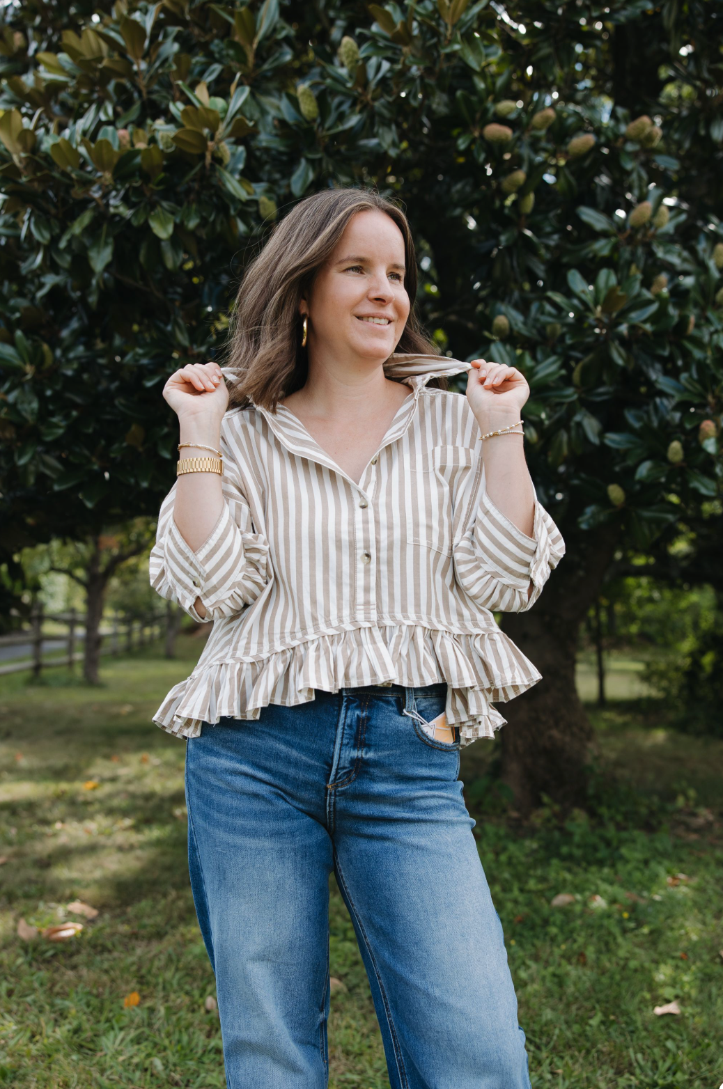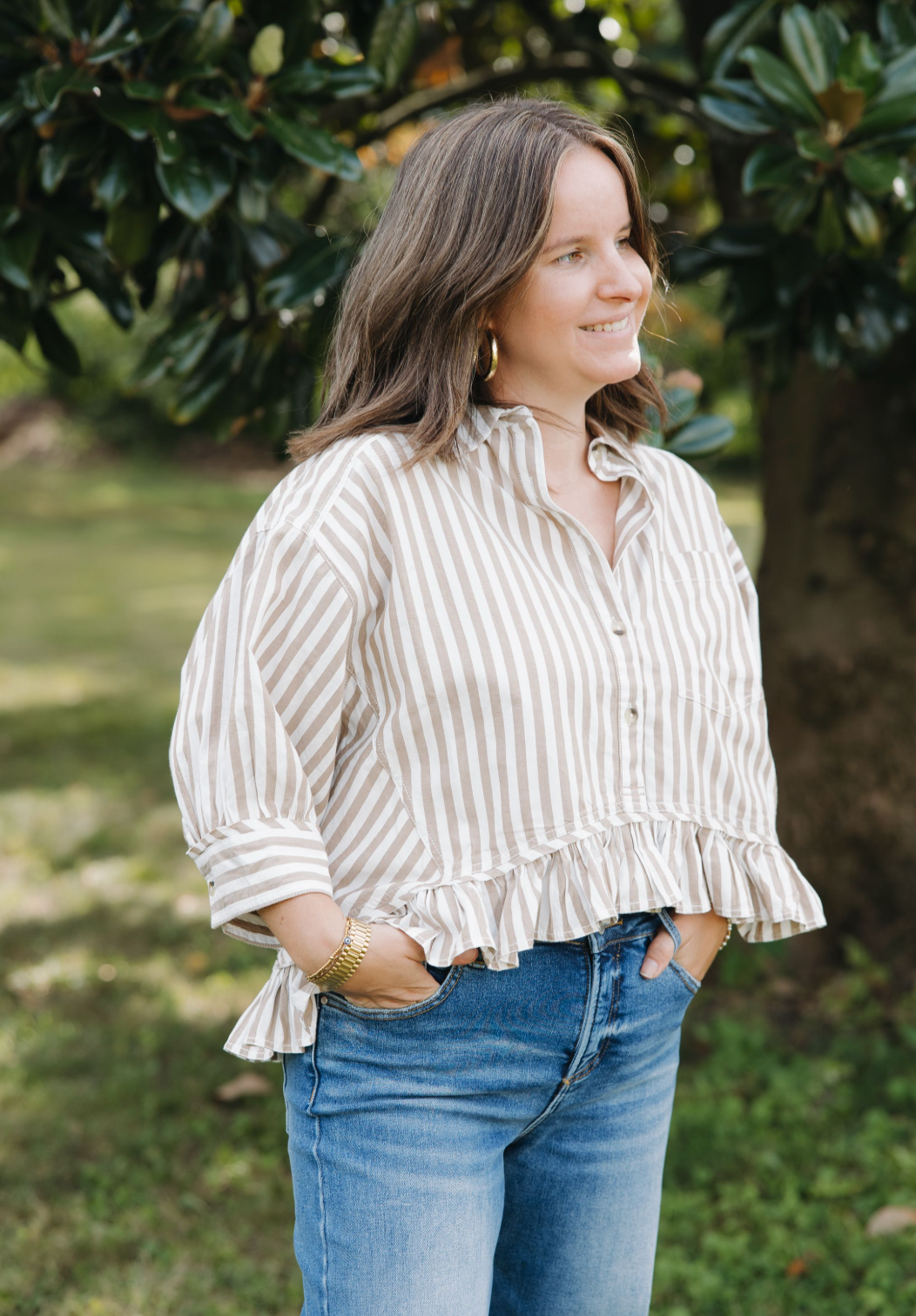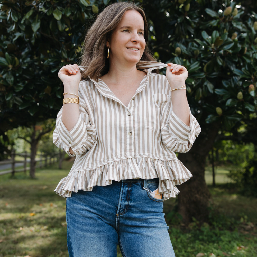 This playful Bailey Stripe Shirt features a neutral color mix, a classic collared neckline, and charming ruffled details on the sleeves and hem. Designed with short sleeves for a breezy, fun look.