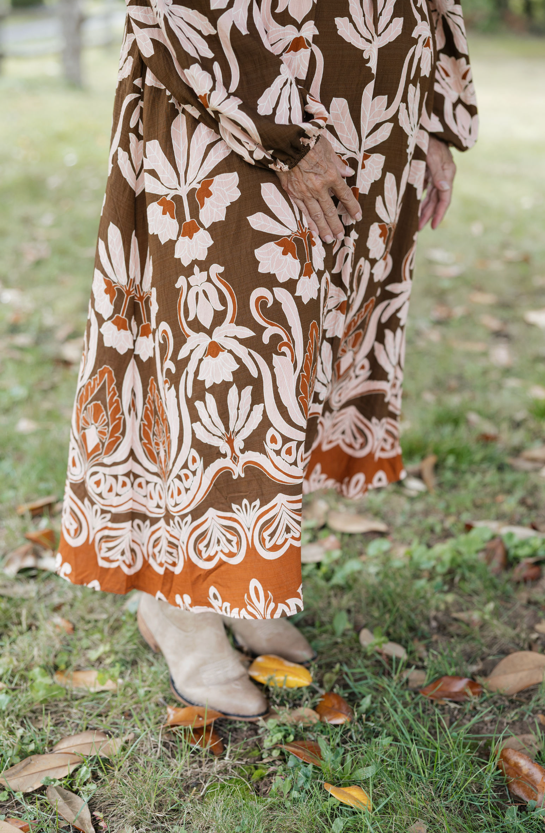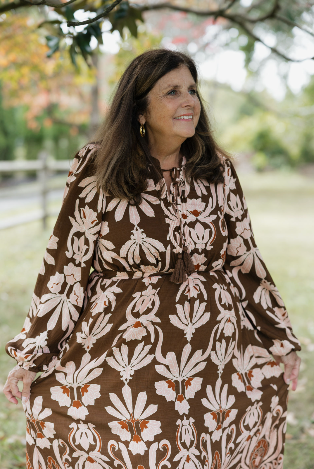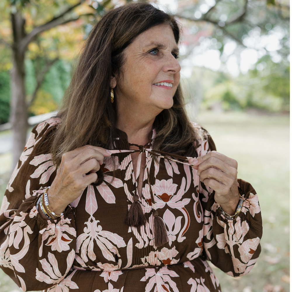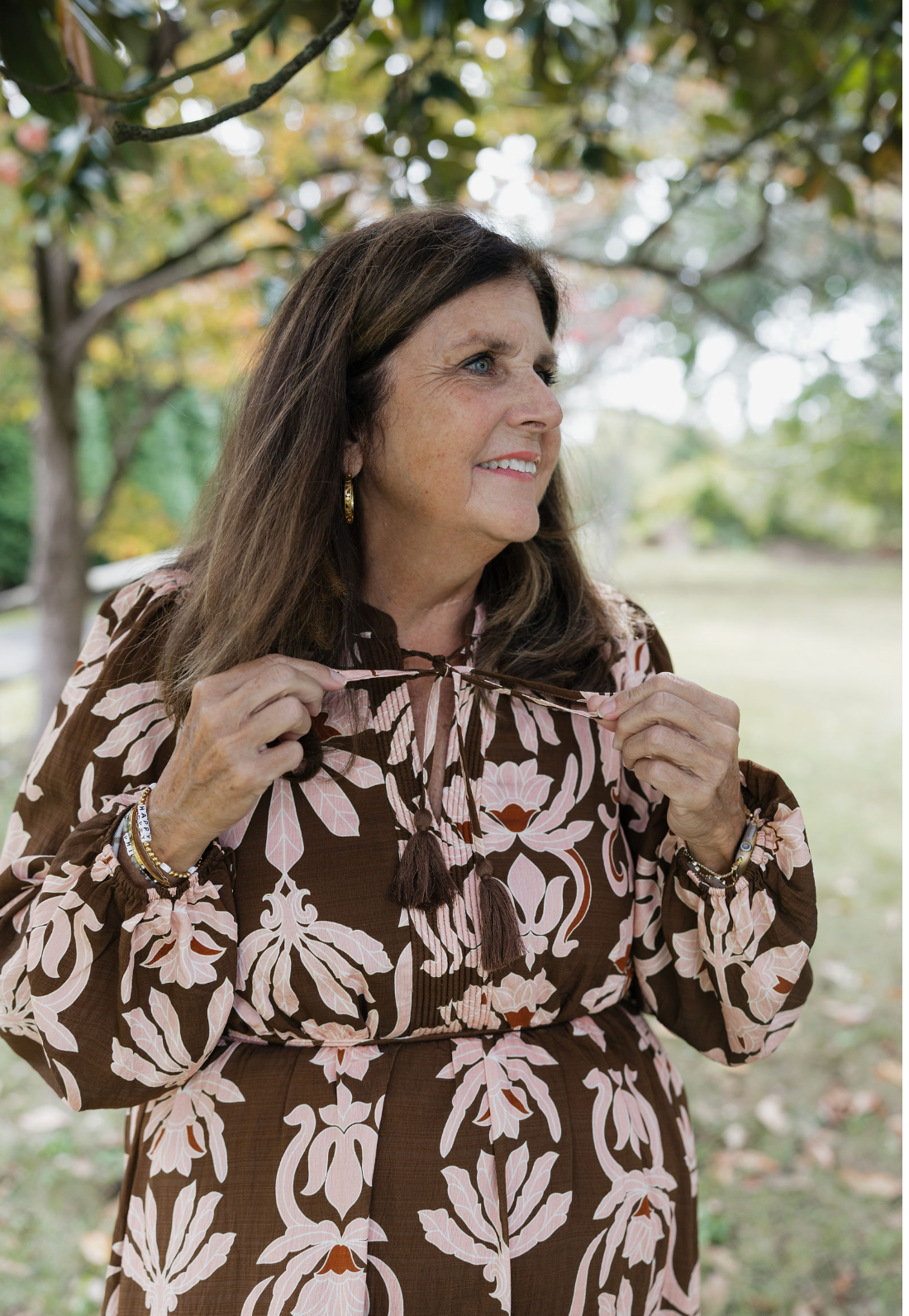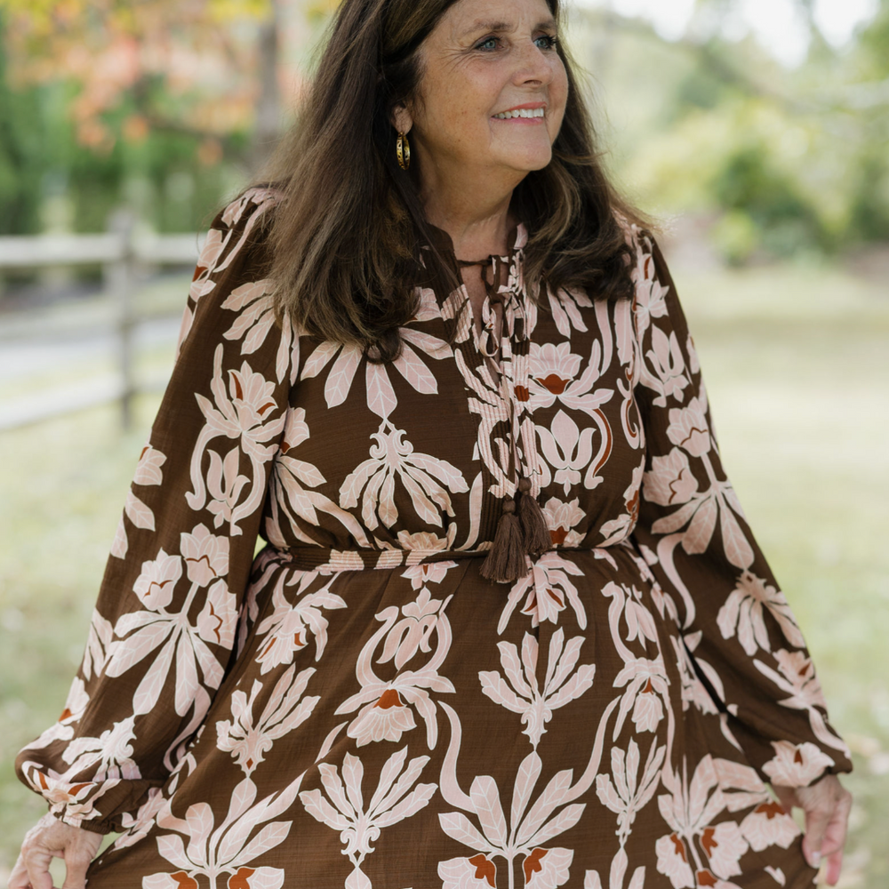 This midi dress features a charming floral print and a round neckline with a playful notched V and tassel ties. Delicate piping accents the neckline and waist, while long puff sleeves end in comfy elastic cuffs. Gathered puff shoulders add extra fun, and the back has a smocked elastic for a perfect fit. Fully lined for comfort and style.