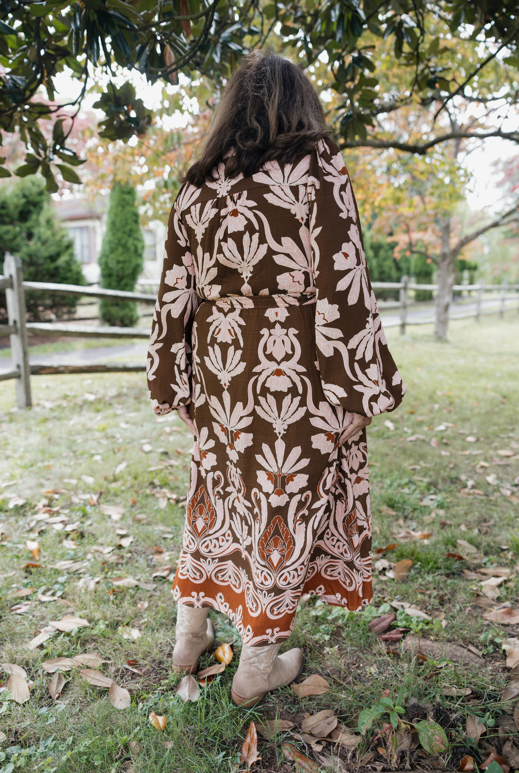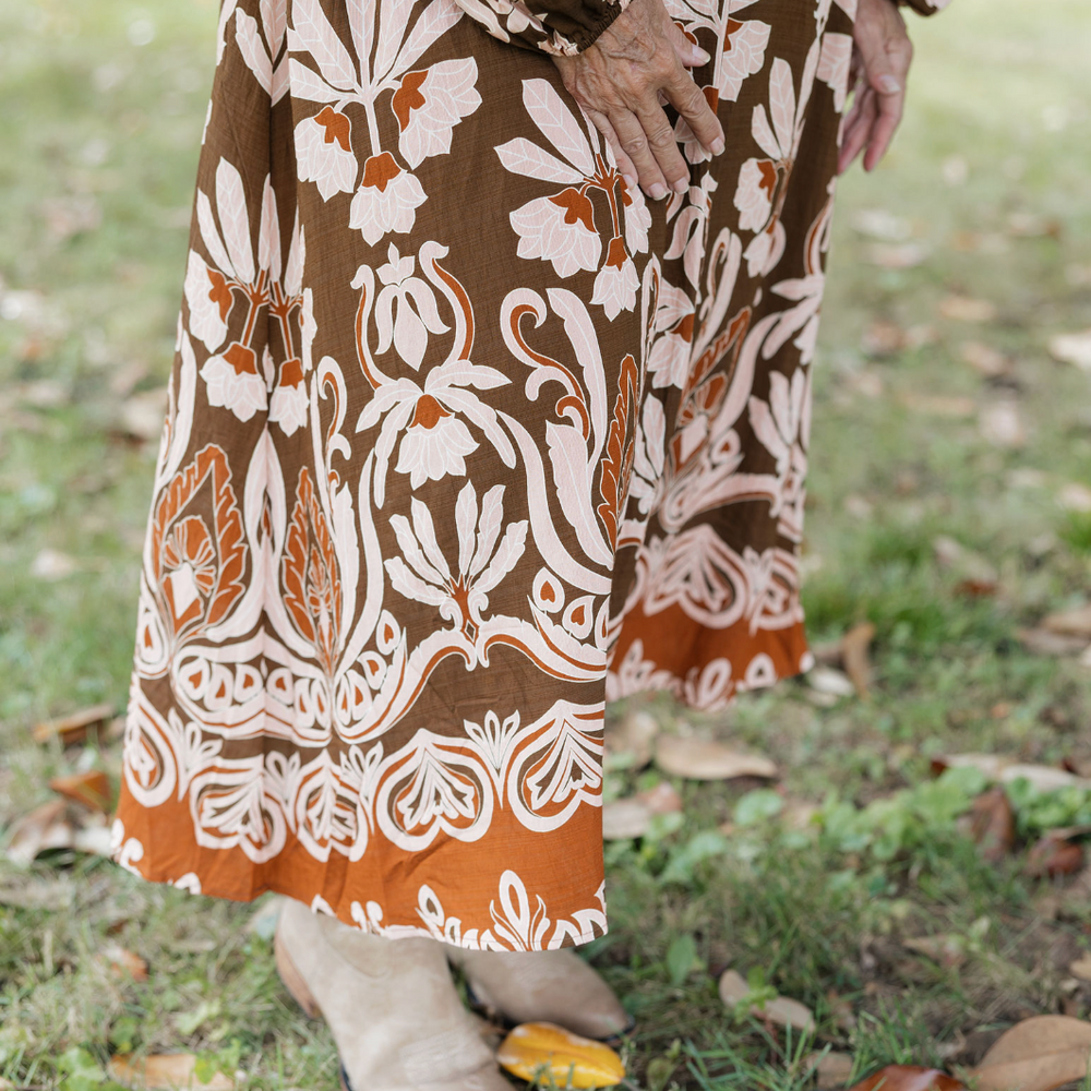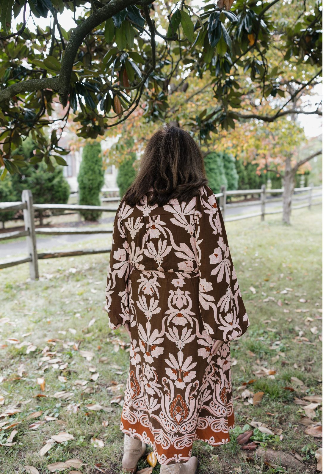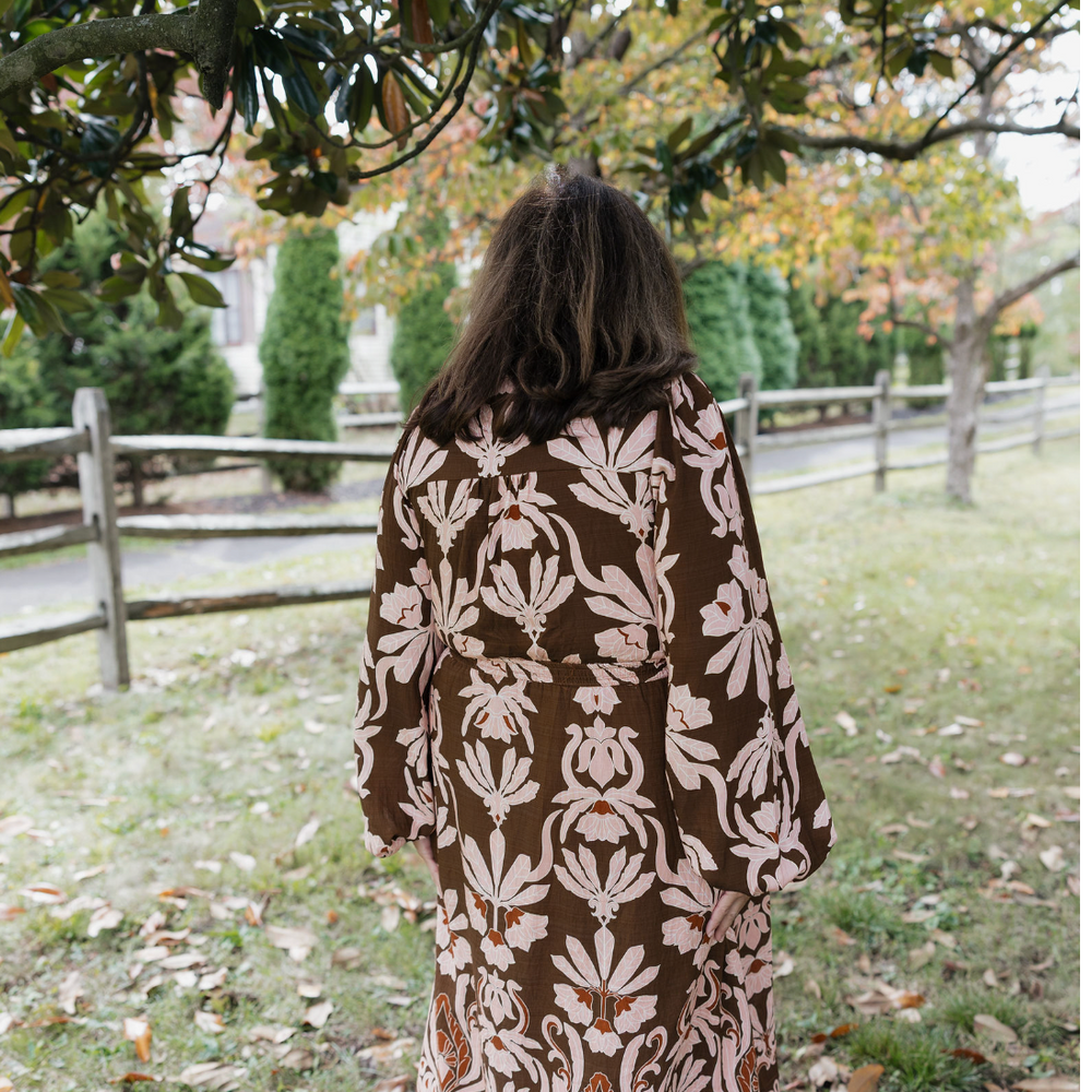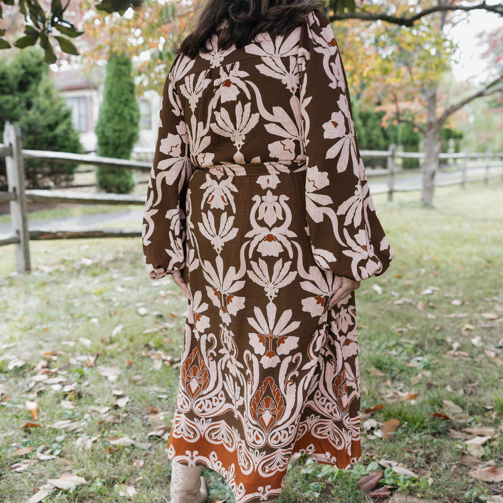 This midi dress features a charming floral print and a round neckline with a playful notched V and tassel ties. Delicate piping accents the neckline and waist, while long puff sleeves end in comfy elastic cuffs. Gathered puff shoulders add extra fun, and the back has a smocked elastic for a perfect fit. Fully lined for comfort and style.