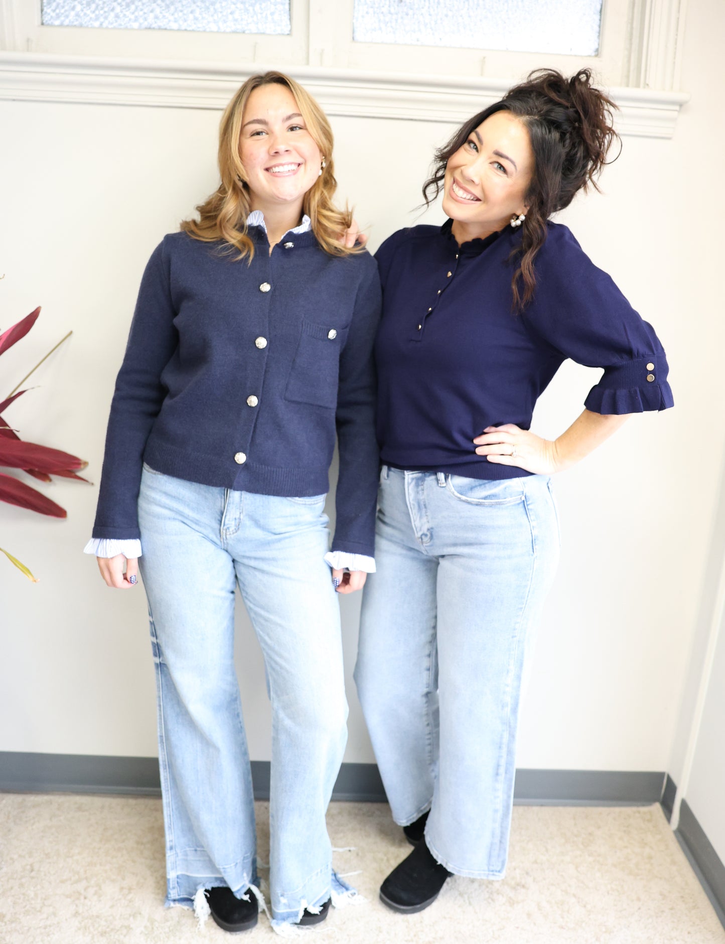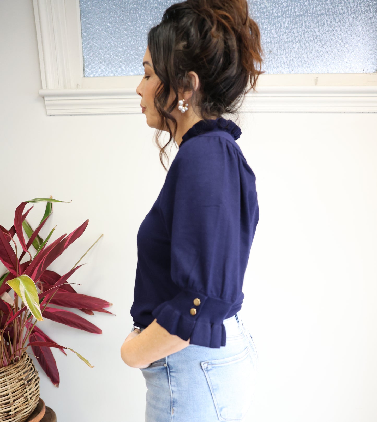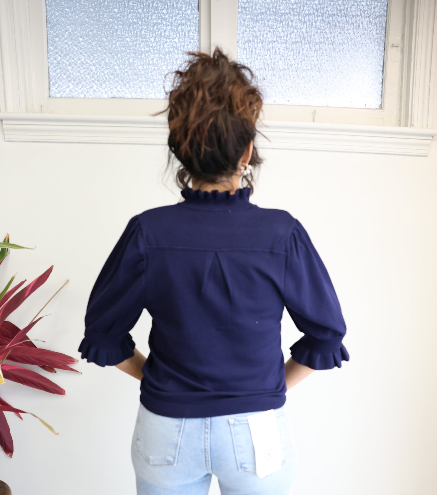 This playful top features elbow-length flutter sleeves paired with stylish shoulder pads for a fun, flirty flair.