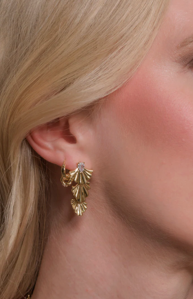 Catch the light with our Drew Drop Fan Earring. Inspired by the beauty of ginkgo leaves, these gold filled cubic zirconia drop earrings are sure to become a cherished addition to any jewelry collection.